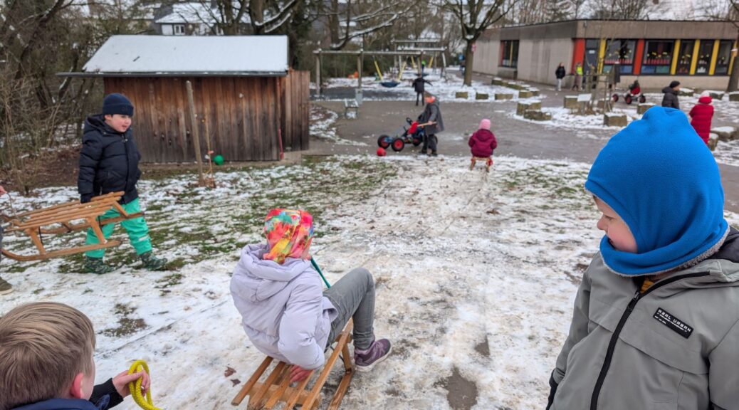 Die Freude über den ersten Schnee im neuen Jahr war groß. Leider reichte es anfangs kaum zum Schlittenfahren. Aber die Schüler und Schülerinnen hatte eine super Idee: Mit vereinten Kräften schoben sie vom ganzen Schulhof den Schnee zu unserem kleinen Hügel zusammen und so konnten sie am Ende wirklich mit dem Schlitten runter sausen.Ein super Gemeinschafts – Projekt. Text und Fotos: A. Menke