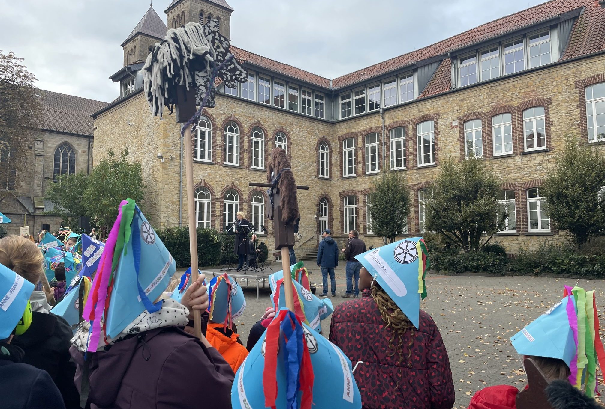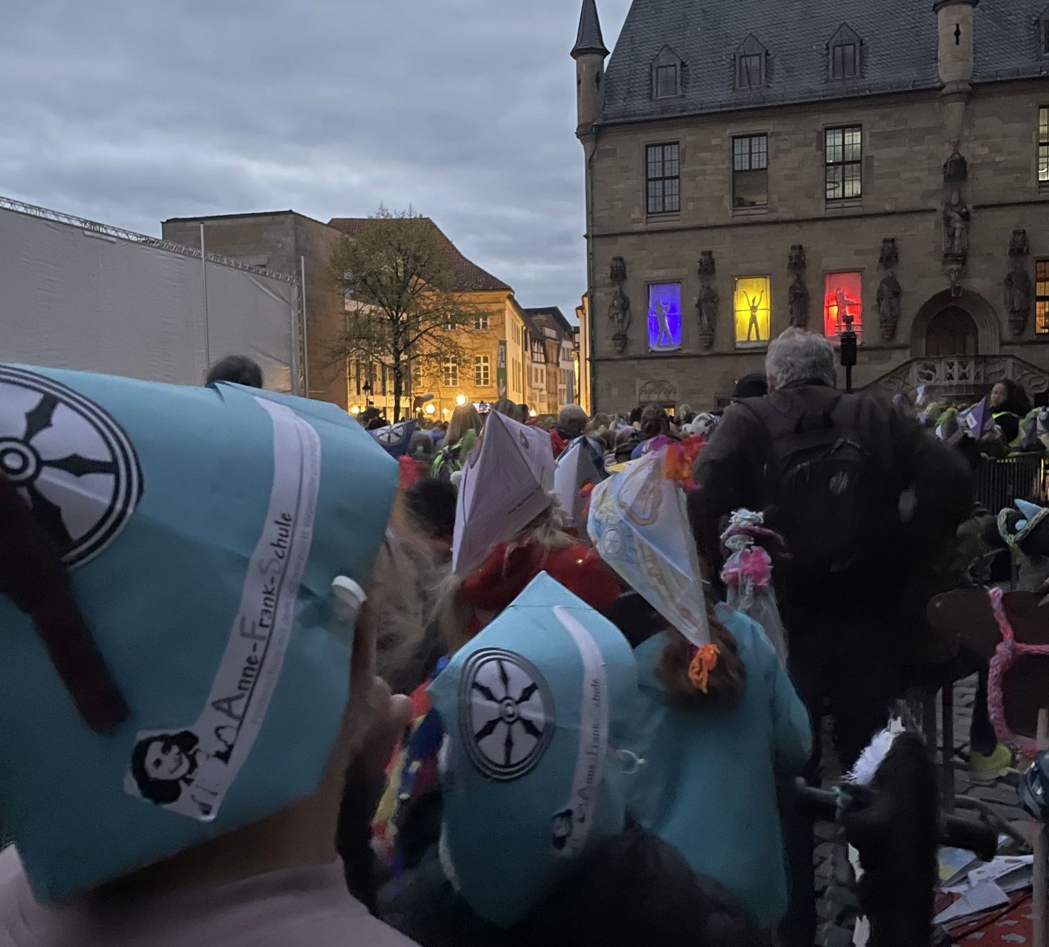 Auf dem Schulhof der Domschule trafen sich alle Viertklässler und Viertklässlerinnen aus Osnabrück und gemeinsam ging es durch die Fußgängerzone bis zum Rathaus.