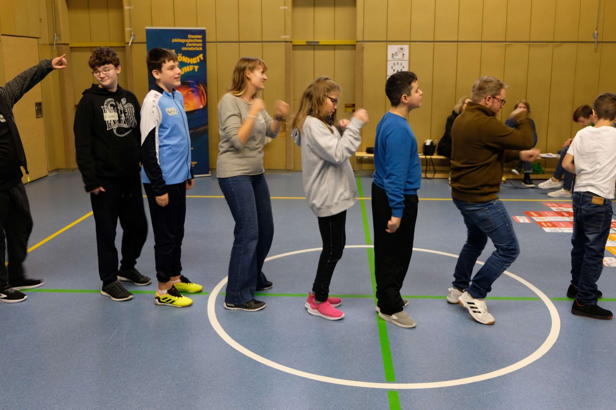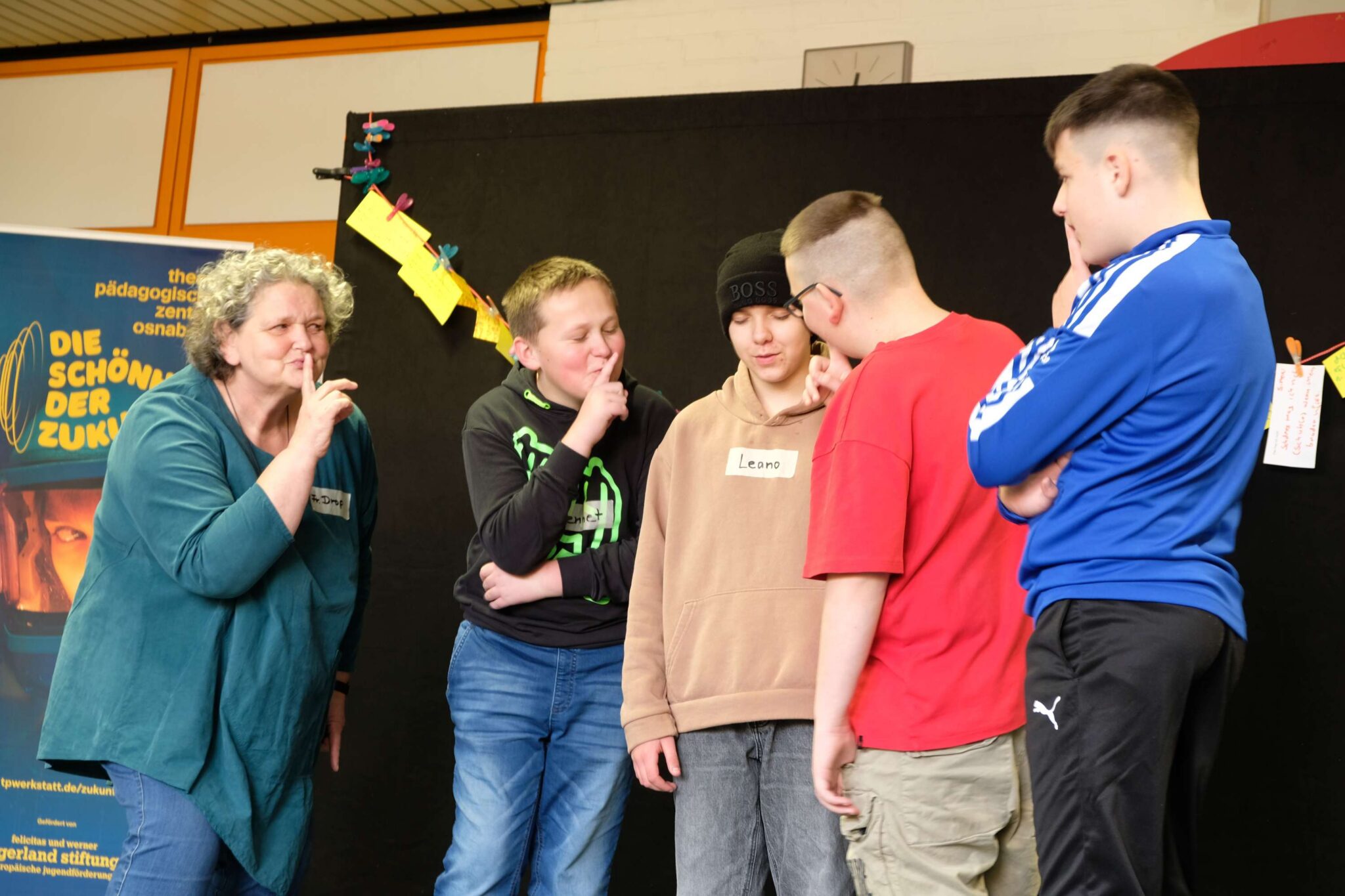 Auch den Klassen Stein, Kreutzmann, Tillner, Koopmann, Pieper, Schmid, Jahrmann, Thies, Sawhney und der MFZ-Bewegung danken wir für die Möglichkeit die Turn-/Therapiehalle an den vier Vormittagen nutzen zu dürfen. Durch die Flexibilität und das Engagement aller oben genannten Beteiligten und den beiden Klassenteams haben die Schülerinnen und Schüler ein tolles zukunftorientiertes Theaterprojekt erlebt.
