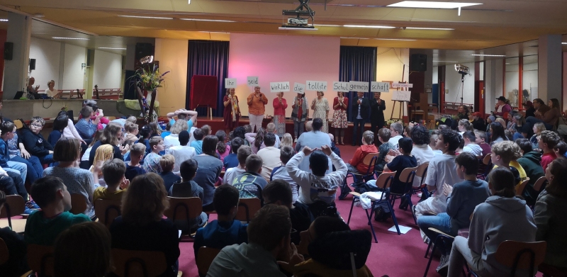In der Woche vor den Sommerferien hat sich die gesamte Schulgemeinschaft von unseren Konrektoren Ulf Baganz und Ralf Odenthal sowie von sechs Förderschullehrerinnen verabschieden müssen. Anne Kuhlemann, Ulli Kemper, Ele Kuhlhüser, Regina Hardemann, Ursula Höltermann und Sabine Teske-Lohmeier sowie die beiden Konrektoren haben das Schulleben der Anne Frank Schule viele viele Jahr(-zehnte) bereichert, vorangebracht und mit ihren vielen grandiosen Ideen und ihrem Einsatz gestaltet und geprägt. Das Kollegium und die Schülerinnen und Schüler feierten den Abschied mit einem großen Schulgemeinschaftstreffen, viel Musik, Tanz und tosendem Applaus. Und die angehenden Pensionäre und Pensionärinnen bedankten sich mit einem Eiswagen, der für jeden ein Eis dabei hatte.