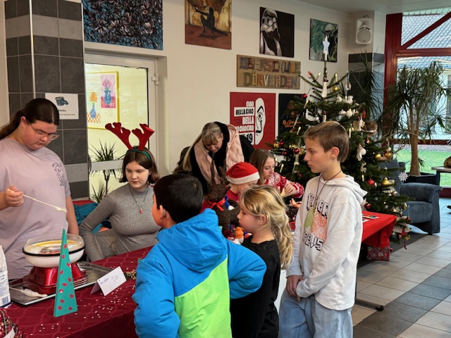 An liebevoll gestalteten Ständen präsentierten die Klassen ihre Bastelarbeiten und sorgten für eine festliche Atmosphäre. Für das leibliche Wohl gab es Kaffee, Kuchen und Bratwurst sowie andere Leckereien. Ein besonderes Highlight war der „lebendige Adventskalender“, der viele neugierige Gäste anzog. Eltern, Schülerschaft, Lehrkräfte und Ehemalige verbrachten gemeinsam schöne und stimmungsvolle Stunden.