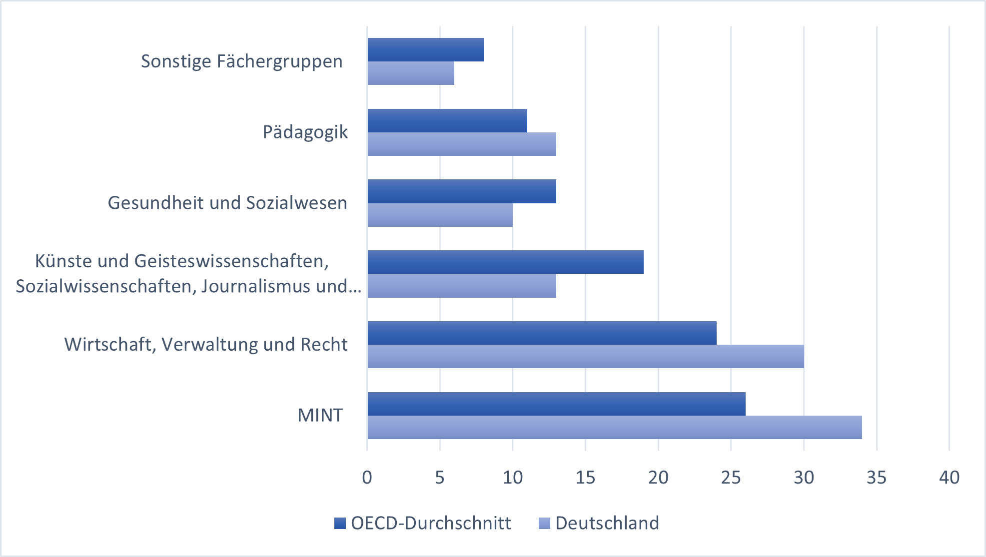 Dabei haben Lernende in allen Ländern weiterhin sehr ungleiche Chancen für einen Abschluss im tertiären Bereich. Die Erreichbarkeit eines höheren Abschlusses steht in enger Beziehung zum Bildungsstand der Eltern. Im OECD-Durchschnitt erreichen nur 26 % der jungen Erwachsenen mit Eltern ohne Abschluss im Sekundarbereich II einen Abschluss im Tertiärbereich. In Deutschland sind es sogar nur 20 %. In einigen Ländern liegt der Anteil aber deutlich höher. So erreichen in Dänemark mittlerweile 49 % dieser benachteiligten jungen Erwachsenen einen Abschluss im Tertiärbereich, ein Anstieg um 20 Prozentpunkte seit 2012. Deutschland ist insbesondere im Bereich der MINT-Fächer durchaus gut aufgestellt. Bezogen auf die Erwachsenen mit Abschluss im Tertiärbereich hat Deutschland den höchsten Anteil an Erwachsenen mit Abschluss in einem MINT-Fach. In Deutschland entfallen 34 % der tertiären Abschlüsse auf ein MINT-Fach, im OECD-Durchschnitt sind es nur 26 %.
