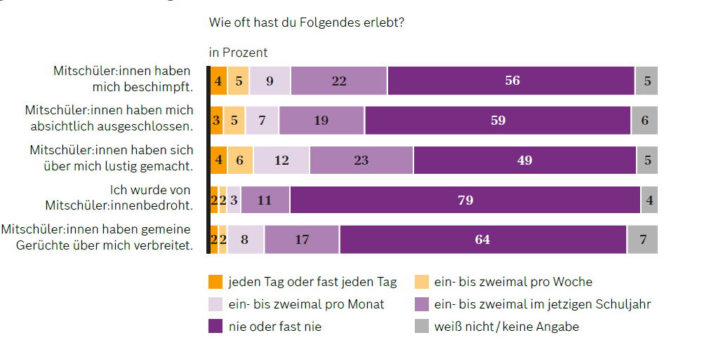 Bei den befragten 11- bis 17-Jährigen wurden fünf Formen negativer sozialer Verhaltensweisen erfasst; als Mobbing gilt das mindestens monatliche Auftreten mindestens einer Form. Insgesamt berichten 30 % der Jugendlichen im aktuellen Schuljahr von Mobbing. Von ihnen erleben pro Monat 32 % eine, 27 % zwei, 16 % drei und 25 % vier oder fünf Erscheinungsformen. Die höchste Prävalenz zeigt sich mit 14 Jahren (über 38 %) und nimmt danach mit steigendem Alter ab. Mobbing findet überwiegend offline statt (51–57 % ausschließlich), 33–34 % erleben eine Kombination aus Offline- und Online-Kanälen. Nur beim Verbreiten von Gerüchten ist Cybermobbing mit 25 % der häufigste reine Online-Kanal. Insgesamt erfahren 29 % mindestens eine Form Offline-Mobbings, 17 % mindestens eine Form von Cybermobbing. Jugendliche mit psychischen Auffälligkeiten sind deutlich häufiger mehrfach betroffen. Ähnlich zeigen sich Unterschiede beim schulischen Wohlbefinden und beim Zugehörigkeitsgefühl; Kausalitäten lassen sich aus der Studie nicht ableiten.