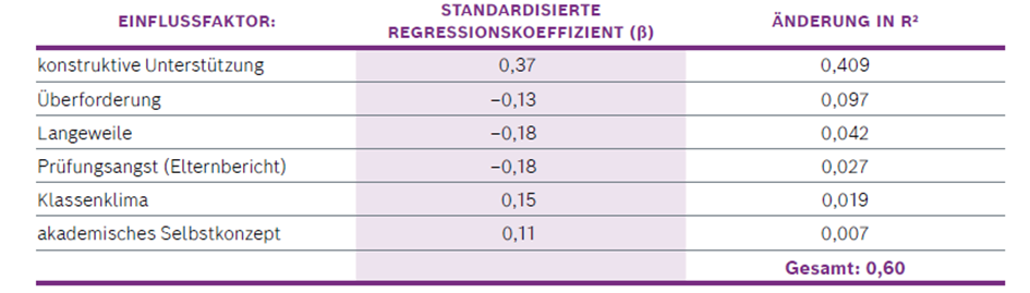 In Bezug auf den Themenkomplex Schulisches Wohlbefinden kann von einer insgesamt mittleren Schulzufriedenheit ausgegangen werden (75 % der Jugendlichen). 8 % empfinden ein hohes schulisches Wohlbefinden; doppelt so viele jedoch ein geringes. Dabei sind keine signifikanten Abhängigkeiten zur Schulform zu erkennen. Kinder aus finanziell sehr belasteten Familien (29 %) und Kinder mit psychischen Auffälligkeiten (43 %) fühlen sich besonders häufig unwohl in Schule. Zur Erfassung der Unterrichtsqualität wurden die drei Basisdimensionen konstruktive Unterstützung, kognitive Aktivierung und Klassenführung sowie das Klassenklima herangezogen. Es zeigen sich insgesamt stabile Einschätzungen über beide Befragungswellen hinweg. Eine Regressionsanalyse zeigt, dass sechs Merkmale gemeinsam rund 60 % der Varianz im schulischen Wohlbefinden erklären (Vgl. Tabelle 1). Der Bericht betont ausdrücklich, dass nur einige Faktoren im Gesamtmodell eigenständig bedeutsam bleiben. Den stärksten positiven Effekt hat die konstruktive Unterstützung durch Lehrkräfte, gefolgt von Langeweile (negativer Zusammenhang), Prüfungsangst aus Elternsicht (negativer Zusammenhang), Überforderung (negativer Zusammenhang), positives Klassenklima und akademischem Selbstkonzept. Kognitive Aktivierung, Klassenführung und Leistungsdruck leisten im Gesamtmodell keinen eigenständigen Erklärungsbeitrag zum schulischen Wohlbefinden mehr. Hinsichtlich Überforderung und Langeweile zeigen die Daten, dass etwa zwei Drittel der Schülerinnen und Schüler in mindestens einigen Unterrichtsstunden Überforderung erleben, während etwa ein Drittel keinerlei Überforderung angibt. Rund 35–37 % der Befragten stimmen Aussagen zur Langeweile im Unterricht oder bei Hausaufgaben ziemlich oder genau zu – ein Befund, der mit zunehmendem Alter und beim Übergang zur weiterführenden Schule ausgeprägter wird.