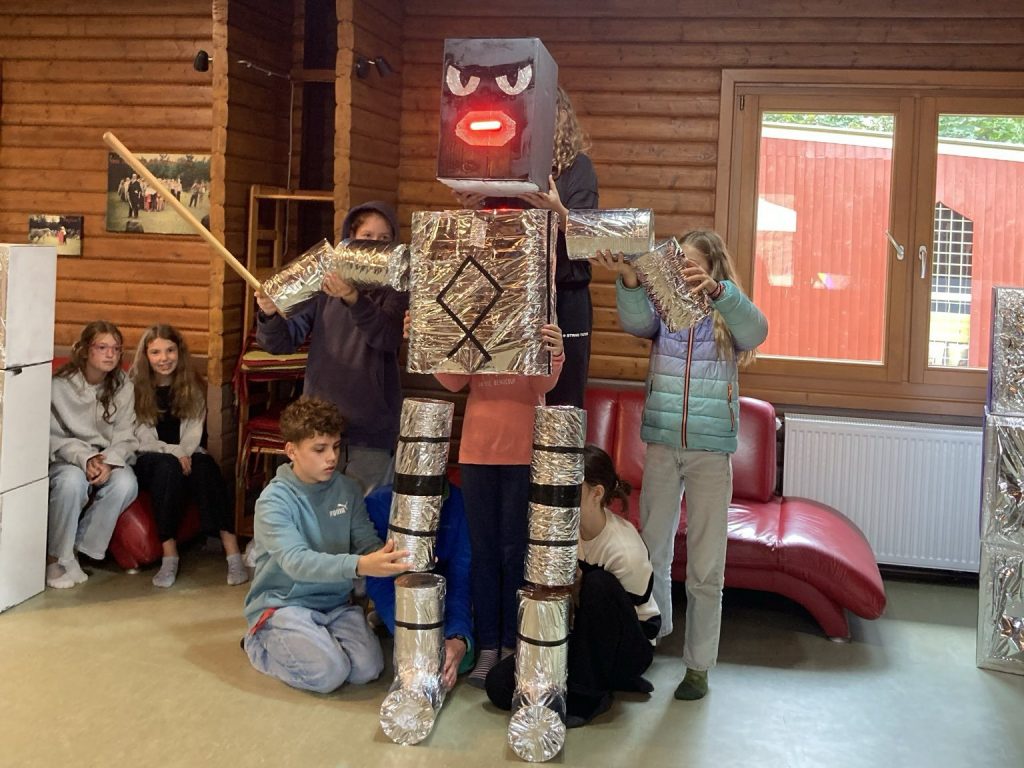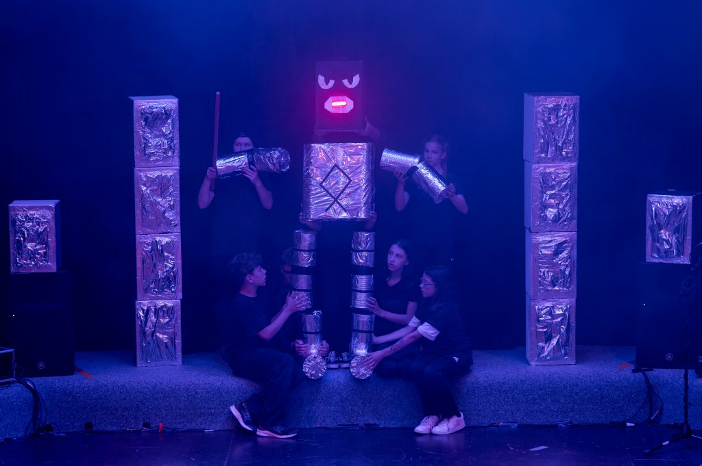 Die Gruppe Bühnenbild und Requisiten, die von Christian geleitet wurde, ist eigentlich selbsterklärend. Sie haben aus sehr vielen Kartons einen ganz eigenen, comic-artigen Bühnenbildstil entworfen, der die Grundlage für unser gesamtes Stück war. Sie haben viele unterschiedliche Requisiten hergestellt, z.B. Kaffeetassen für die Schauspieler*Innen, die die Lehrer und Lehrerinnen spielten.