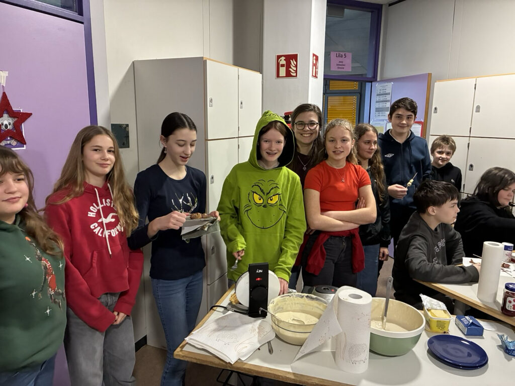 Dieses Jahr hat sich der Jahrgangsrat etwas besonderes ausgedacht: Es wurde entschieden, dass wir dieses Jahr einen kleinen Weihnachtsmarkt für uns machen. Dafür hat sich jede Stammgruppe auf eine Sache geeinigt was sie für einen „Stand“ machen. Es gab z. B.: Schokospieße, Waffeln, Kakao oder Kekse. Auch die Bläserklasse (Lila 6) konnte man mit „ All I want for Christmas is you“ hören. Schön war es!
