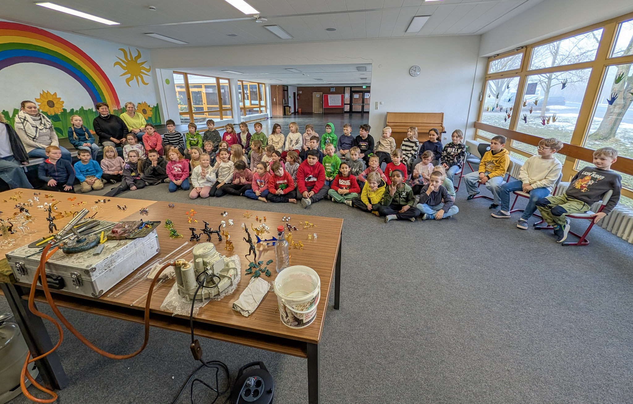 Durch eine spontane Gelegenheit hatten wir heute Besuch von einem Glasbläser. Herr Sommer stellte den Schülerinnen und Schülern sein Handwerk vor und zeigte anschaulich, wie aus erhitztem Glas verschiedene Formen entstehen. Herr Sommer ist in vielen Schulen bekannt und war vor vielen Jahren bereits zu Gast in der Grundschule Hoheneggelsen.