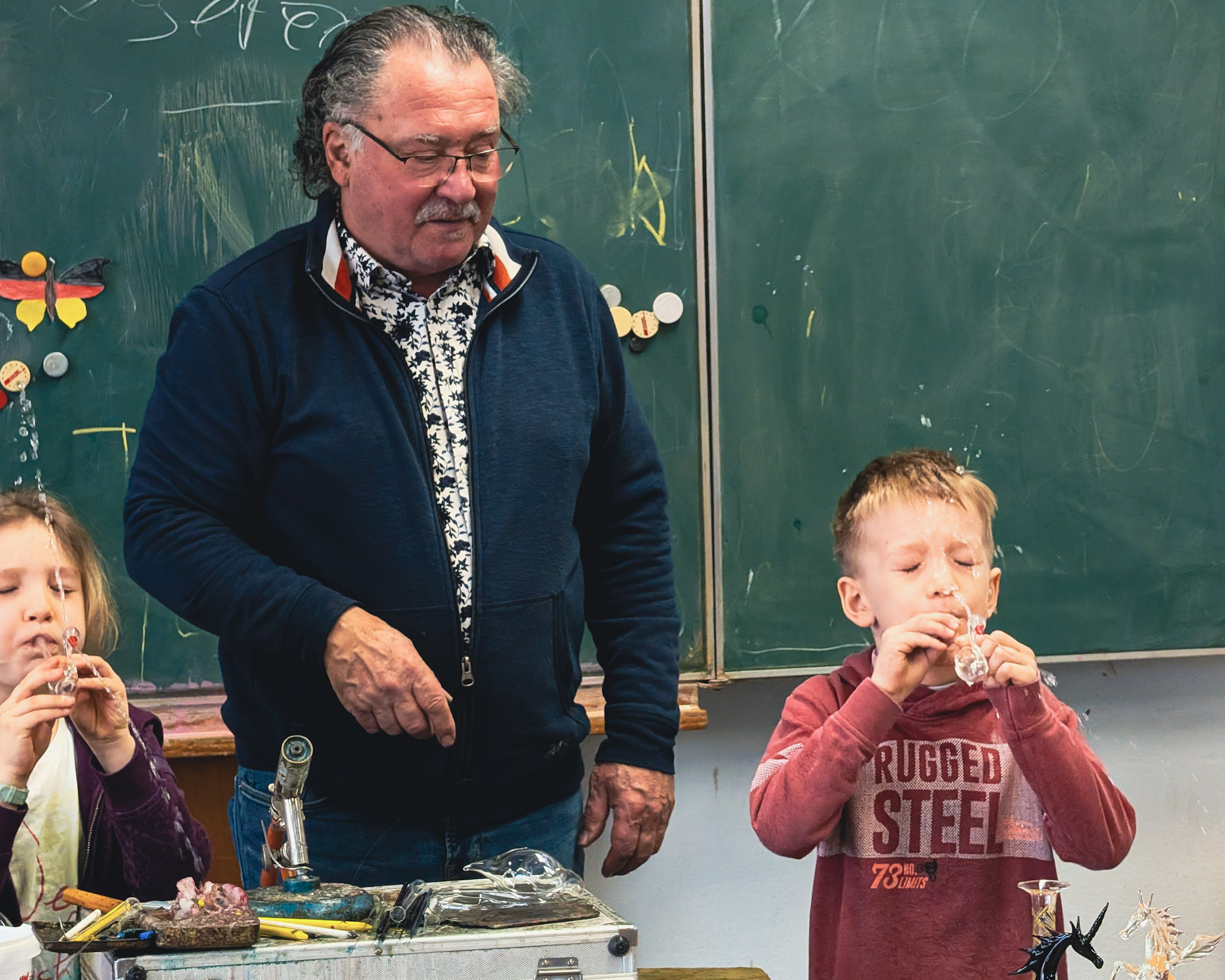 Heute konnten die Kinder beobachten, wie viel Ruhe, Übung und Technik in diesem traditionellen Beruf stecken. Neben den handwerklichen Arbeitsschritten sorgten auch einige Vorführungen für Aufmerksamkeit. Besonders der „Lungentester“ brachte viele zum Lachen. Beim „Geist in der Flasche“ wurde es dagegen relativ still, weil alle genau wissen wollten, wie das funktioniert.