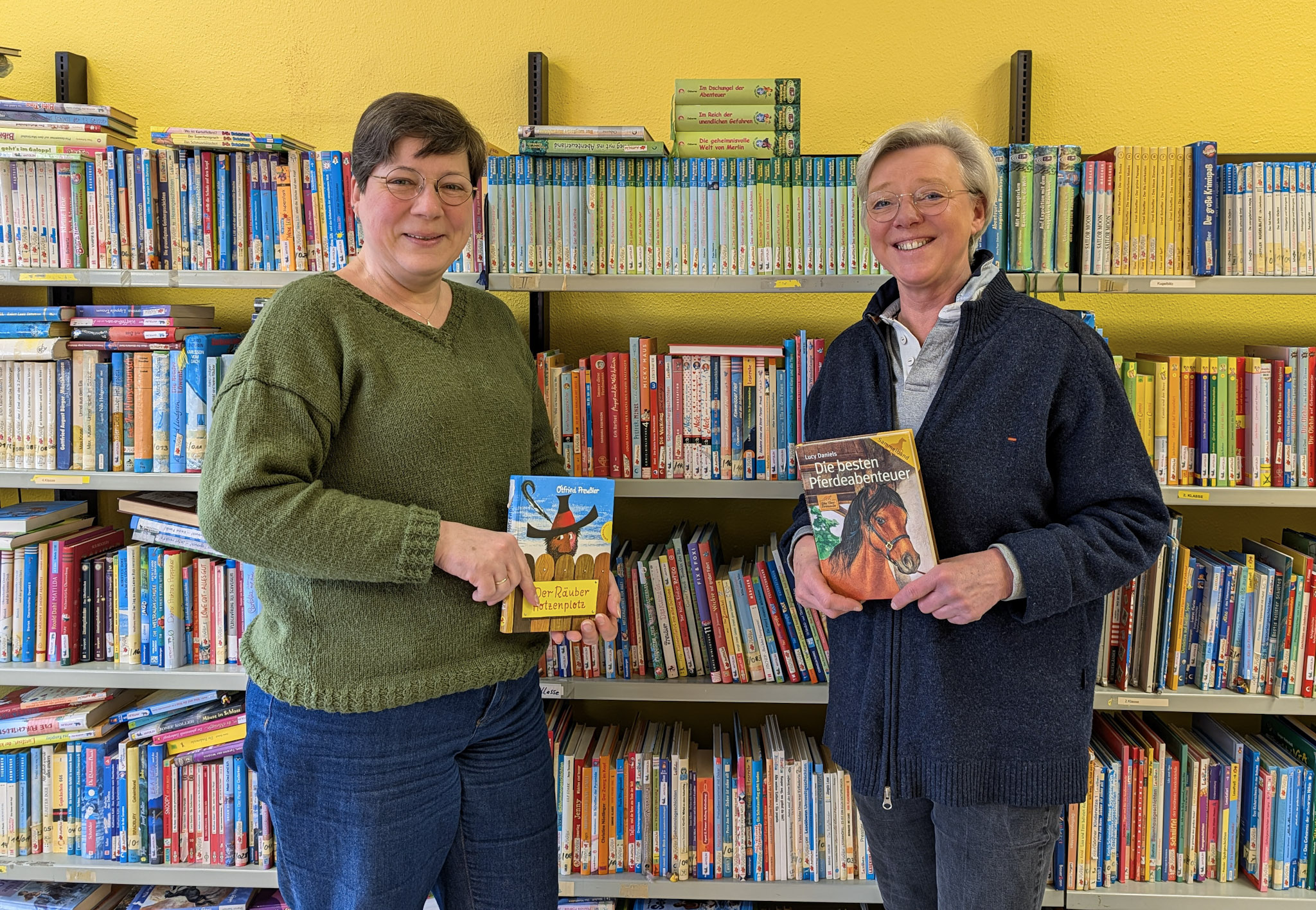 Frau Busse (r.), die noch im vergangenen Schuljahr eine sehr geschätzte Lehrerin im Kollegium der Grundschule Hoheneggelsen war, unterstützt seit einigen Wochen die Schulbücherei. Gemeinsam mit Frau Langkop und Frau Brieke (nicht im Bild) trägt sie engagiert zur Organisation und Betreuung der Bücherei bei.