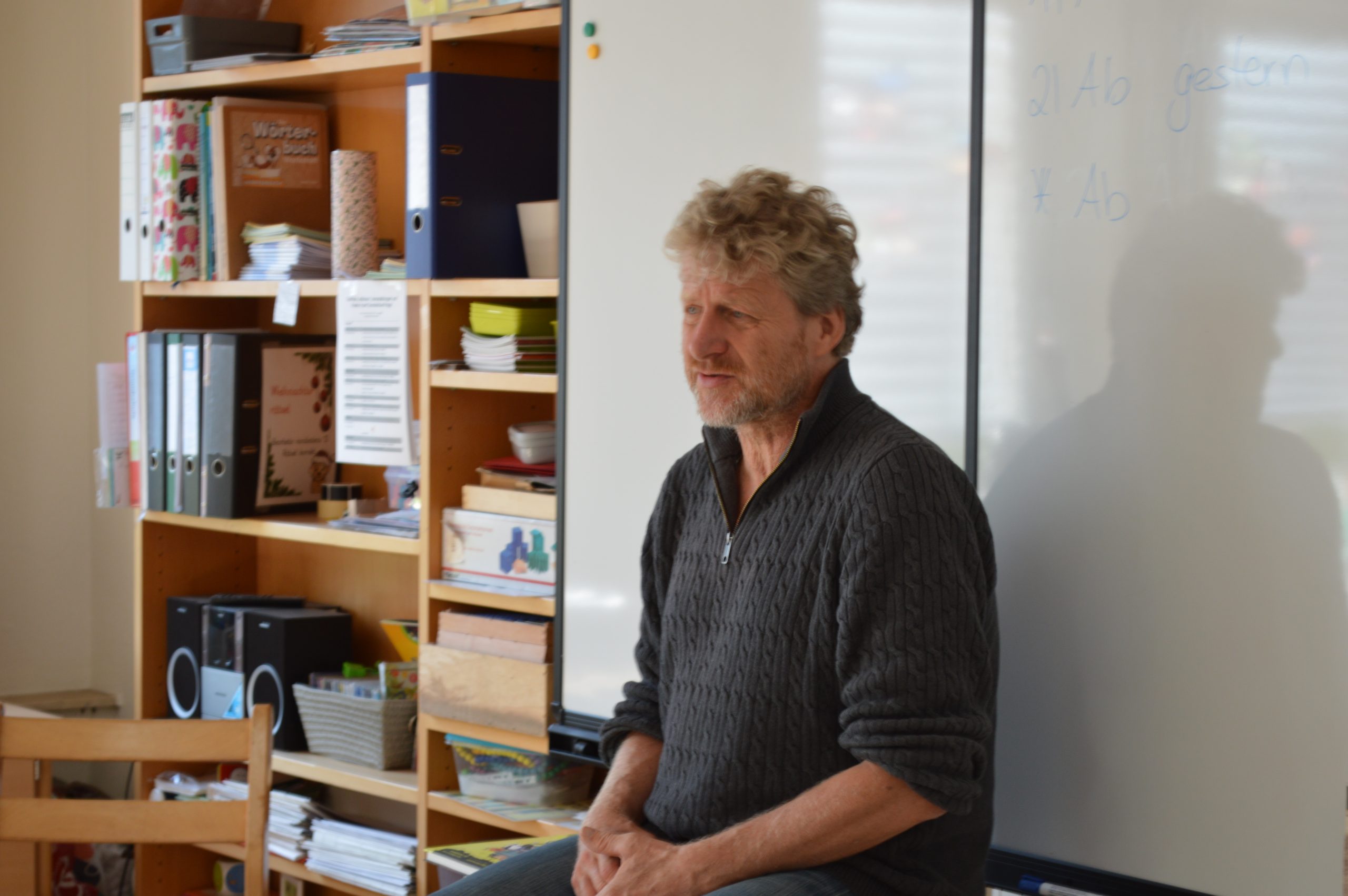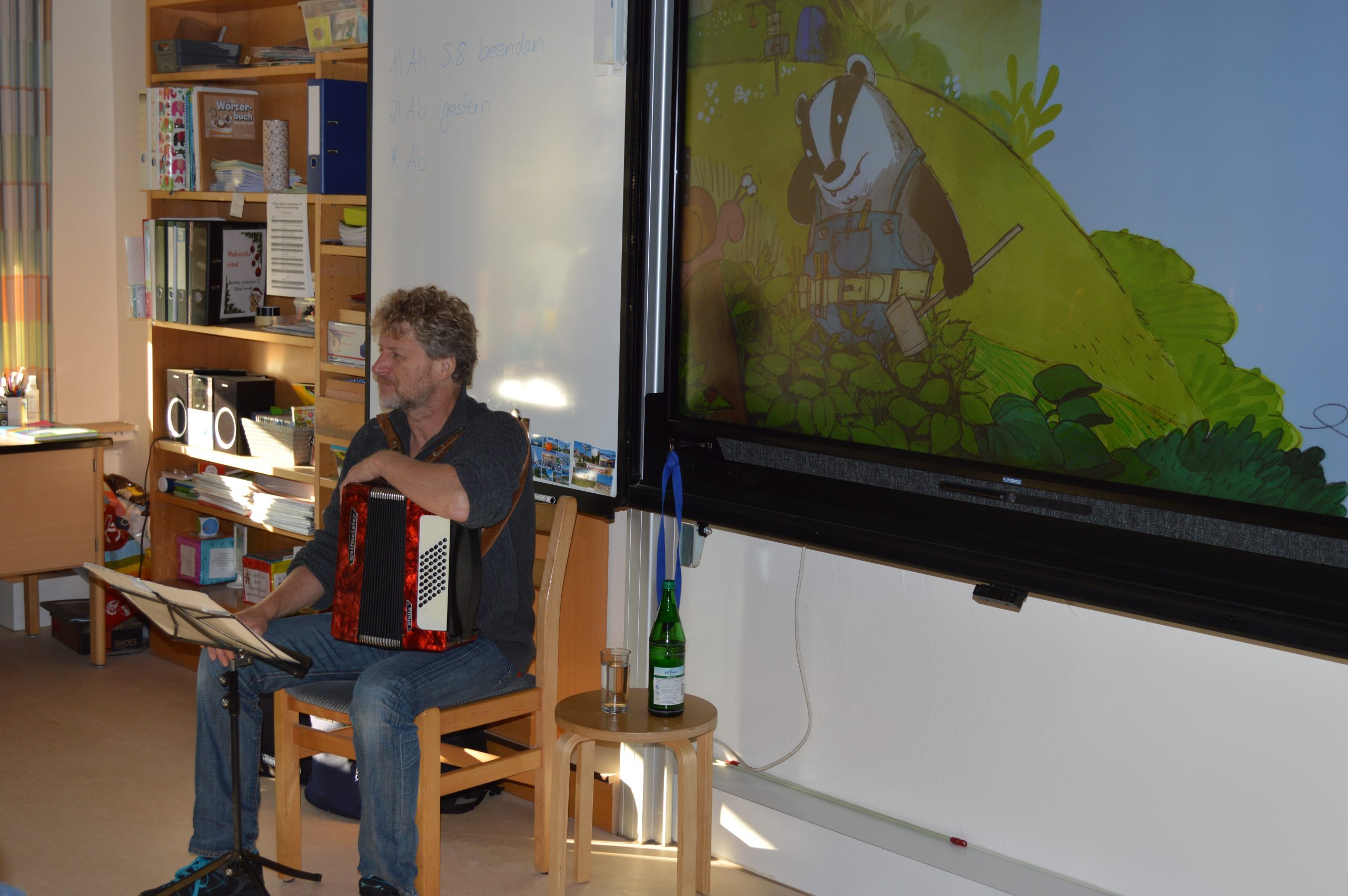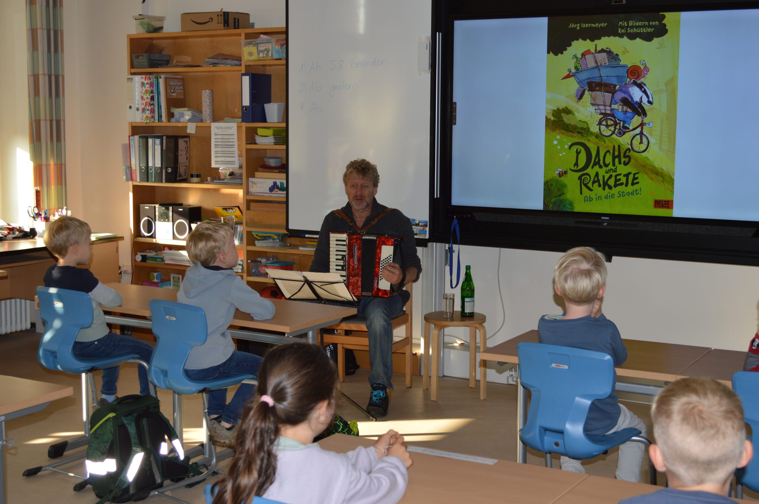 Im Jahrgang 1 und 2 las er aus „Dachs und Rakete – Ab in die Stadt“ vor. Sehr anschaulich mit verstellter Stimme und seinem Akkordeon als Begleitinstrument zog er die Kinder in seinen Bann. Es gab viel zu lachen und zu schmunzeln. Ein Kind fragte ihn, wie es denn sein kann, dass eine Schnecke „Rakete“ heißt. Die sei doch so langsam.