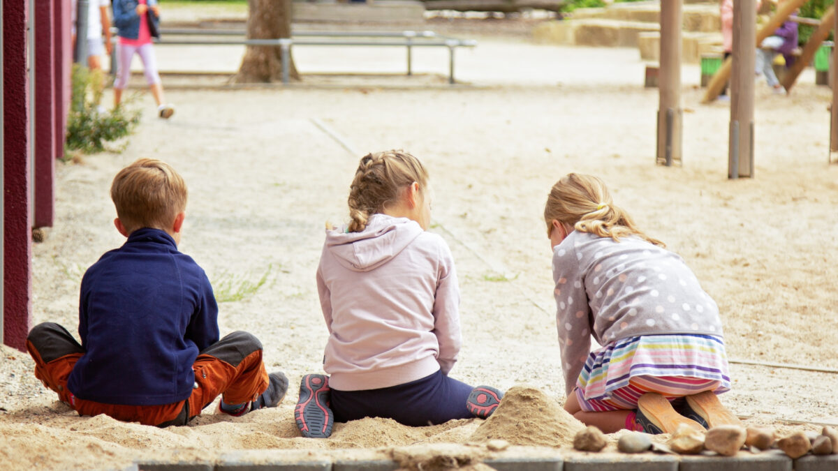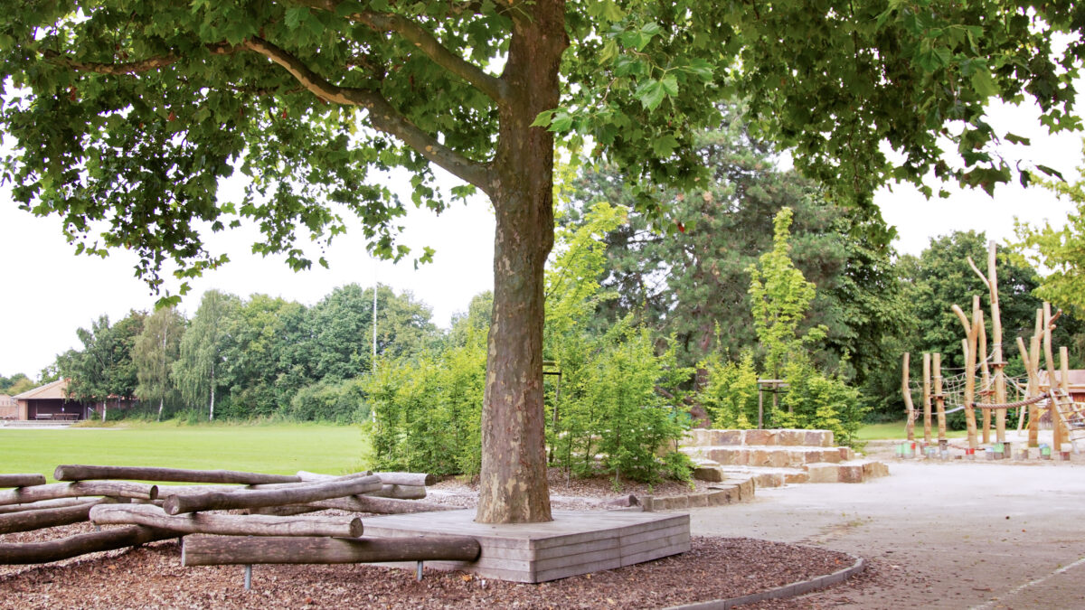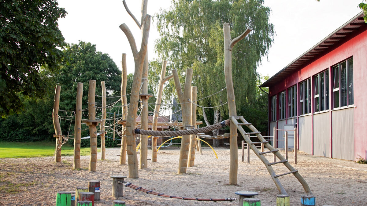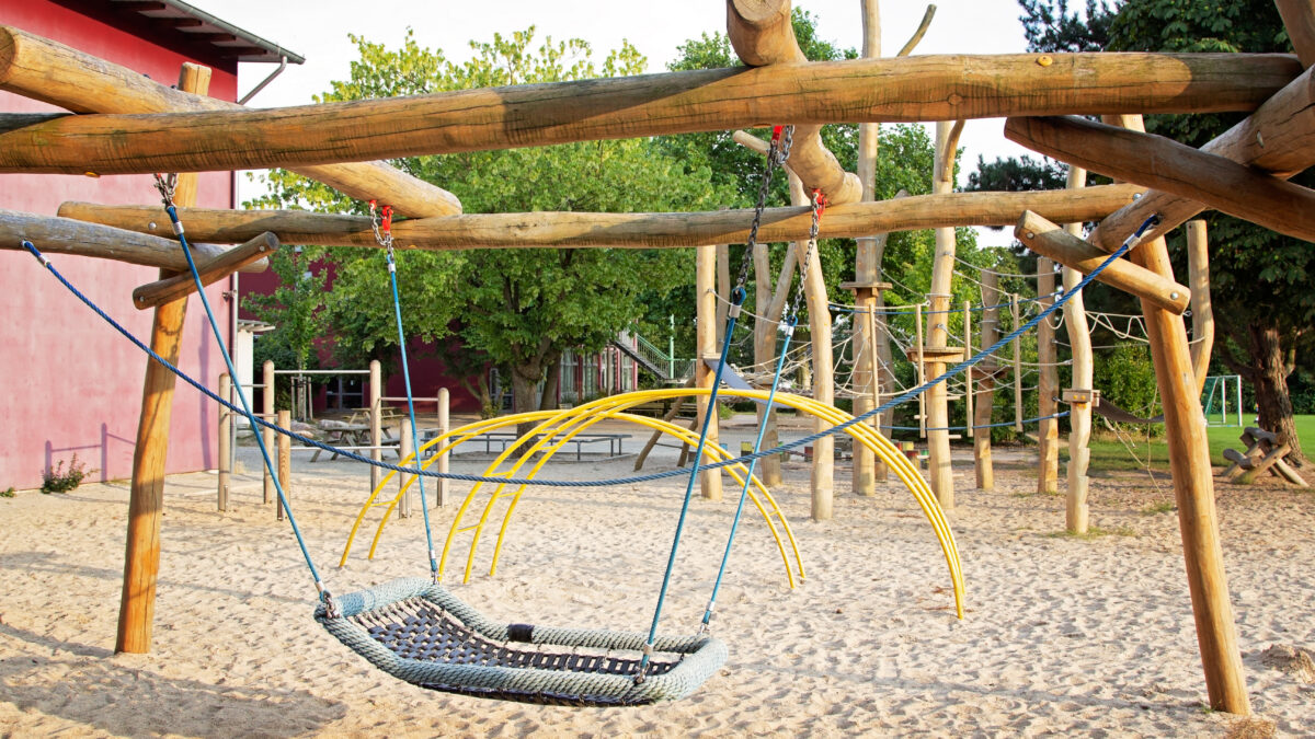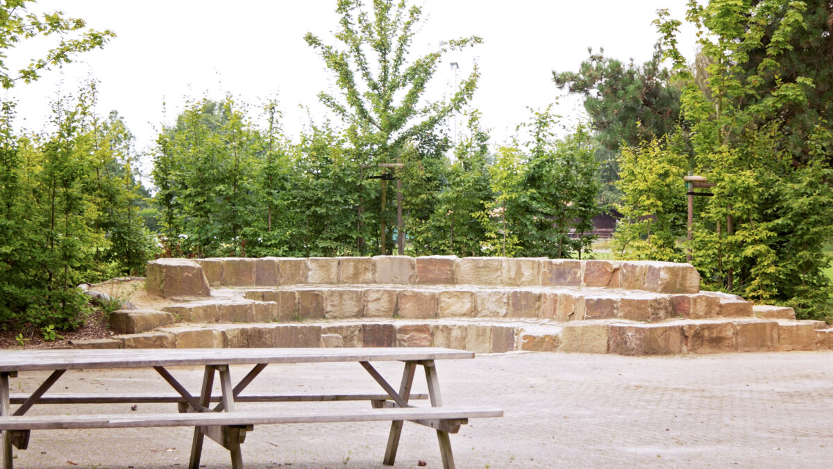 Neben einer Sandzone mit Spielzeughaus, Schaukel, Balancierlandschaft und Klettergerüsten gibt es auch ein Steinatrium, ein Steinhügel, ein Baumstammmikado und eine runde Holzbank zum Pause machen.