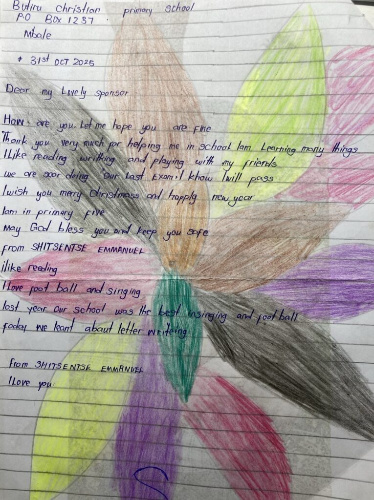Endlich haben wir wieder einmal Post aus Butiru bekommen. Emmanuel hat den Brief an uns auf Englisch verfasst. Hier findest du eine sinngemäße Übersetzung. Schau dir auch sein Foto an, ist er nicht groß geworden?