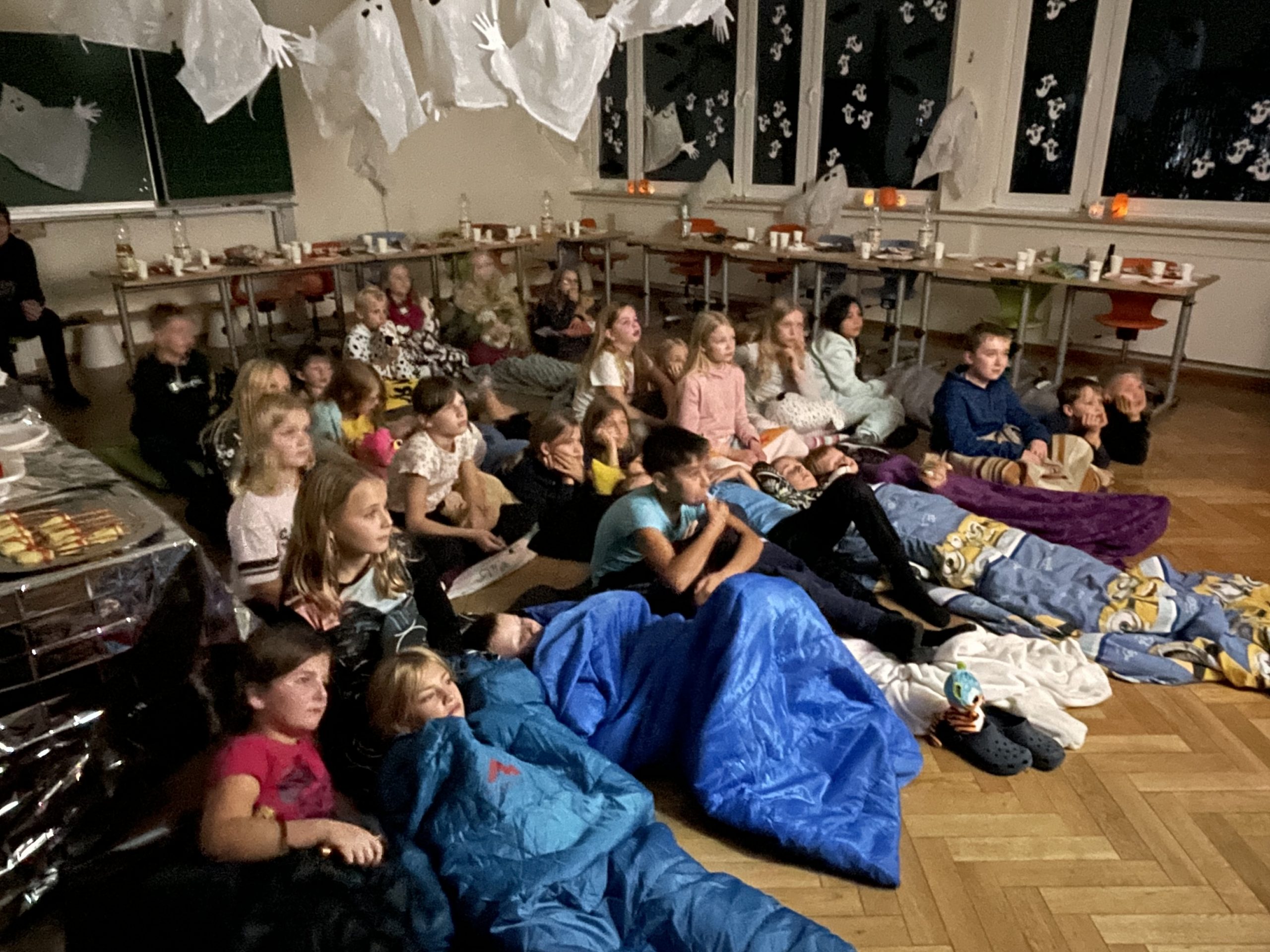 Natürlich durfte an dem Gruselabend auch ein Gruselfilm nicht fehlen. Somit stand Kino auf dem Programm. Hugo zeigte sich als Hauptdarsteller auf der Leinwand und bekämpfte mit Hedwig Kümmelsaft das UEG. Im Anschluss an den Film spielten einige Kinder noch eine Runde Werwolf. Nur die Mutigsten, die sich noch immer nicht genug gegruselt hatten, stiegen dann die Treppe hinab in den stockfinsteren, modrigen Keller. Manche behaupteten, dass es da spukt… und so war es auch. Details werden nicht verraten.