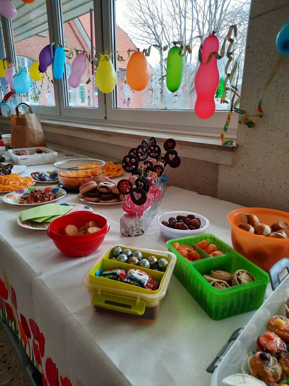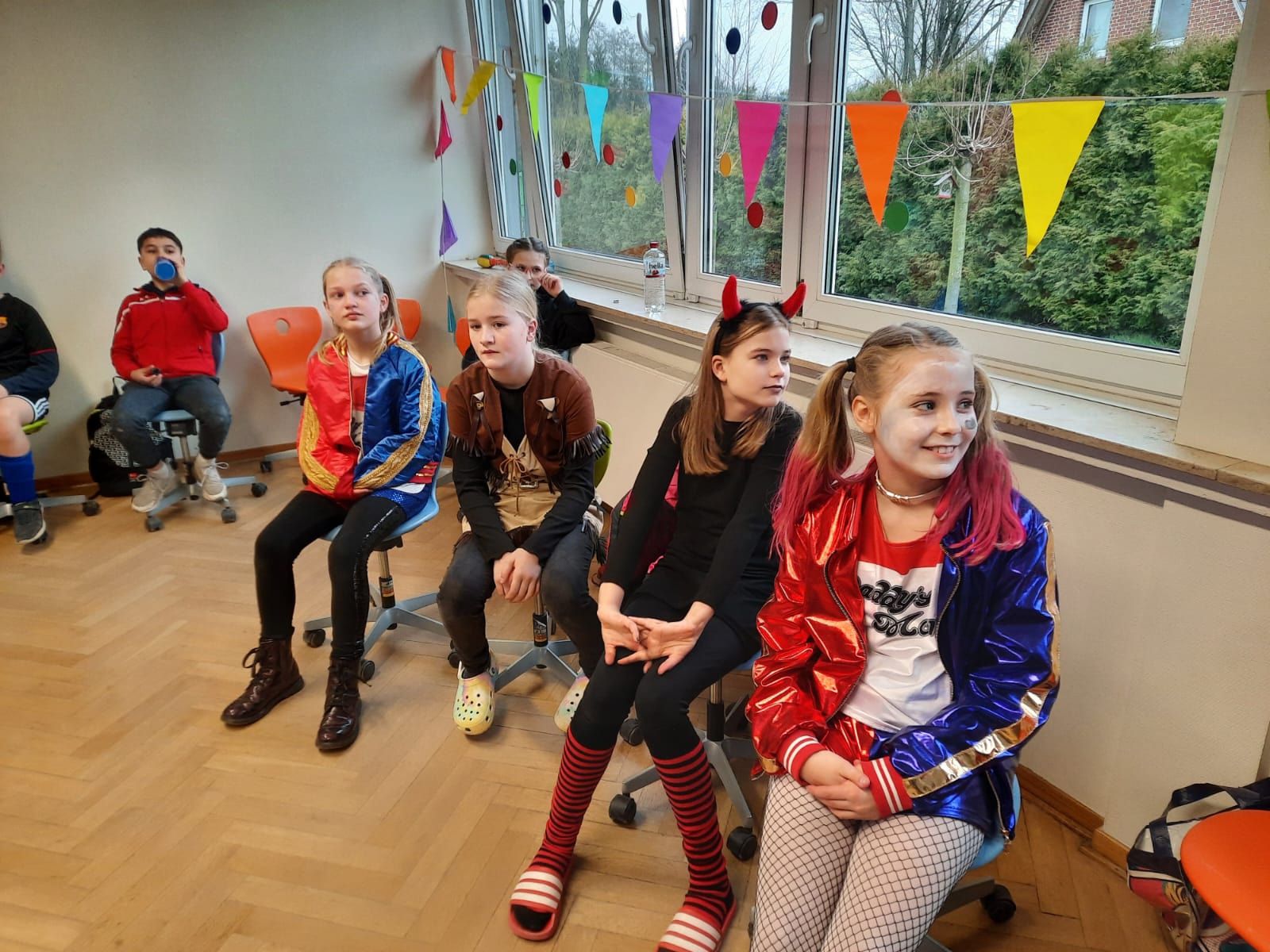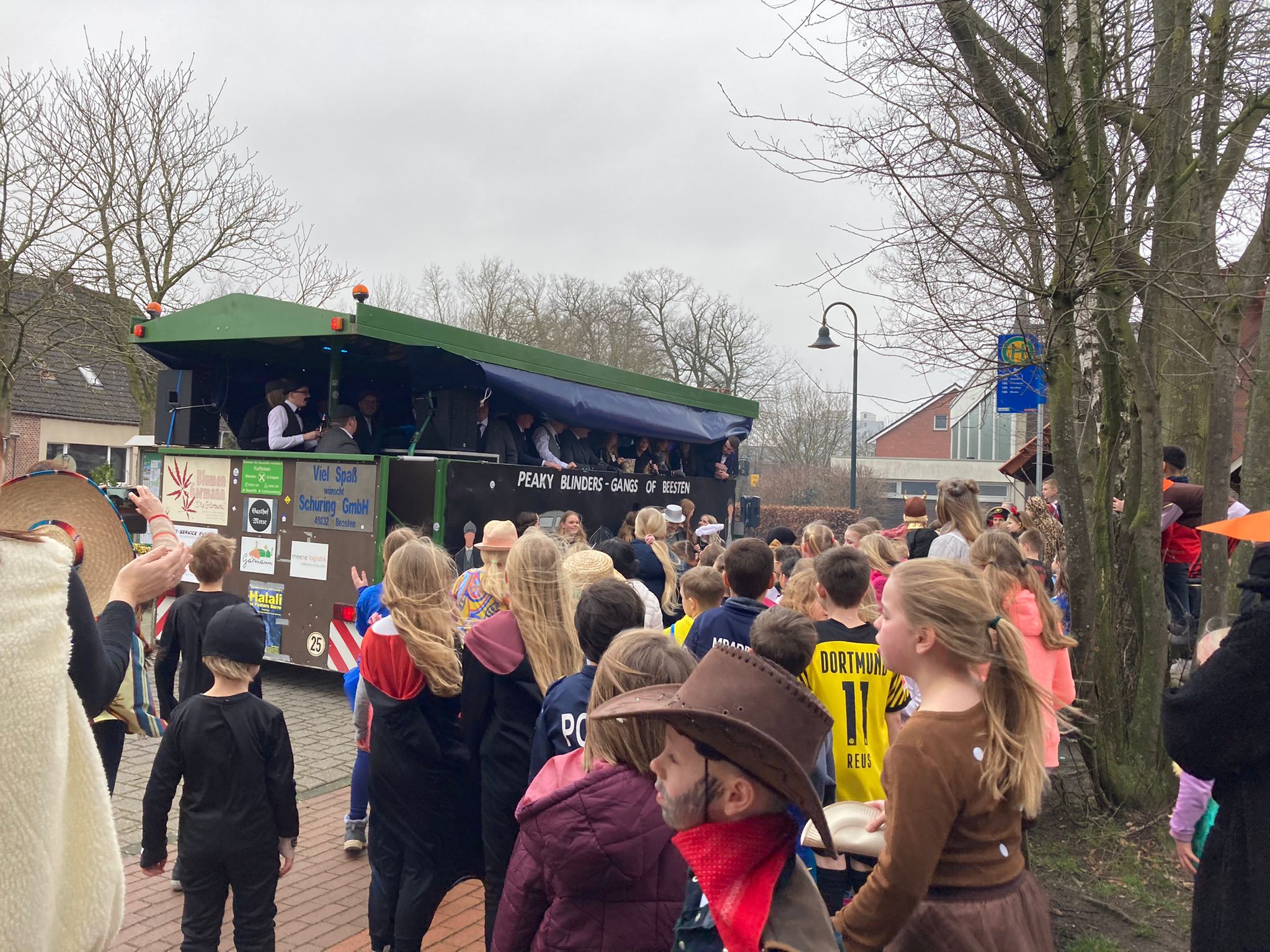Buntes Treiben in den Klassen und auf dem Schulhof, ein langes und leckeres Buffet im Flur und eine tolle Talentshow in der Turnhalle. Bei der Pommesbuden Polonäse und anderen Bewegungsliedern schunkelten alle auf und nieder. Selbst ein Huhn mit Sonnenbrand war mit von der Partie und wurde von den Kindern lautstark musikalsich begleitet. Der Karnevalswagen der Kolping Jugend Beesten schaute mit lauter Musik und einer Tanzeinlage an der Grundschule vorbei. Zur Freude der Kinder wurden reichlich Gummibärchen geschmissen. So kam noch einmal richtig Karnevalsfeeling auf. Helau, Luftschlangen und Konfetti …..oh, wie war die Stimmung toll!
