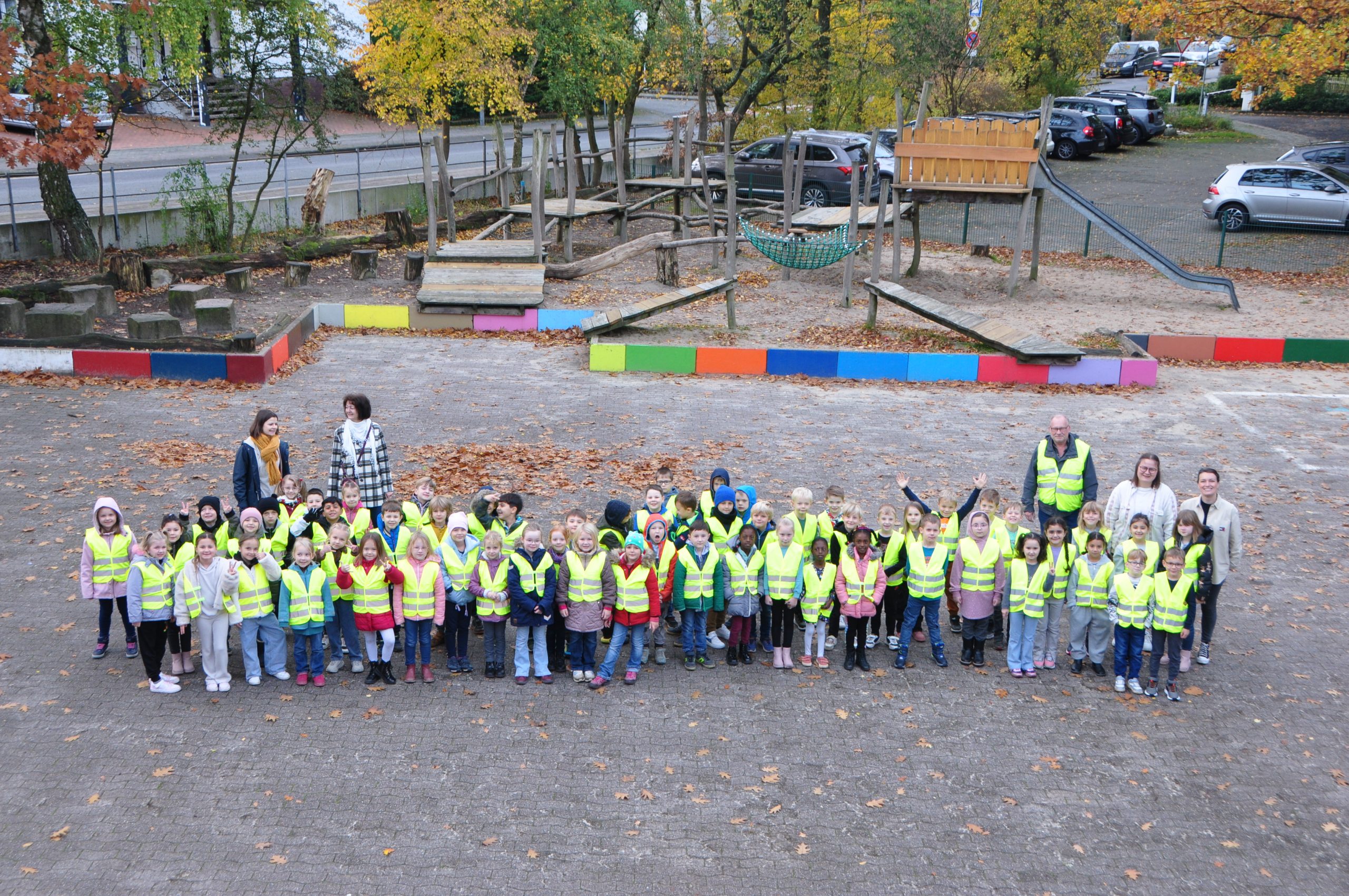 Passend zu Beginn der dunklen Jahreszeit gab es wieder als Geschenk für alle Erstklässler eine leuchtend gelbe Warnweste von der Verkehrswacht. Das Thema „Sicherer Schulweg“ wurde im Sachunterricht bereits zu Schuljahresbeginn von allen Seiten beleuchtet. Nun „leuchten“ unsere Erstklässler morgens in der Dunkelheit und sind auch für den Weg zu Fuß zur Schule bestens gerüstet. Vielen Dank an die Verkehrswacht für diese alljährliche tolle Aktion!
