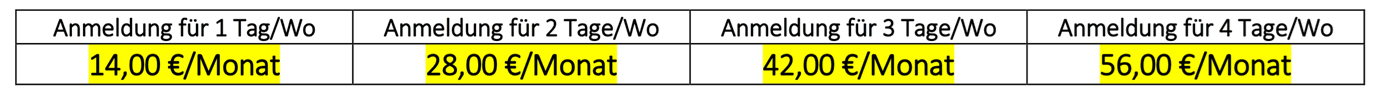 Der Preis pro Mittagessen beträgt 3,60 € für ein täglich wechselndes Hauptgericht plus Nachtisch.