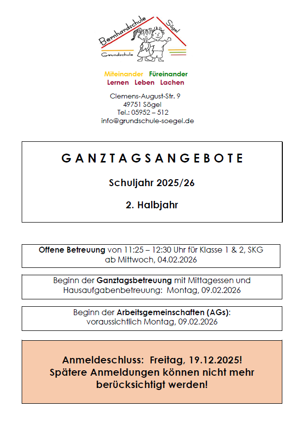 Bitte sprechen Sie uns einfach an: Tel. 0173-5925030 / E-Mail ganztag@gs-soegel.de oder ggf. über das Sekretariat Tel. 05952-512, E-Mail: info@grundschule-soegel.de .