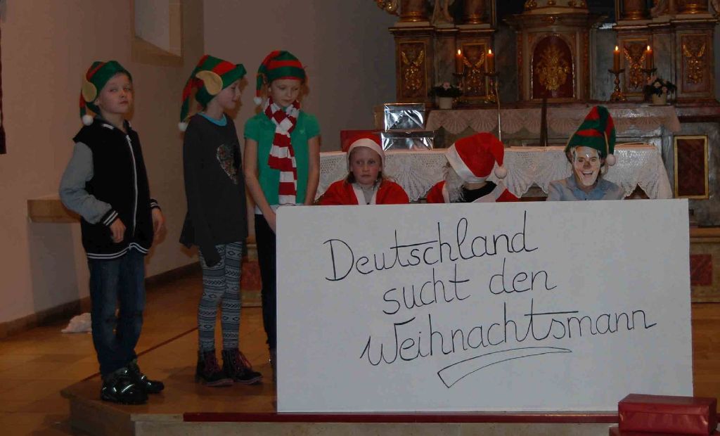 Für den ersten Teil unserer gemeinsamen Adventsfeier hatten alle Klassen etwas eingeübt: Weihnachtsgedichte, Weihnachtslieder, kleine Sketche und ein Kerzentanz standen auf dem Programm. Zur Pause ging es rüber in das neue Pfarrheim. Hier erwartete uns ein herrliches Buffet, für das viele Eltern etwas vorbereitet hatten. An dieser Stelle ein herzliches Dankeschön an alle Beteiligten! Im Pfarrheim war nun genügend Zeit zum Essen, Trinken und Reden. Danach folgte der zweite Teil unserer Feier. Die Theater-AG unter Leitung von Anne Schmidt führte das Weihnachtsmusical „Deutschland sucht den Weihnachtsmann“ auf. Ein großer Applaus war der Lohn für diese gelungene Darbietung. Selbst der Nikolaus war voll des Lobes und betonte zum Schluss noch einmal, wie viel Freude die Kinder ihm und allen Gästen mit ihren Beiträgen bereitet hätten. Und zur Überraschung aller erhielt noch jede Klasse einen großen Geschenkesack für die Klassengemeinschaft.
