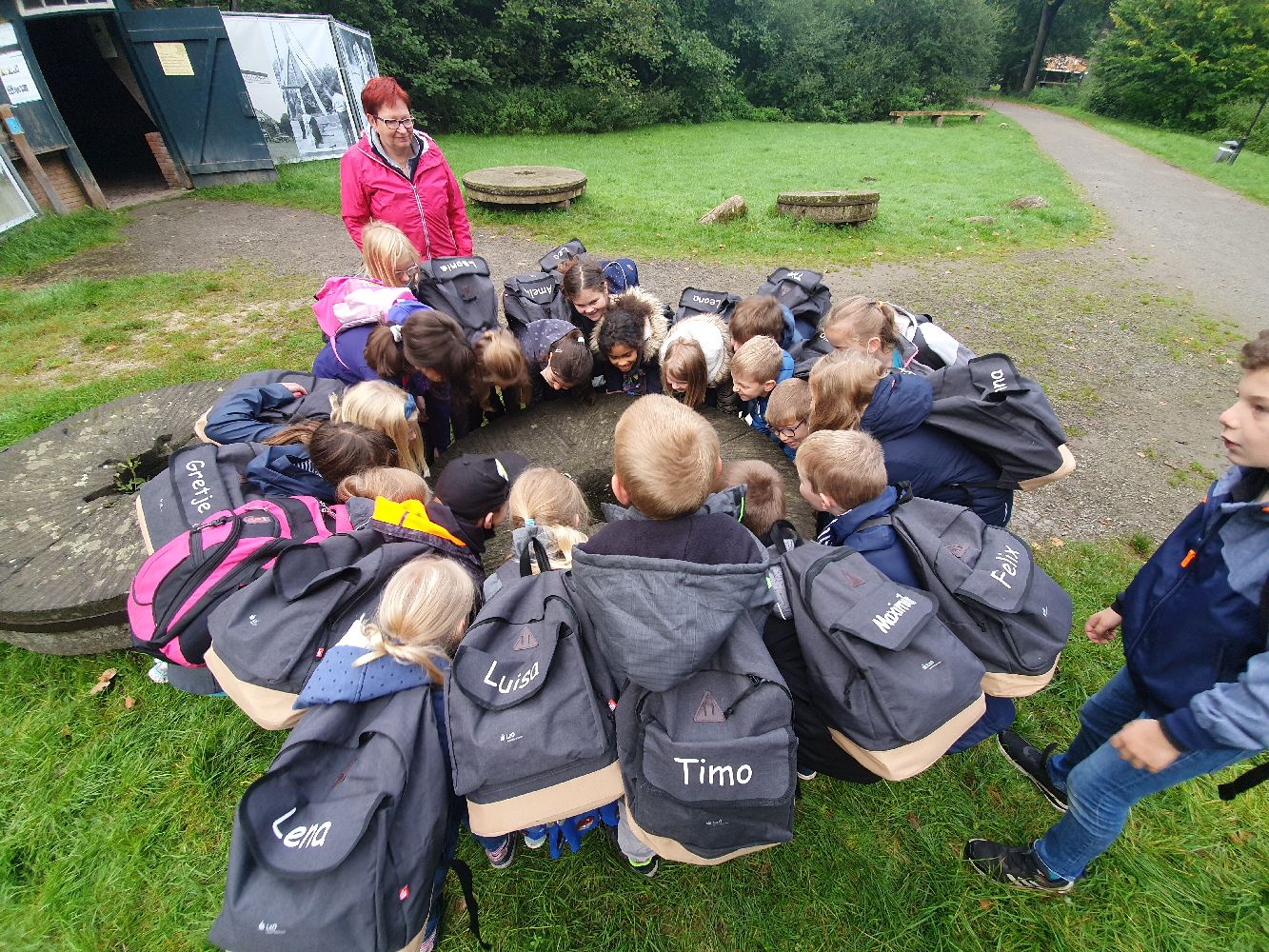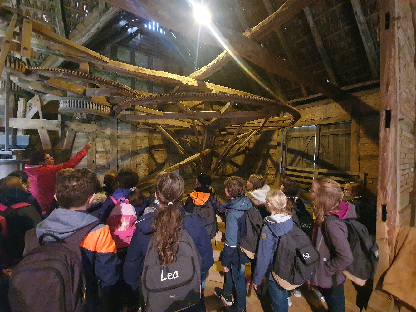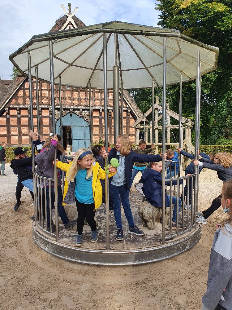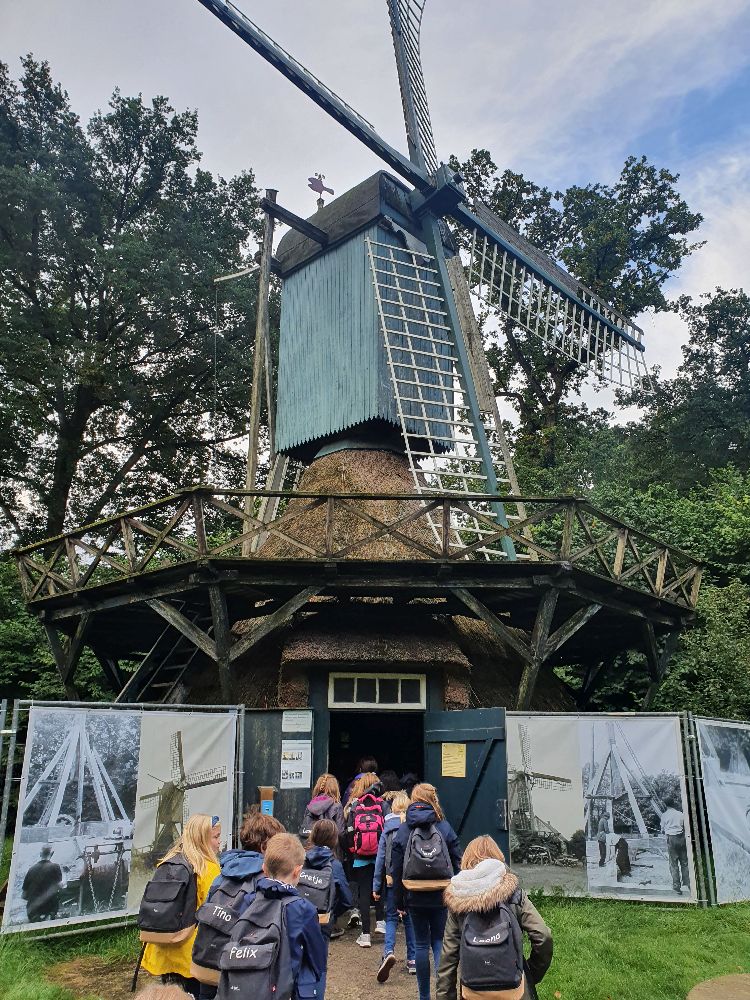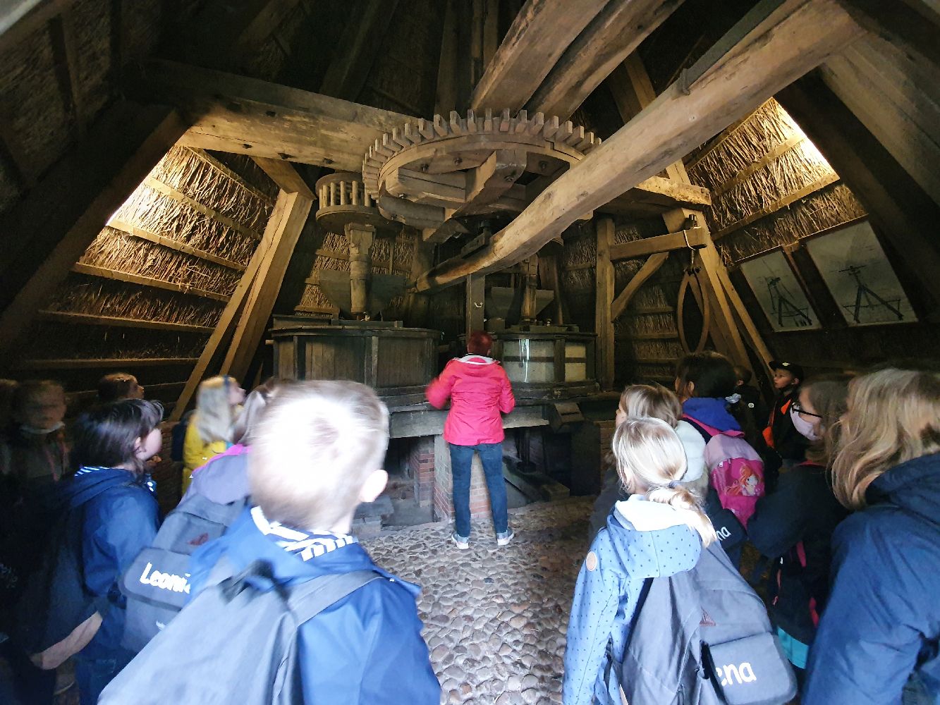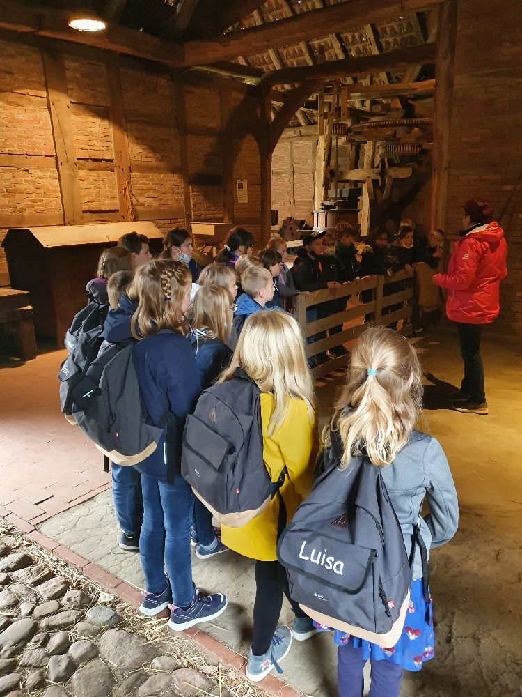 Am 29.9.21 konnte endlich der erste Wandertag für die Klasse 3 stattfinden. Im Museumsdorf Cloppenburg beschäftigte sich die Schildkrötenklasse mit dem Sachunterrichtsthema „Vom Korn zum Brot“. Zunächst ging es auf einen Rundgang durch das Museumsdorf, wo den Kindern das Dreschen mit dem Dreschflegel erläutert wurde. Leider durften sich die Kinder coronabedingt nicht selbst am Dreschen versuchen. Aber bereits beim Zuschauen war allen bewusst, dass es starke körperliche Belastung bedarf, um ein Brot herzustellen. Danach ging es zur kleineren Kokerwindmühle, da die große Bockwindmühle in Coronazeiten nicht begehbar ist. Dort wurde sehr anschaulich die Funktion einer Mühle erklärt und die Mahlsteine genauer unter die Lupe genommen. Anschließend wurde es im Backhaus spannend. Alle Kinder mussten unter fachkundiger Anleitung ihr eigenes Brot kneten und formen. Der häufig ertönte Satz „Boah, ist das anstrengend“ verdeutlichte einmal mehr, dass der Weg „vom Korn zum Brot“ kein einfacher war. Während das Brot ruhte und in den Ofen kam, wurde auf dem Spielplatz getobt und gespielt. Am Ende durfte jedes Kind stolz sein eigenes Brot mit nach Hause nehmen.