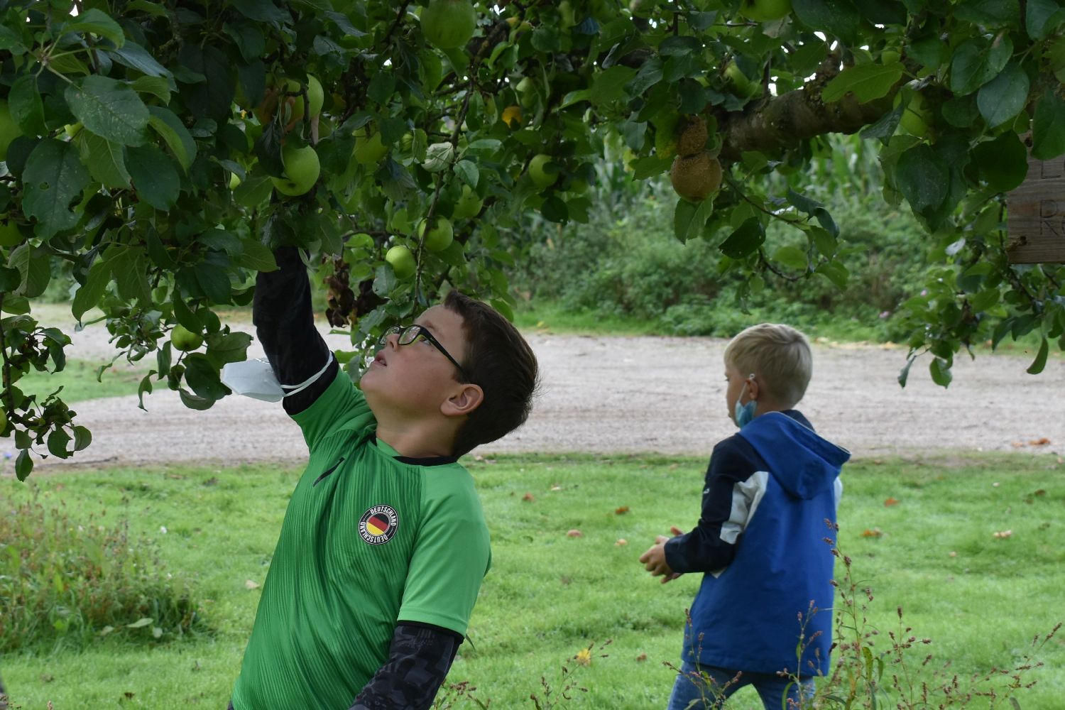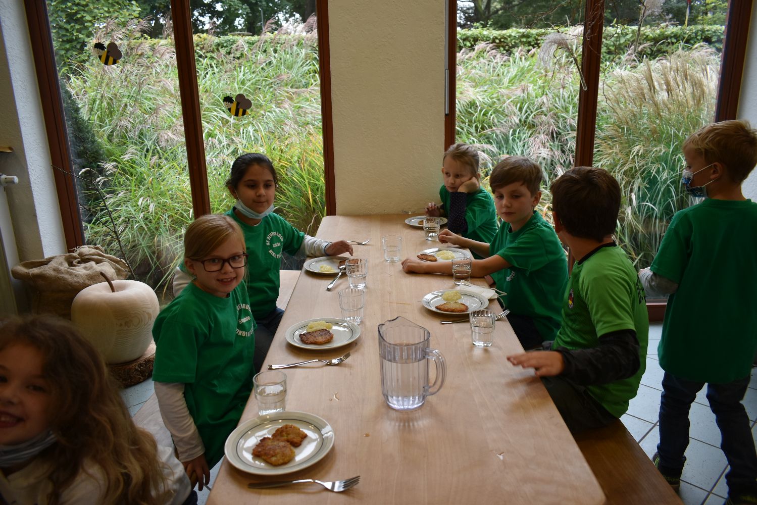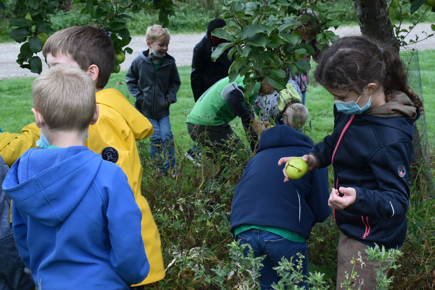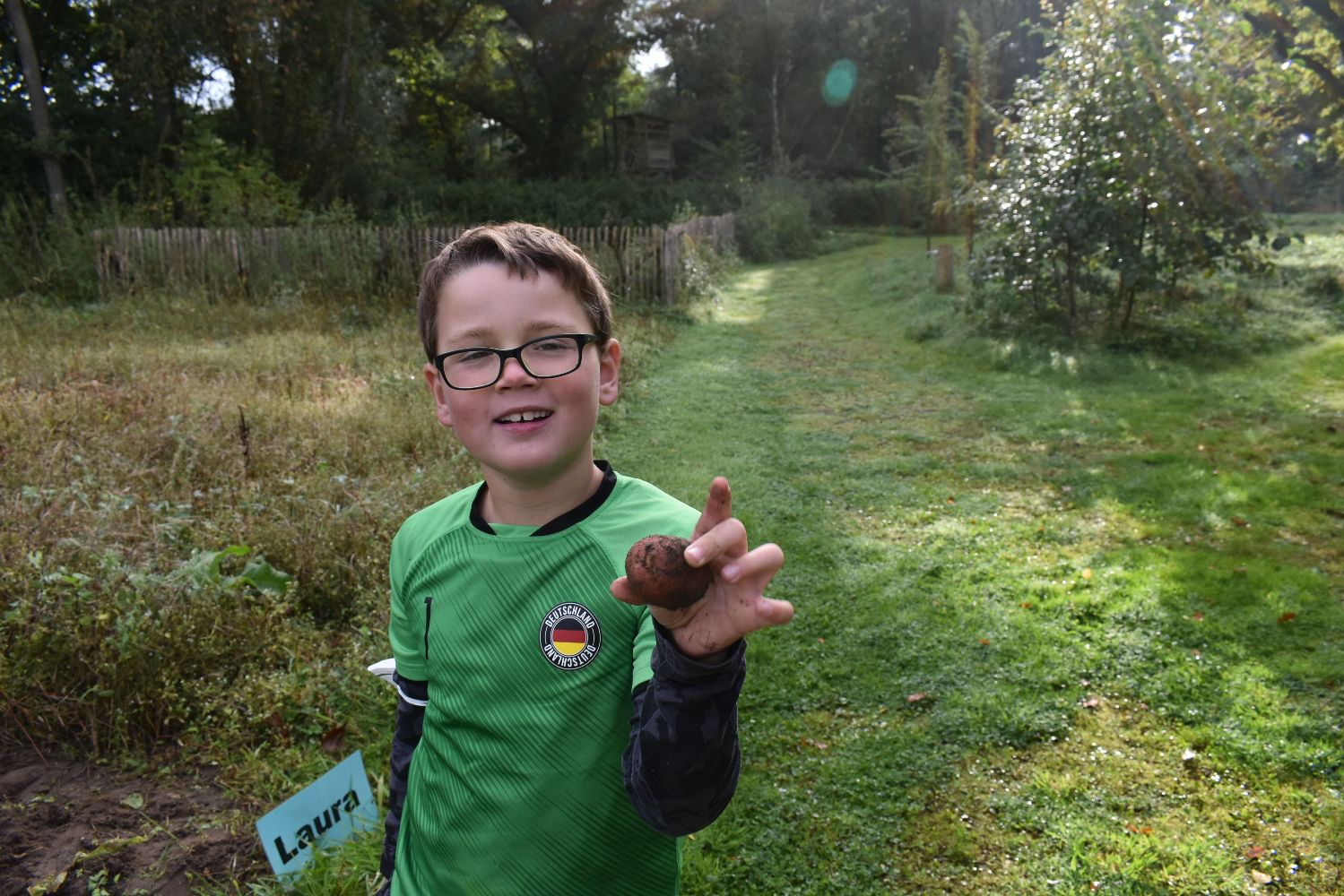 Dazu mussten sich alle aber zunächst auf den Weg zur Streuobstwiese machen, um für den Apfelmus die nötigen Äpfel zu sammeln bzw. zu pflücken. Auch die Kartoffeln für die Kartoffelpuffer mussten auf dem hauseigenen Kartoffelacker erst einmal geerntet werden. Dass es sogar rote Kartoffeln gab, überraschte doch viele. Nach der Frühstückspause wurden die Äpfel und Kartoffeln geschält und zerkleinert. Nach so viel Arbeit hatten sich alle eine ausgiebige Bewegungspause im Buchenlabyrinth verdient.