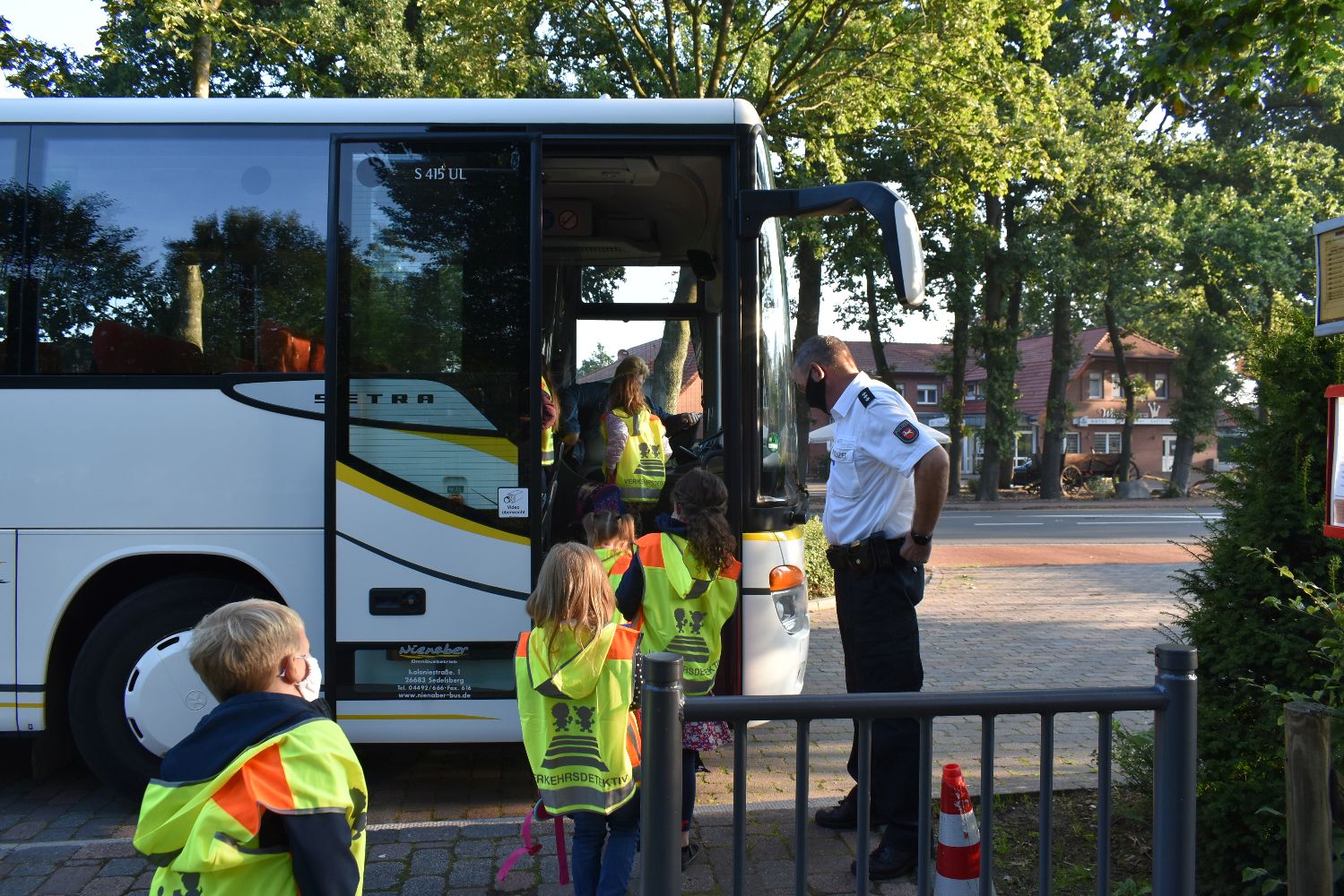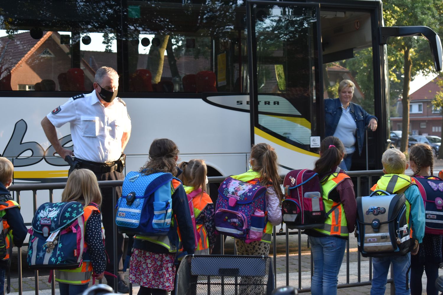 Gleich zum Schuljahresbeginn fand am 14. September 2020 für unsere Erstklässler das Busfahrtraining mit der Polizei Garrel und dem Busunternehmen Nienaber statt. Die Schülerinnen und Schülern übten gemeinsam das richtige Verhalten an der Bushaltestelle und im Bus.