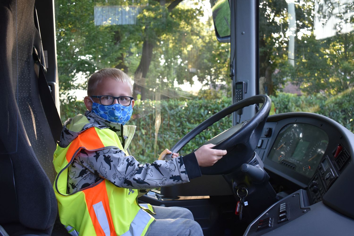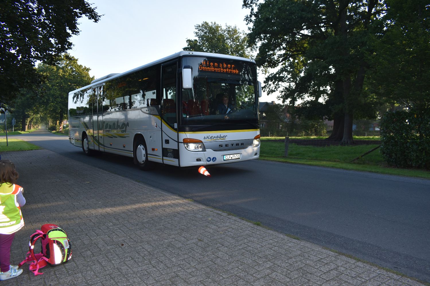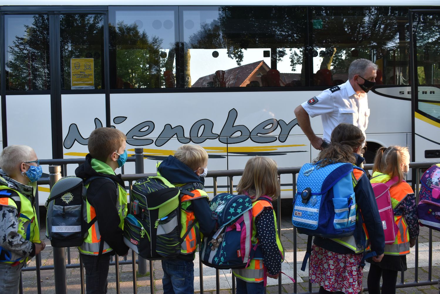 Gleich zum Schuljahresbeginn fand am 14. September 2020 für unsere Erstklässler das Busfahrtraining mit der Polizei Garrel und dem Busunternehmen Nienaber statt. Die Schülerinnen und Schülern übten gemeinsam das richtige Verhalten an der Bushaltestelle und im Bus.