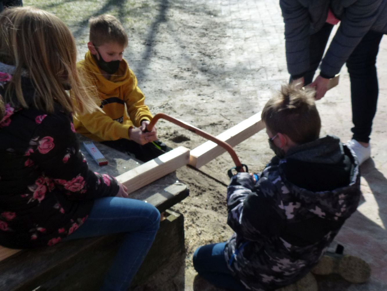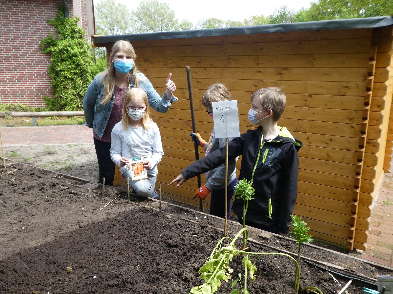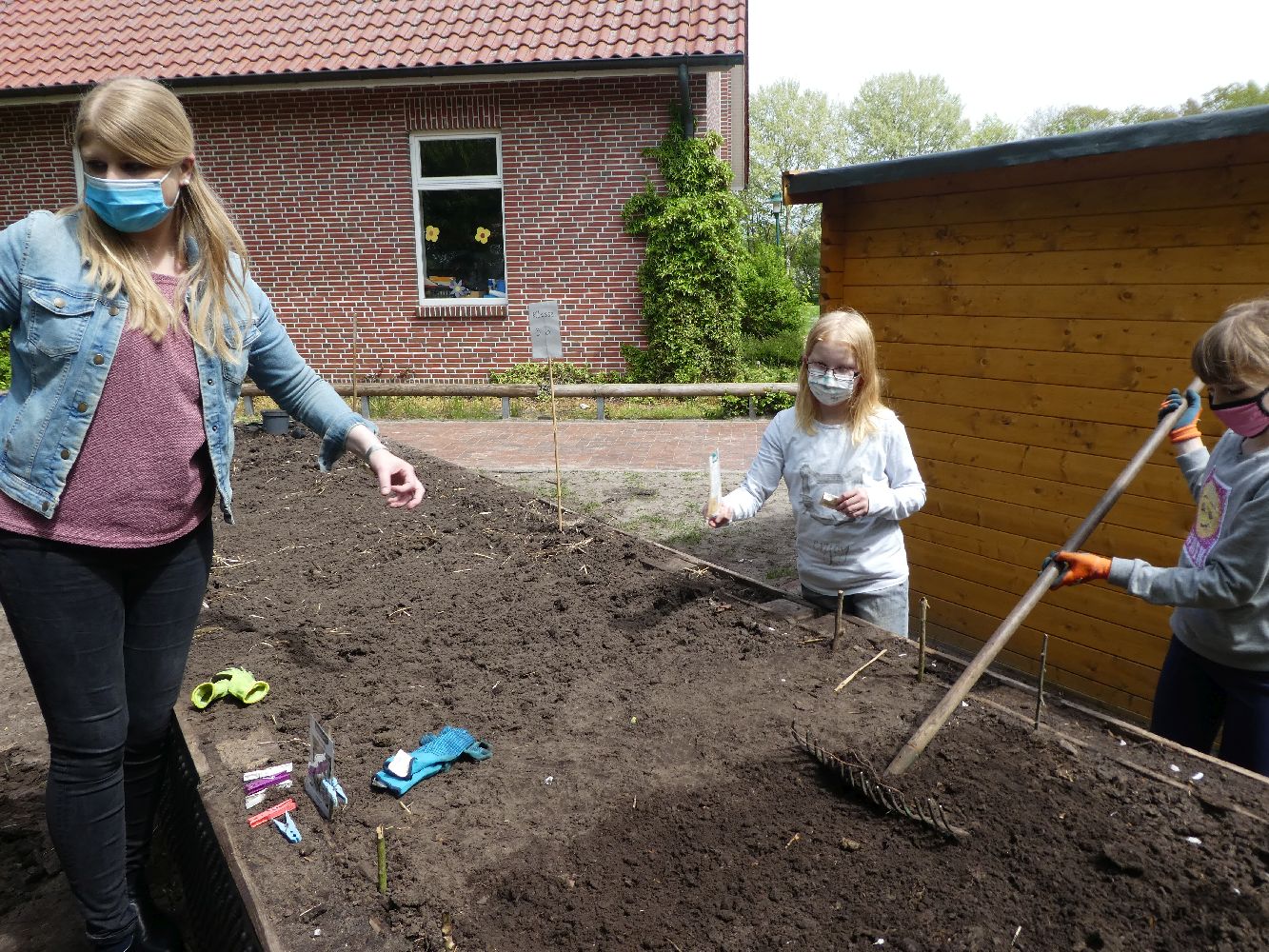 Die Schüler der 3. und 4. Klassen hatten eine tolle Idee. Wie wäre es, ein Hochbeet zu bauen, um dort Kartoffeln, Gurken, Tomaten, Salat, Zucchini und Blumen anzupflanzen und Gemüsesamen anzusäen.
