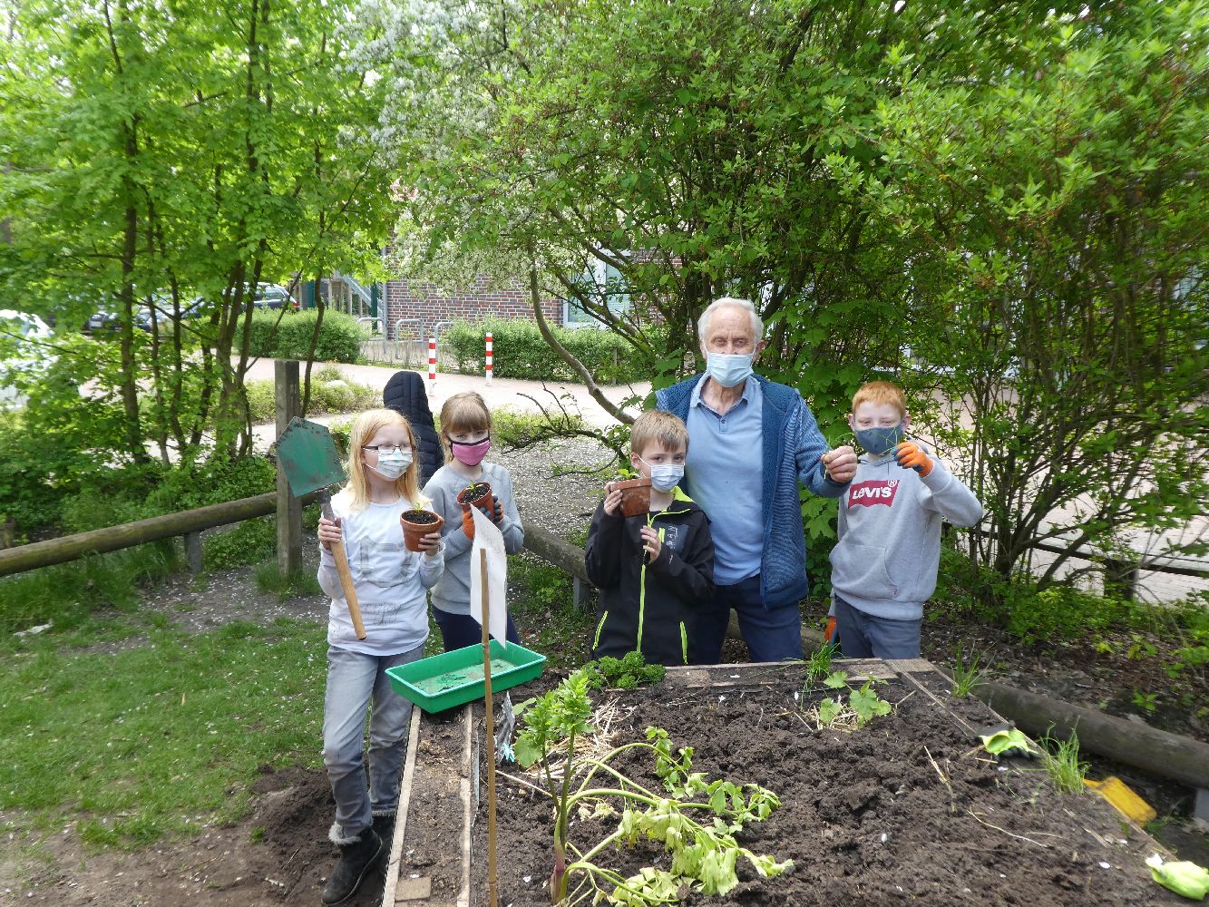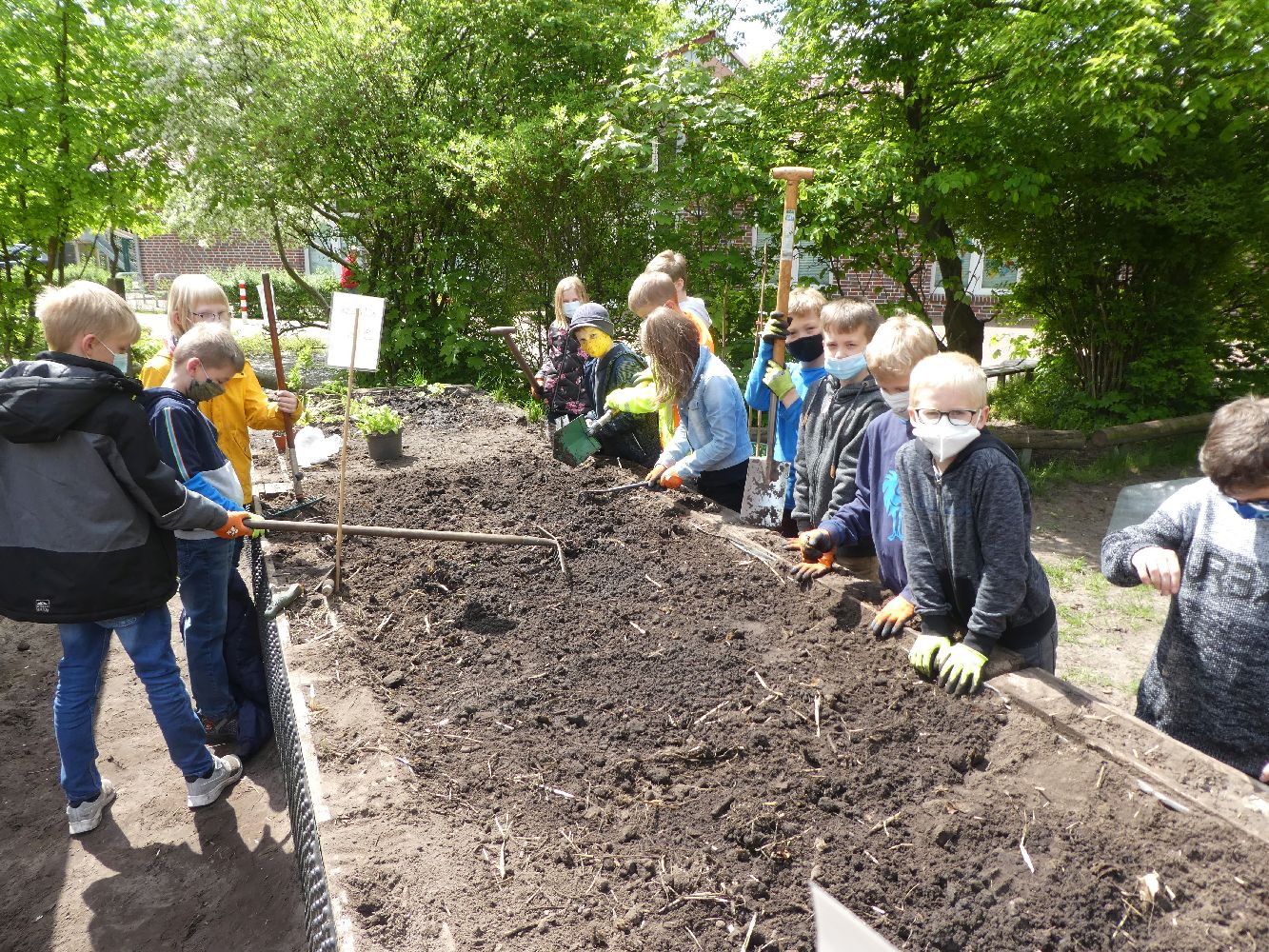 Die Schüler der 3. und 4. Klassen hatten eine tolle Idee. Wie wäre es, ein Hochbeet zu bauen, um dort Kartoffeln, Gurken, Tomaten, Salat, Zucchini und Blumen anzupflanzen und Gemüsesamen anzusäen.