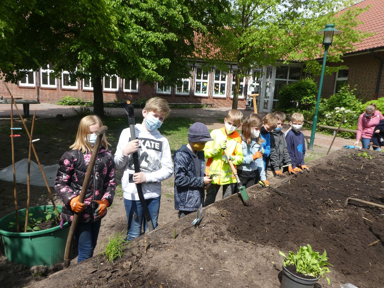 So dauerte es einige Wochen, bis das Hochbeet endlich stand und bepflanzt werden konnte. Herr Tapken stellte uns noch Pferdeäpfel zur Verfügung, einige Eltern auch Kompost und Dünger in Tüten verpackt. Die schleppten die Schüler mühsam mit in die Schule.