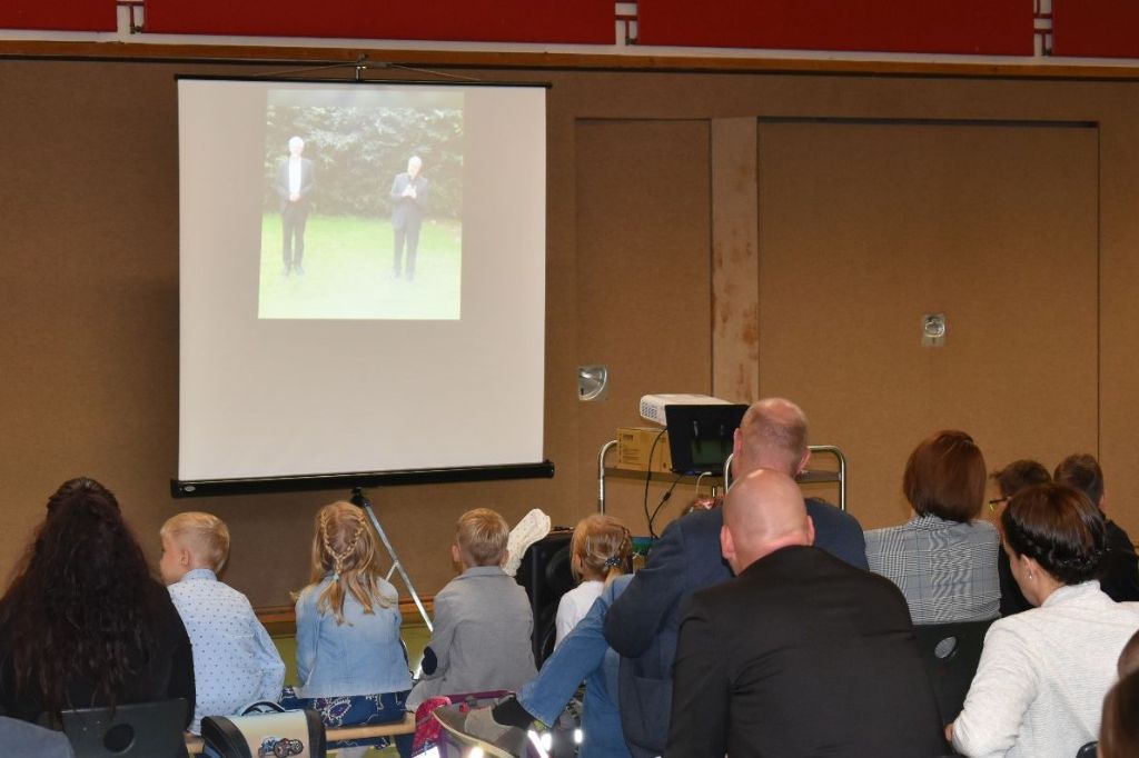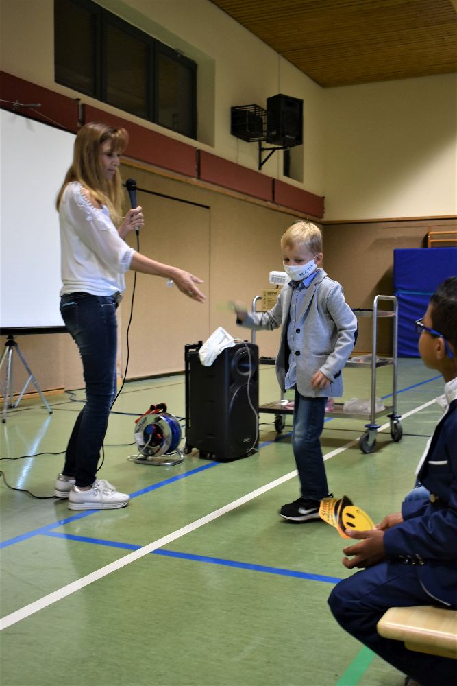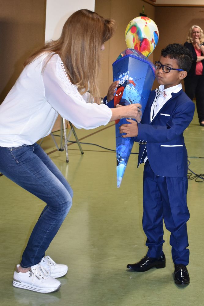 Im Anschluss daran unterhielten die Viertklässler unter der Leitung von Frau Melanie Sitzmann die Kinder mit dem auf Video aufgenommenen und unterhaltsamen kleinen Theaterstück „Fred der Frosch – eine Schule für alle“, bei dem, wie man schon vermuten kann, der inklusive Gedanke im Mittelpunkt der Geschichte stand. Höhepunkt der Feierstunde war natürlich wie in jedem Jahr das Überreichen der wunderschönen bunten Schultüten, welche die Kinder samt einem gesponsorten Rucksack mit strahlenden Augen von ihrer Klassenlehrerin in Empfang nahmen.