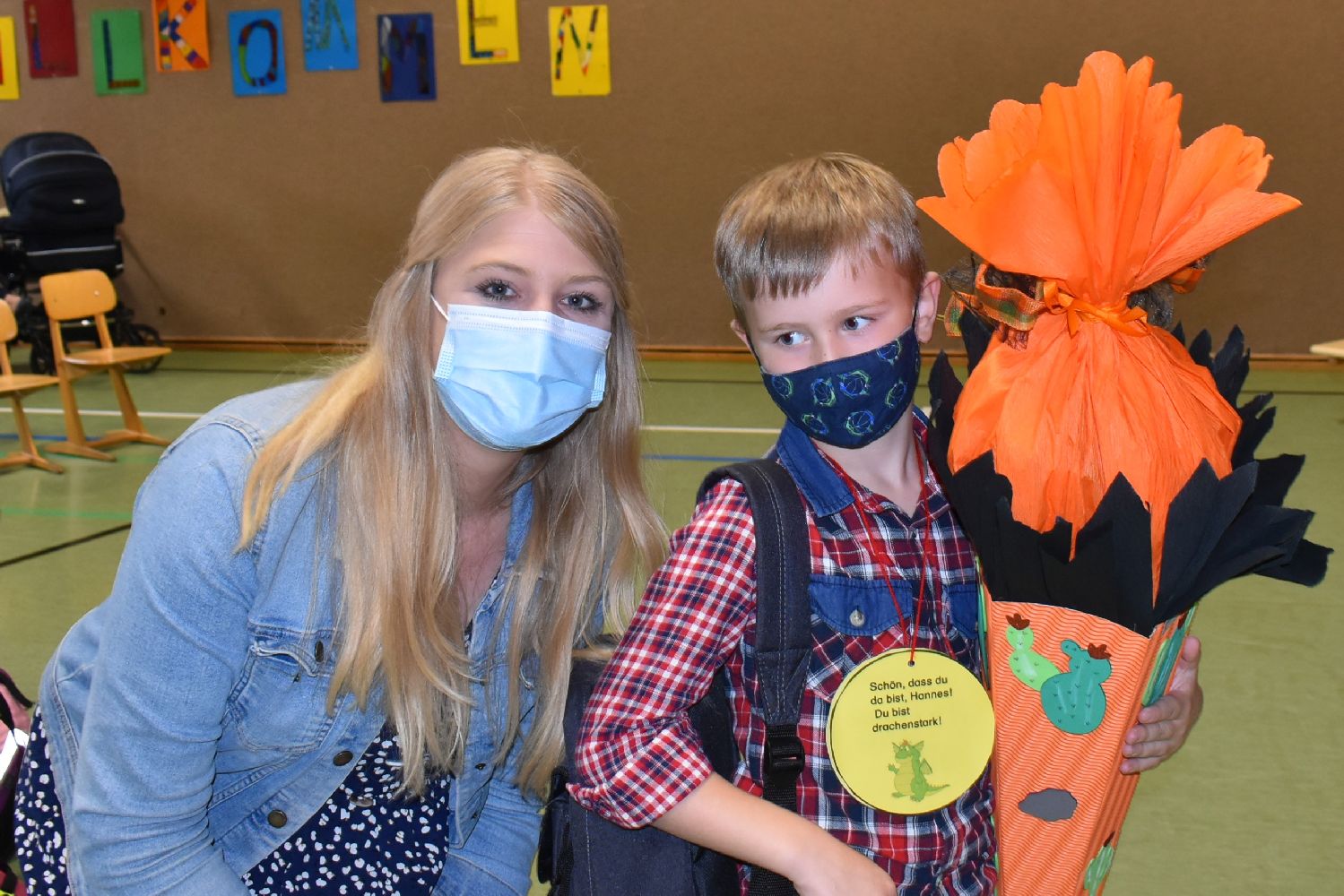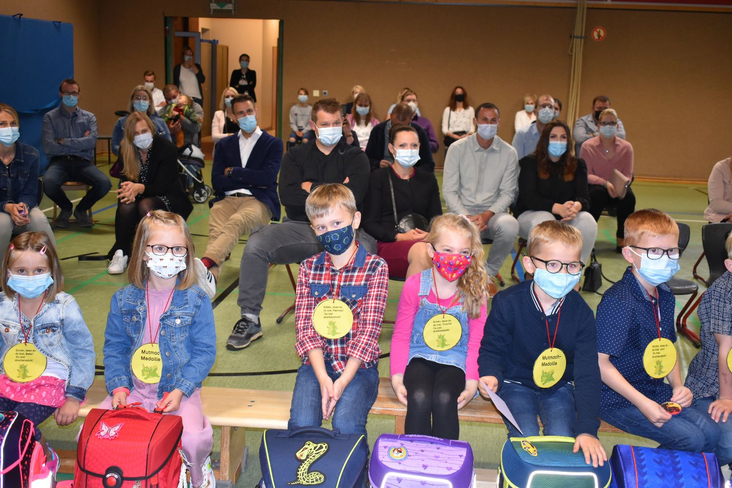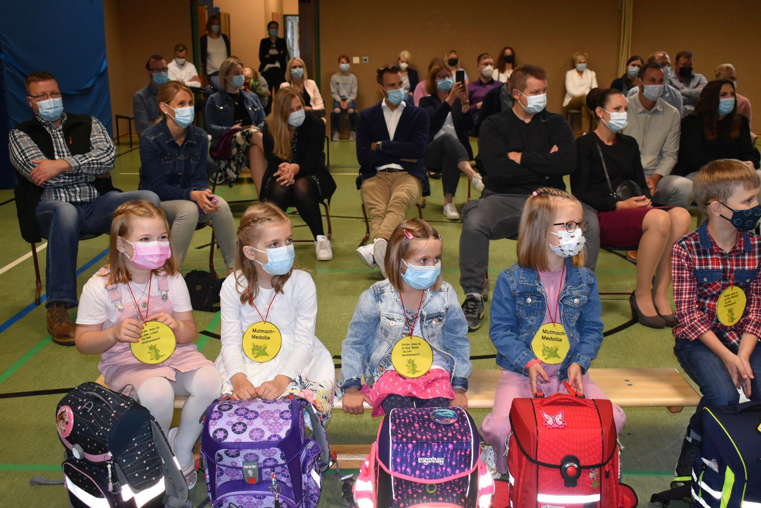 Für 23 Erstklässler war heute, am 04.09.2021, der große Tag der Einschulung endlich gekommen. Herzlich begrüßt wurden sie zunächst von unserer kommisarischen Schulleiterin Melanie Hinxlage als auch von ihrer Klassenlehrerin Annika Gramling. Frau Gramling kam aber nicht allein, sondern brachte den kleinen Drachen Konstantin mit, der wegen seiner Einschulung zunächst ähnlich gemischte Gefühle wie die Kinder hatte. Aber der kleine Drache fand schnell heraus, dass jeder schon besondere Fähigkeiten besitzt und deshalb mutig zur Schule gehen kann. Daran soll auch die Mutmachmedaille erinnern, die Frau Gramling jedem Kind überreichte.
