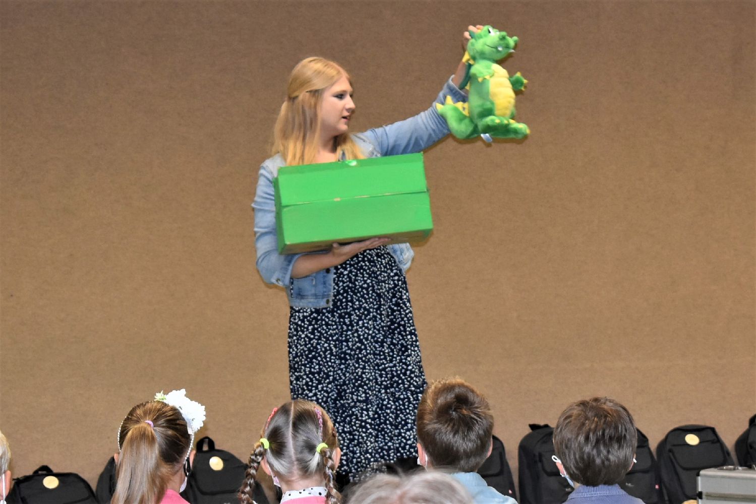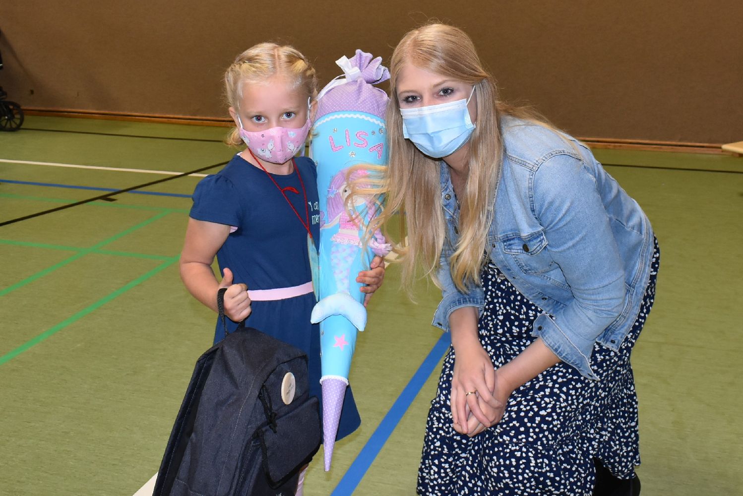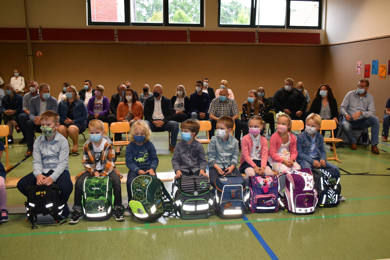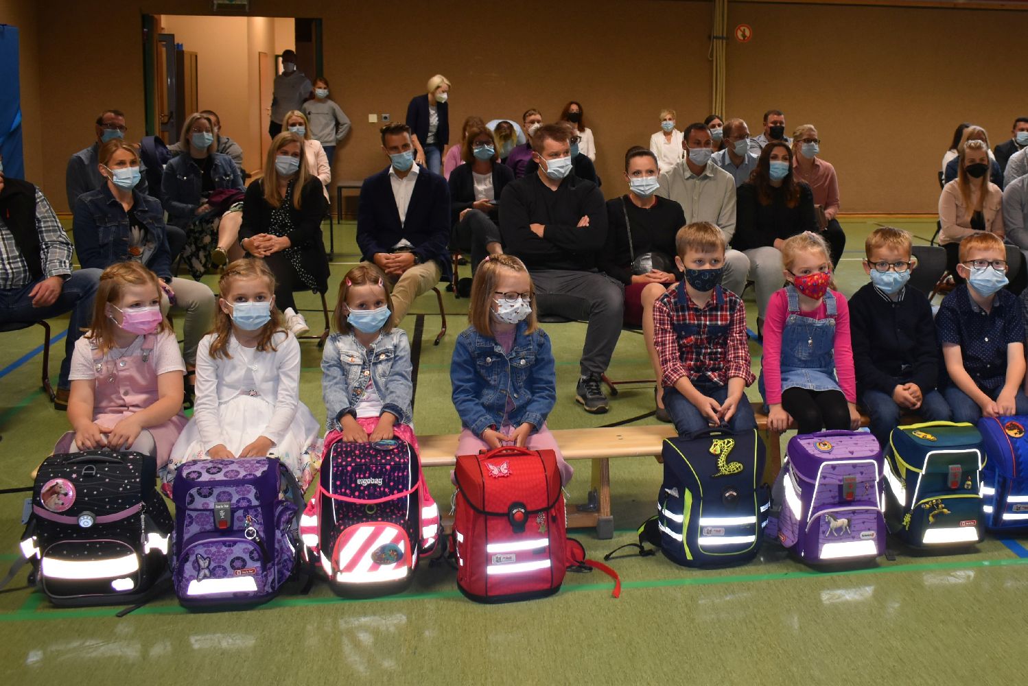 Für 23 Erstklässler war heute, am 04.09.2021, der große Tag der Einschulung endlich gekommen. Herzlich begrüßt wurden sie zunächst von unserer kommisarischen Schulleiterin Melanie Hinxlage als auch von ihrer Klassenlehrerin Annika Gramling. Frau Gramling kam aber nicht allein, sondern brachte den kleinen Drachen Konstantin mit, der wegen seiner Einschulung zunächst ähnlich gemischte Gefühle wie die Kinder hatte. Aber der kleine Drache fand schnell heraus, dass jeder schon besondere Fähigkeiten besitzt und deshalb mutig zur Schule gehen kann. Daran soll auch die Mutmachmedaille erinnern, die Frau Gramling jedem Kind überreichte.