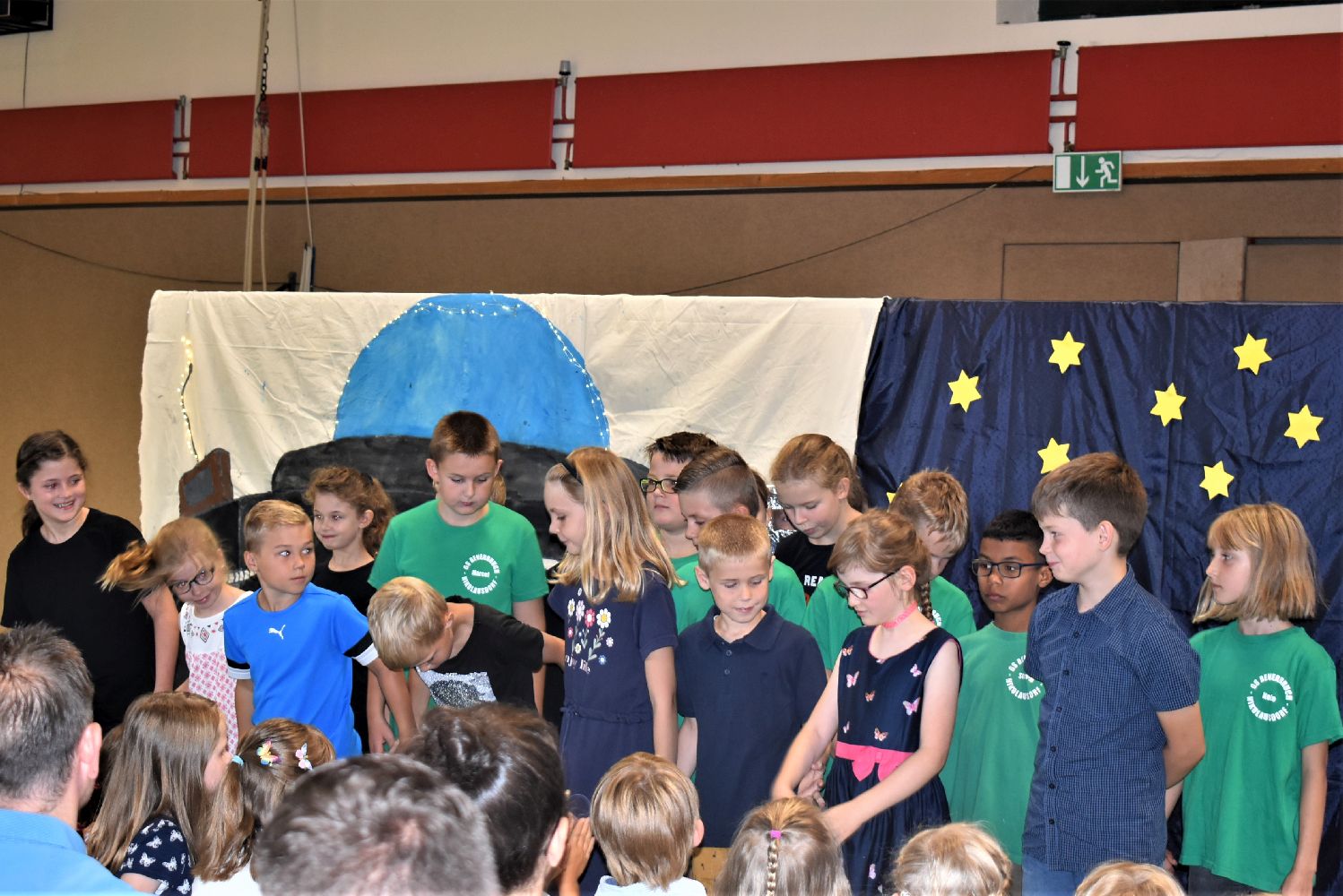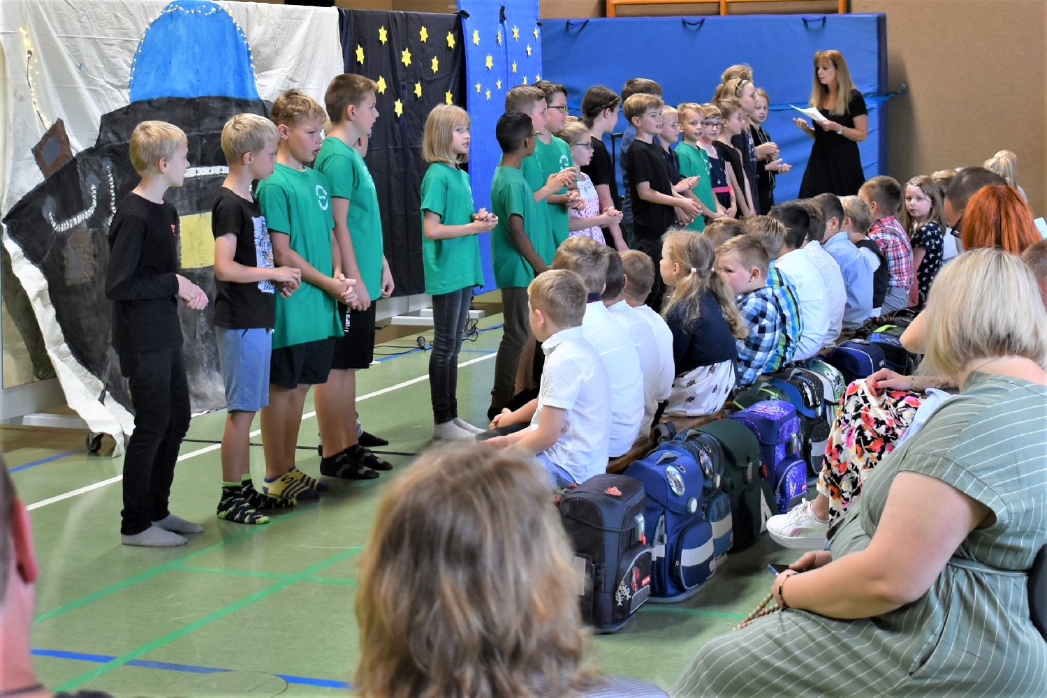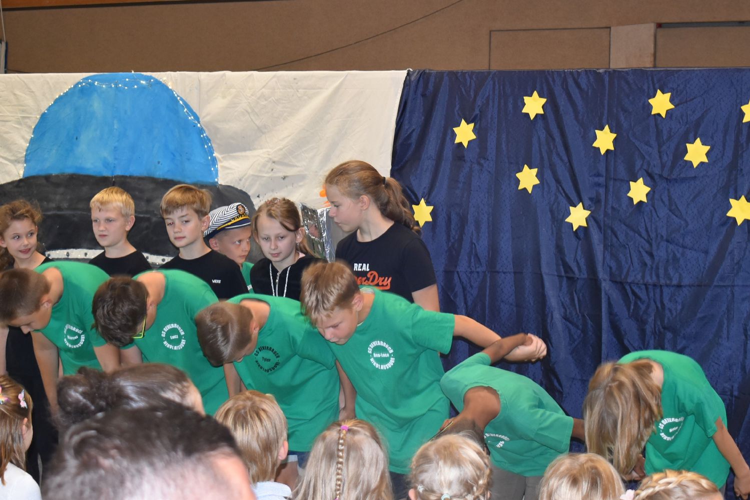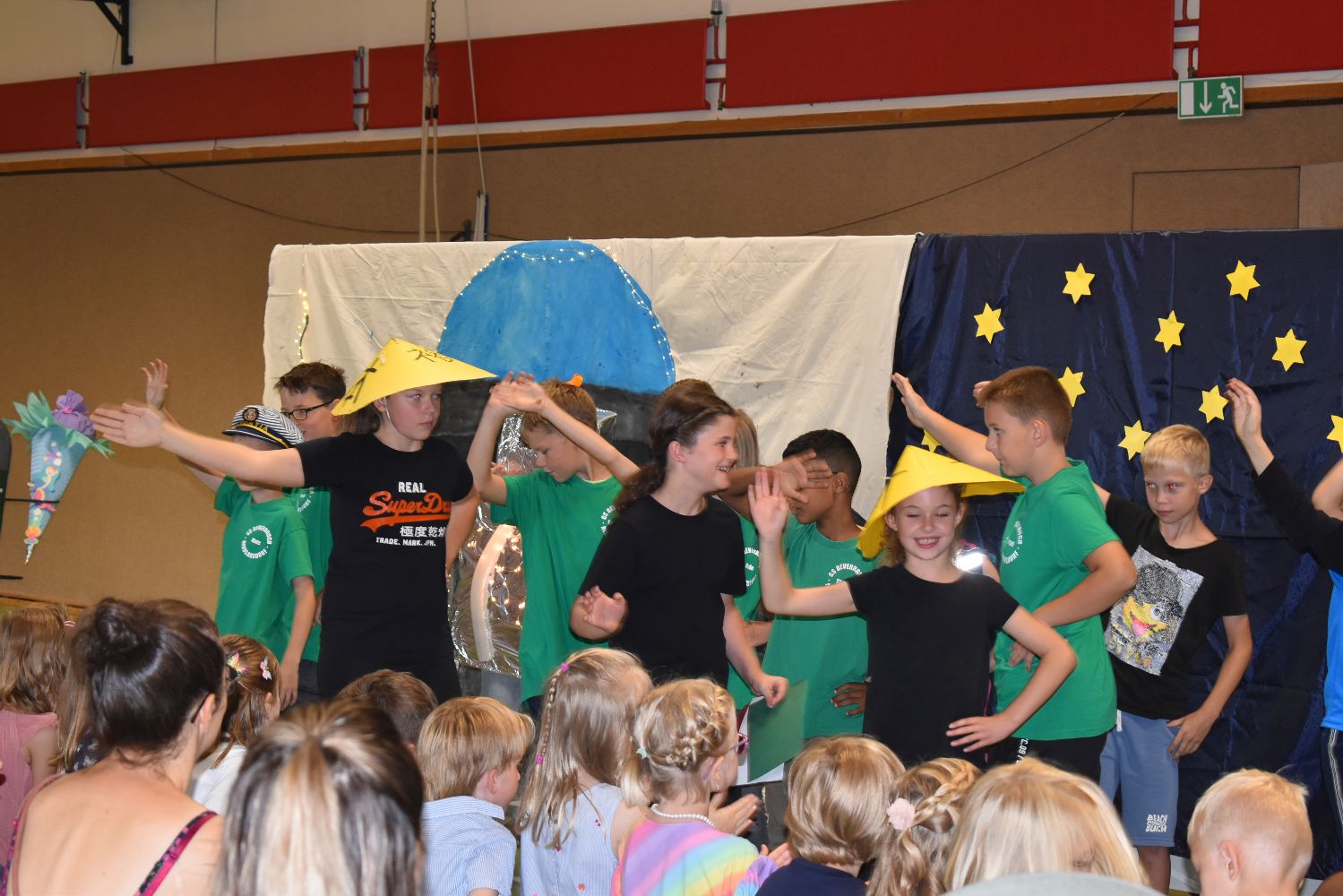 Im Anschluss daran versammelten sich Eltern, Kinder, Lehrer, Gäste und natürlich unsere Erstklässler in der Beverbrucher Turnhalle. Die Schülerinnen und Schüler der Klasse 4 hatten unter der Leitung von Frau Kaiser die diesjährige Einschulungsfeier vorbereitet und unterhielten unsere Schulneulinge mit einem Willkommenslied und dem Musical von den “Grünquatschlingen“. Das sind sympathische Außerirdische, die in Beverbruch eine neue Heimat finden und gemeinsam mit den Erstklässlern lernen wollen. nicht schreiben konnte. Im Anschluss daran überreichten die Klassenlehrkräfte die wunderschönen Schultüten an die Kinder.