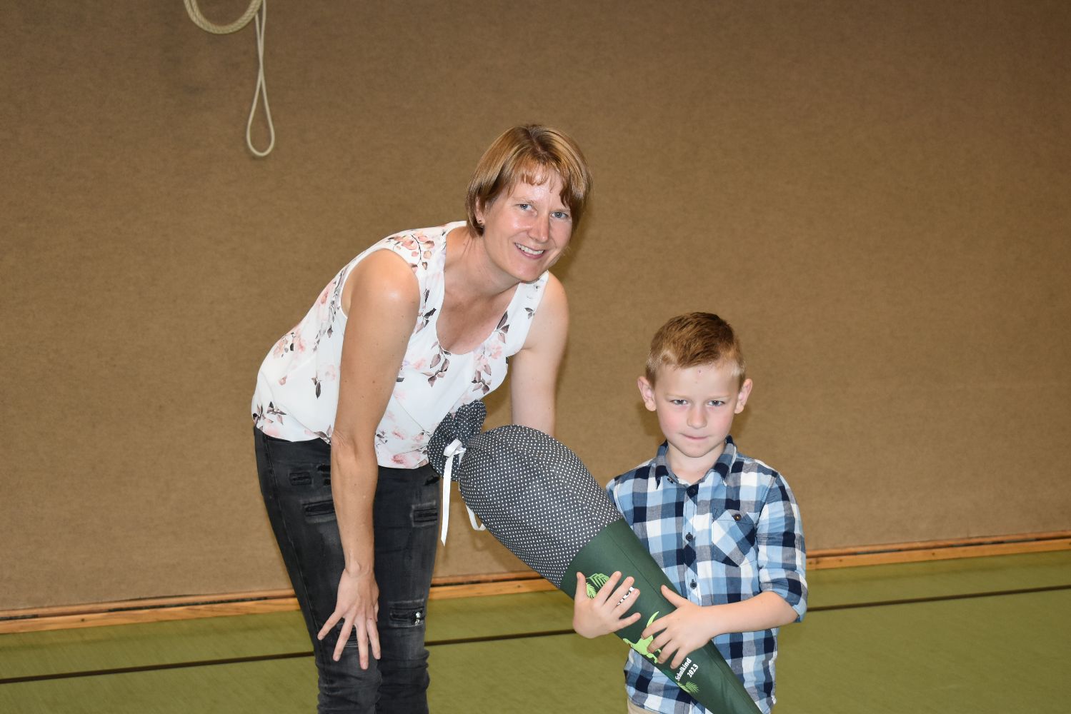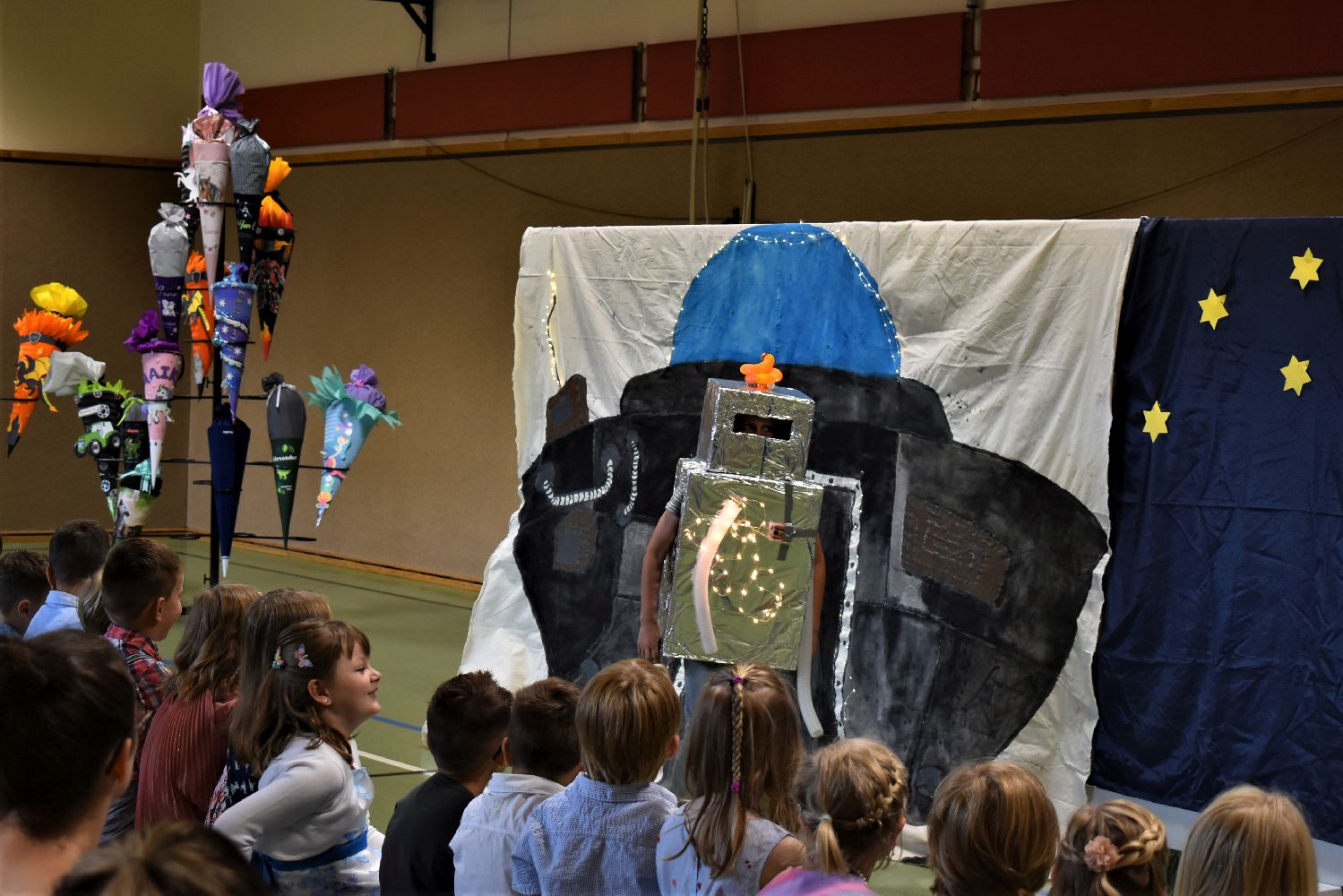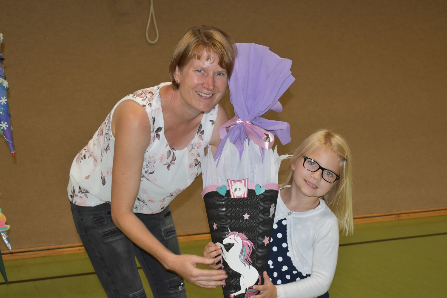 Im Anschluss daran versammelten sich Eltern, Kinder, Lehrer, Gäste und natürlich unsere Erstklässler in der Beverbrucher Turnhalle. Die Schülerinnen und Schüler der Klasse 4 hatten unter der Leitung von Frau Kaiser die diesjährige Einschulungsfeier vorbereitet und unterhielten unsere Schulneulinge mit einem Willkommenslied und dem Musical von den “Grünquatschlingen“. Das sind sympathische Außerirdische, die in Beverbruch eine neue Heimat finden und gemeinsam mit den Erstklässlern lernen wollen. nicht schreiben konnte. Im Anschluss daran überreichten die Klassenlehrkräfte die wunderschönen Schultüten an die Kinder.