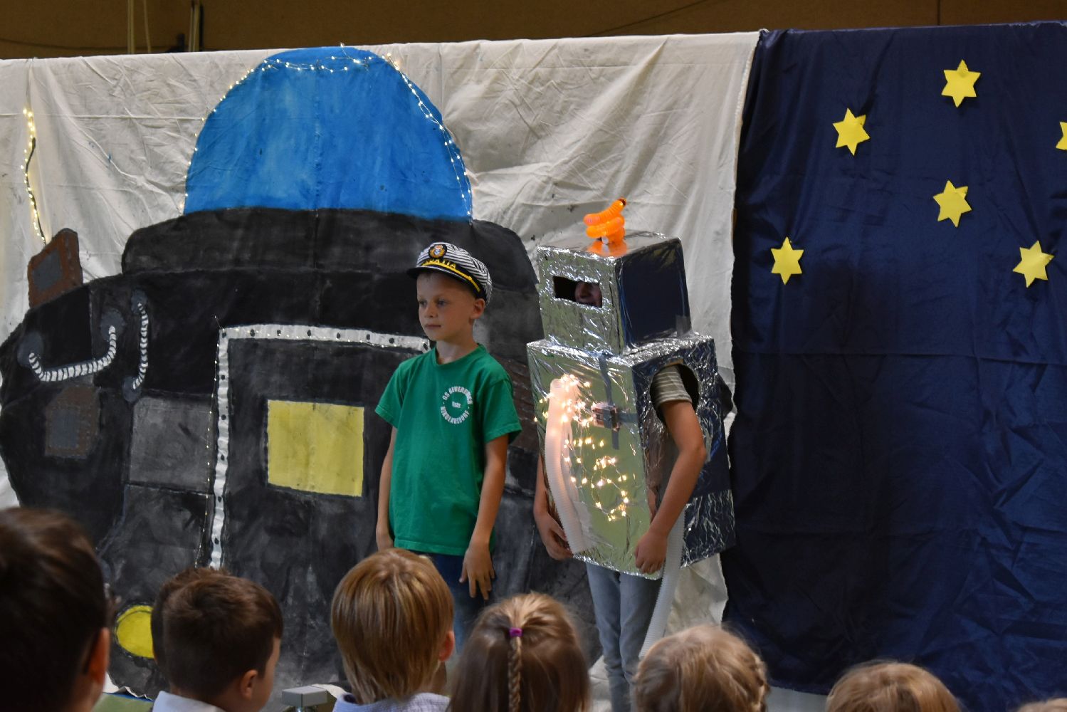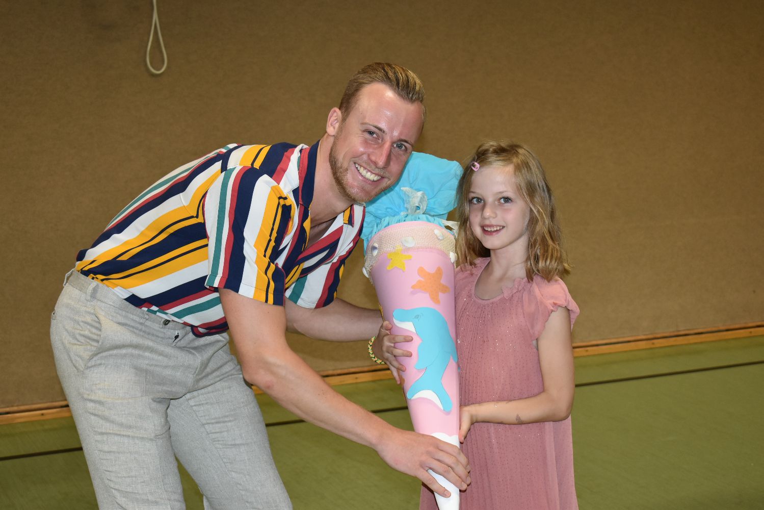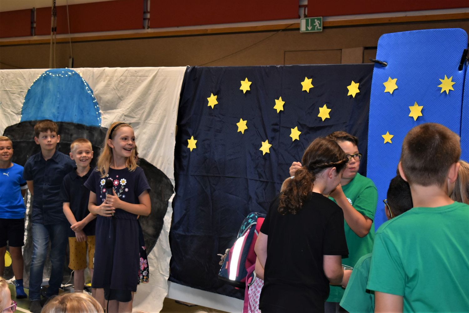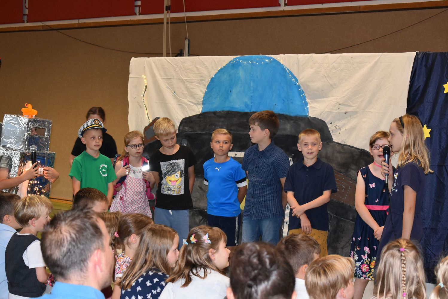 Im Anschluss daran versammelten sich Eltern, Kinder, Lehrer, Gäste und natürlich unsere Erstklässler in der Beverbrucher Turnhalle. Die Schülerinnen und Schüler der Klasse 4 hatten unter der Leitung von Frau Kaiser die diesjährige Einschulungsfeier vorbereitet und unterhielten unsere Schulneulinge mit einem Willkommenslied und dem Musical von den “Grünquatschlingen“. Das sind sympathische Außerirdische, die in Beverbruch eine neue Heimat finden und gemeinsam mit den Erstklässlern lernen wollen. nicht schreiben konnte. Im Anschluss daran überreichten die Klassenlehrkräfte die wunderschönen Schultüten an die Kinder.