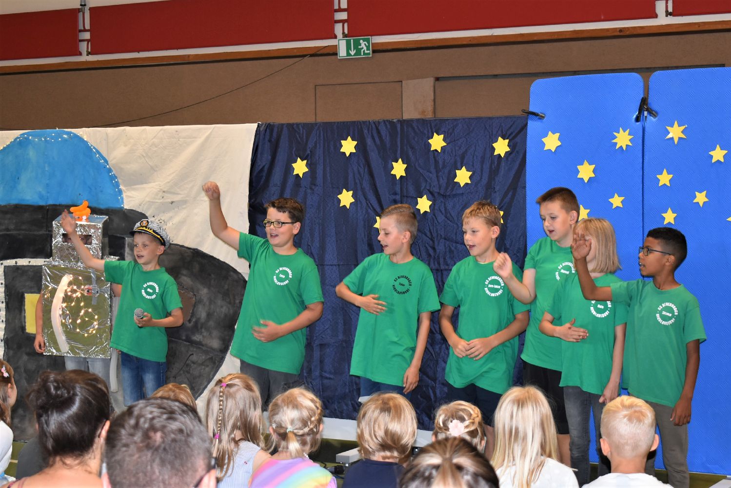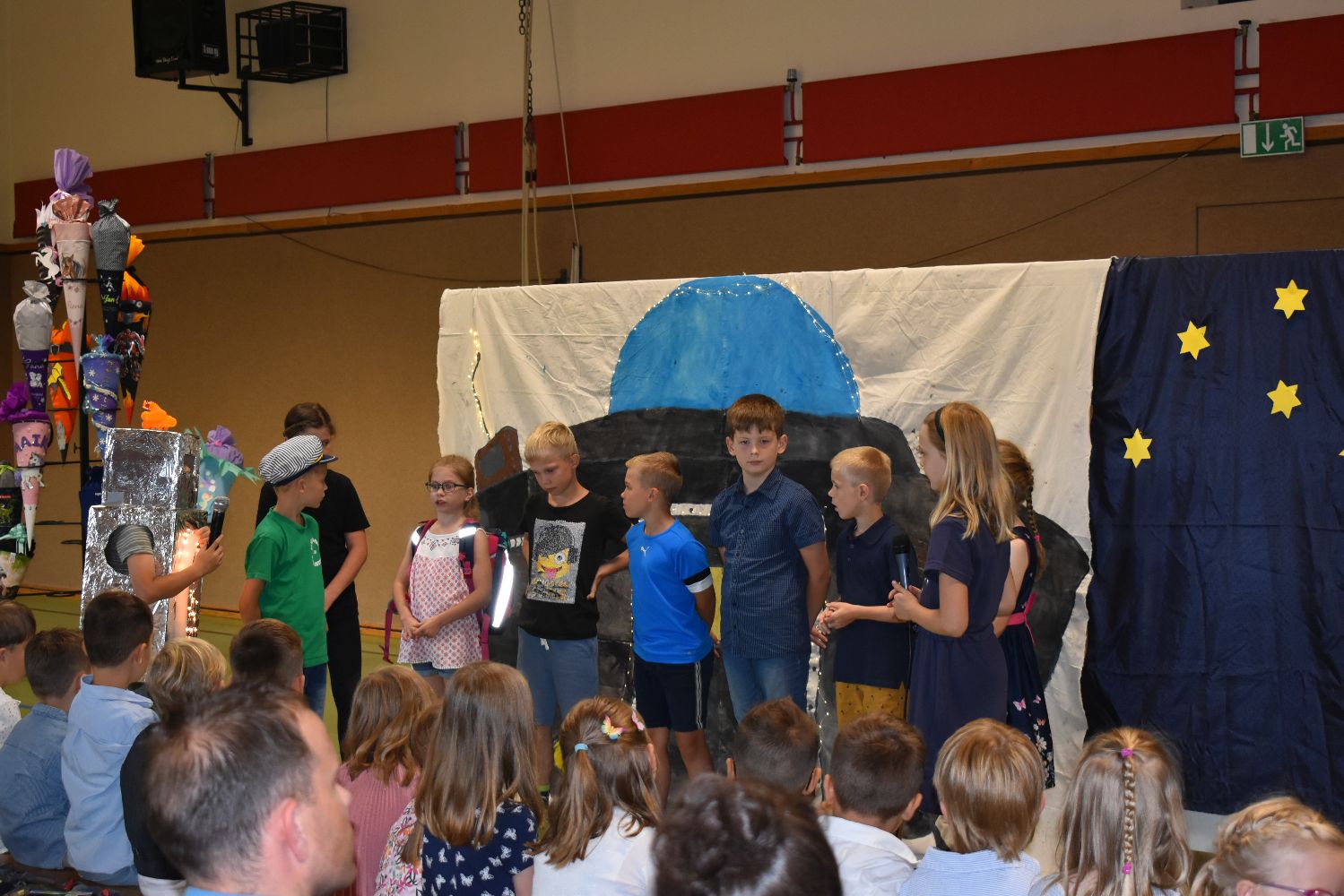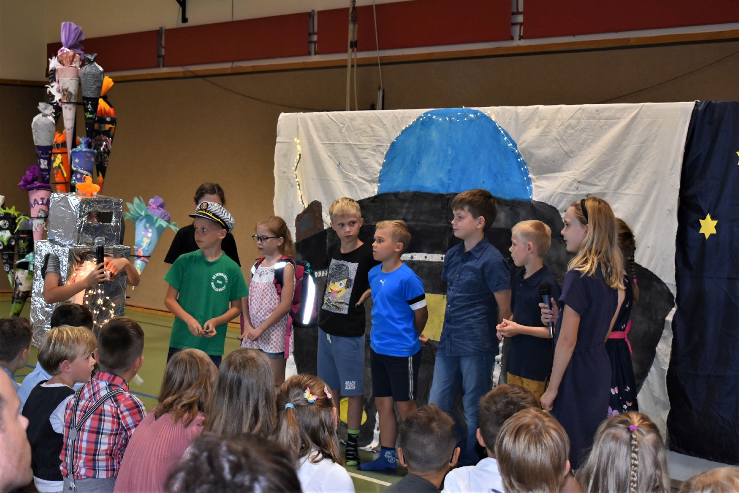 Im Anschluss daran versammelten sich Eltern, Kinder, Lehrer, Gäste und natürlich unsere Erstklässler in der Beverbrucher Turnhalle. Die Schülerinnen und Schüler der Klasse 4 hatten unter der Leitung von Frau Kaiser die diesjährige Einschulungsfeier vorbereitet und unterhielten unsere Schulneulinge mit einem Willkommenslied und dem Musical von den “Grünquatschlingen“. Das sind sympathische Außerirdische, die in Beverbruch eine neue Heimat finden und gemeinsam mit den Erstklässlern lernen wollen. nicht schreiben konnte. Im Anschluss daran überreichten die Klassenlehrkräfte die wunderschönen Schultüten an die Kinder.