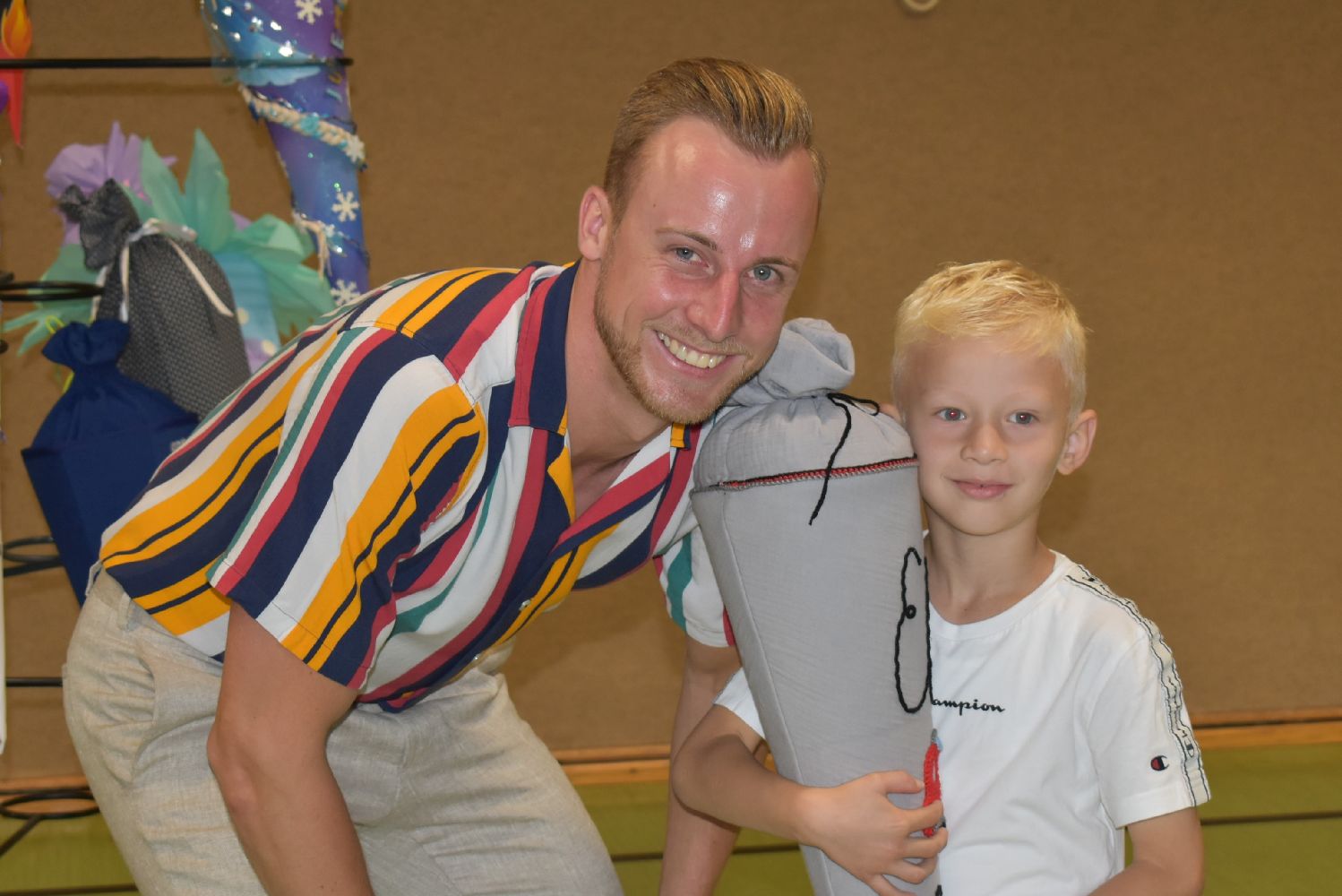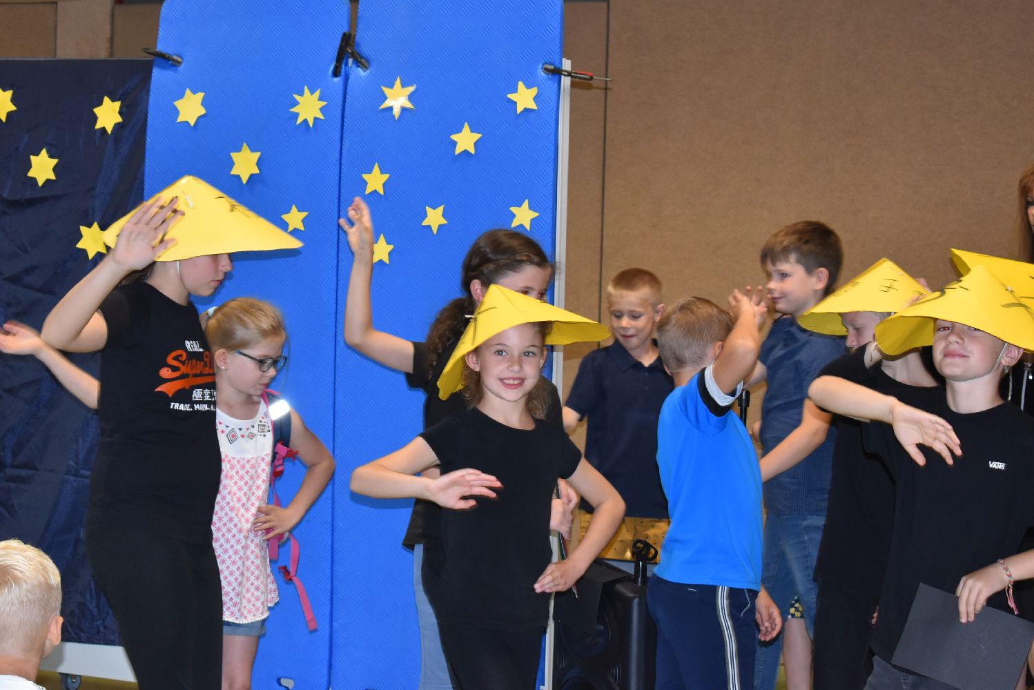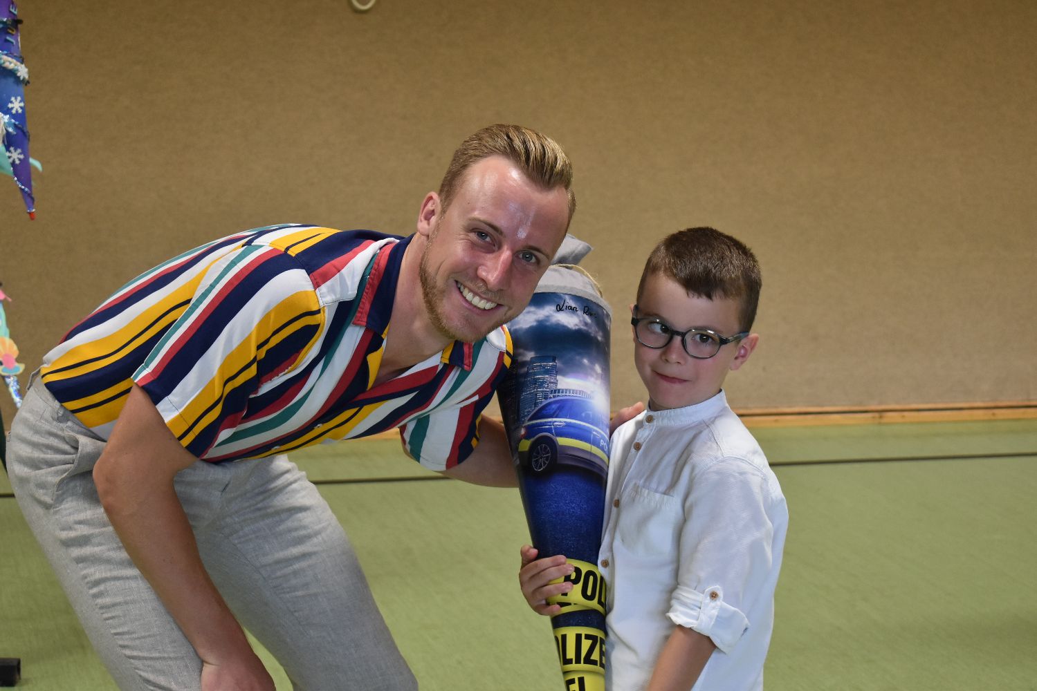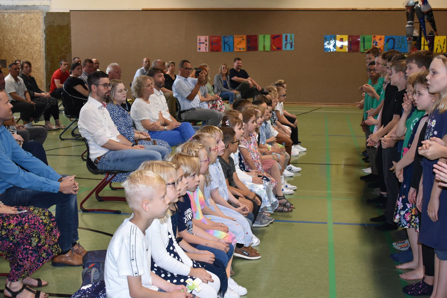 Im Anschluss daran versammelten sich Eltern, Kinder, Lehrer, Gäste und natürlich unsere Erstklässler in der Beverbrucher Turnhalle. Die Schülerinnen und Schüler der Klasse 4 hatten unter der Leitung von Frau Kaiser die diesjährige Einschulungsfeier vorbereitet und unterhielten unsere Schulneulinge mit einem Willkommenslied und dem Musical von den “Grünquatschlingen“. Das sind sympathische Außerirdische, die in Beverbruch eine neue Heimat finden und gemeinsam mit den Erstklässlern lernen wollen. nicht schreiben konnte. Im Anschluss daran überreichten die Klassenlehrkräfte die wunderschönen Schultüten an die Kinder.