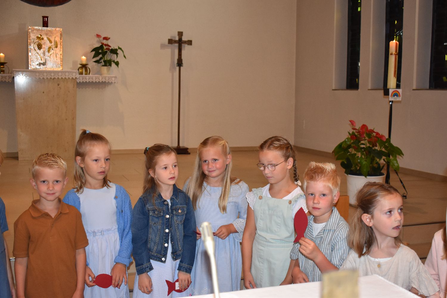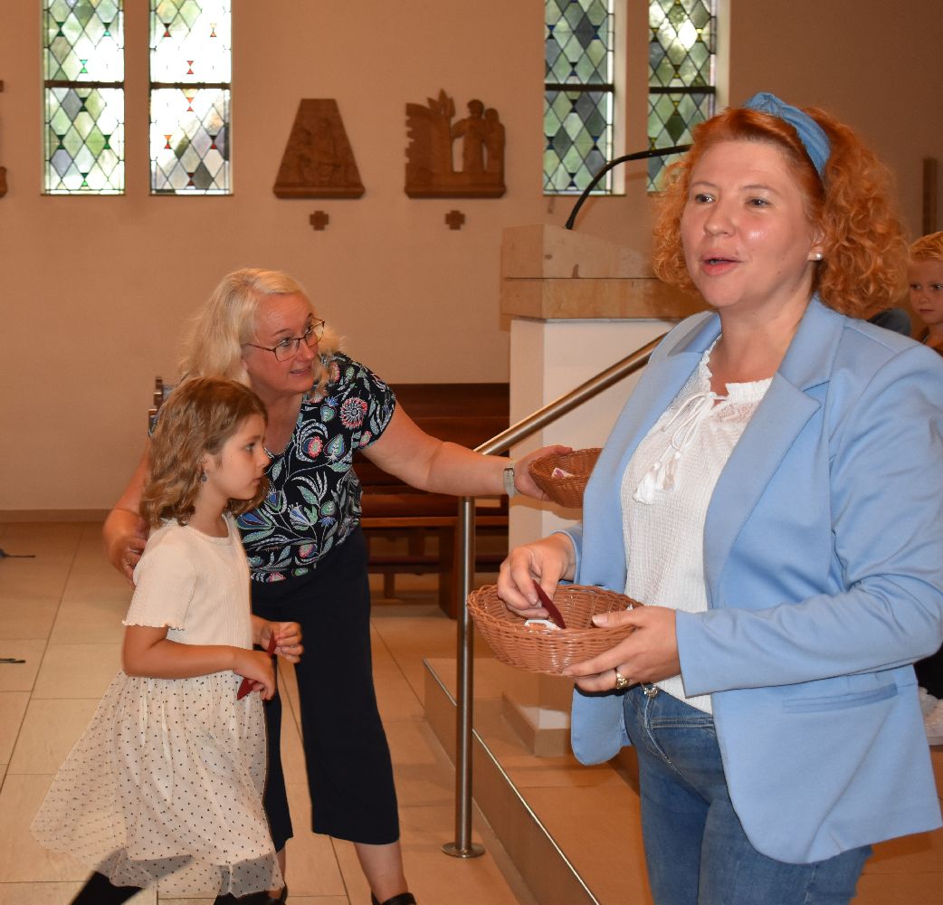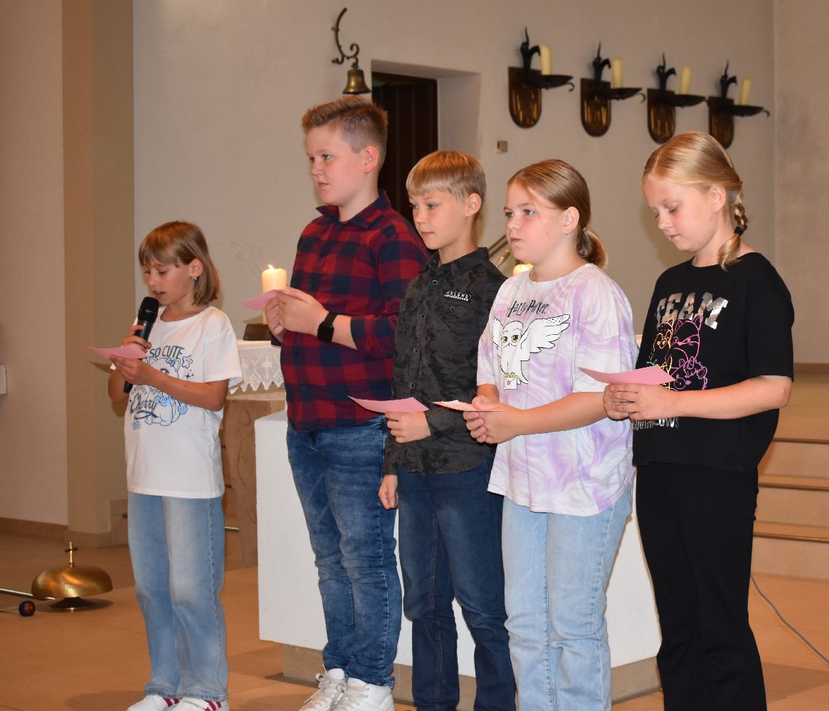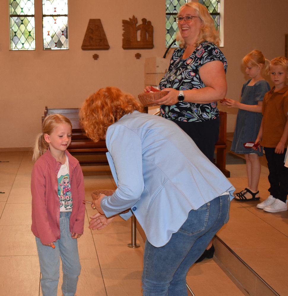 Unter diesem Motto wurden am Samstag, dem 10.08.2024, 31 Schüler/innen feierlich in unsere Schulgemeinschaft aufgenommen. Die Einschulungsfeier begann um 9.00 Uhr mit einem ökumenischen Wortgottesdienst in der St-Josef-Kirche in Beverbruch. Im Mittelpunkt stand die Geschichte von Swimmy, einem kleinen Fisch, der erfahren darf, dass man gemeinsam vieles schaffen kann. Zur Erinnerung an diesen Wortgottesdienst erhielten die Kinder der Klassen 1a und 1b einen kleinen Fisch mit ihrem Namen. Herzlichen Dank an Frau Hinxlage für die gelungene Vorbereitung des Wortgottesdienstes!