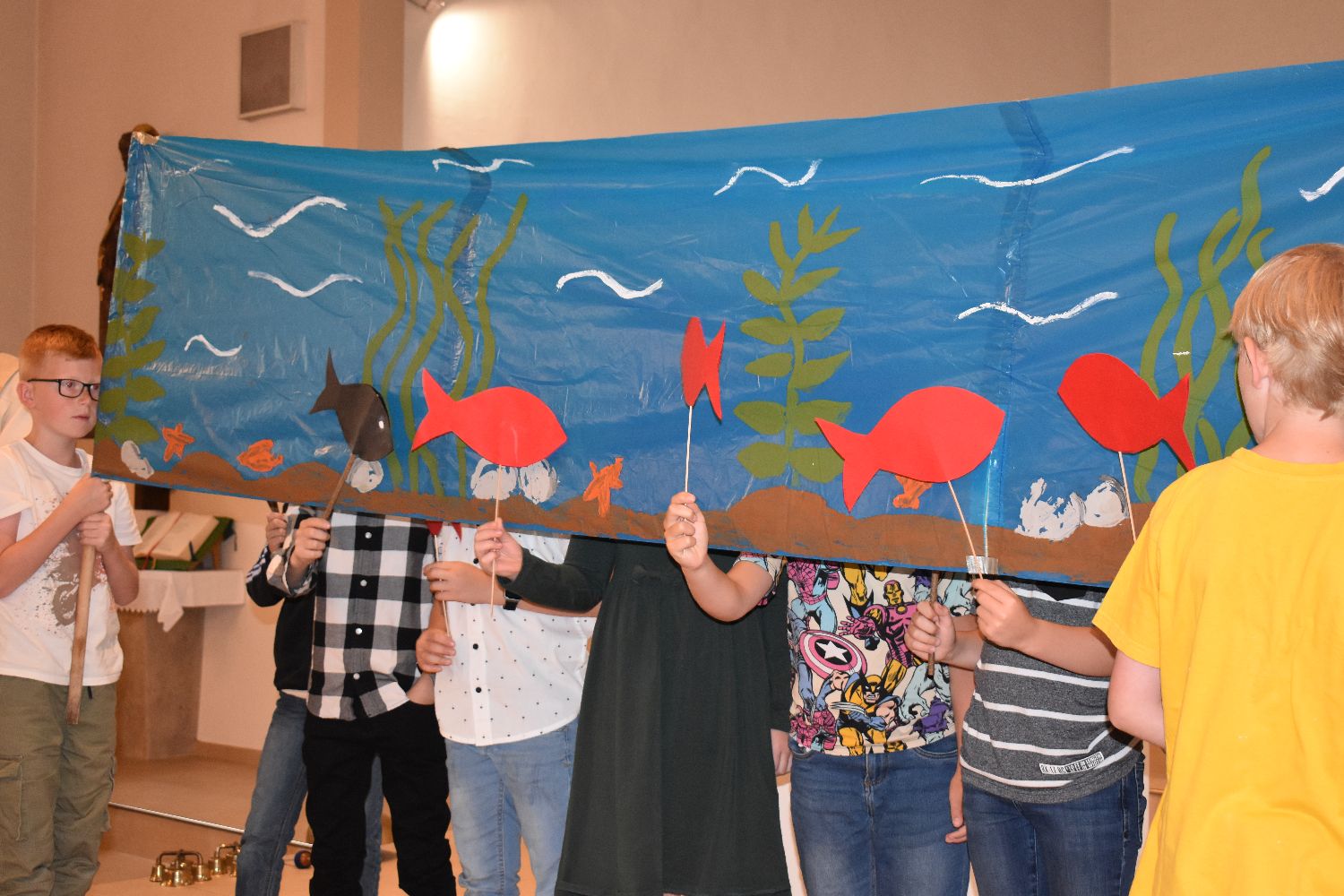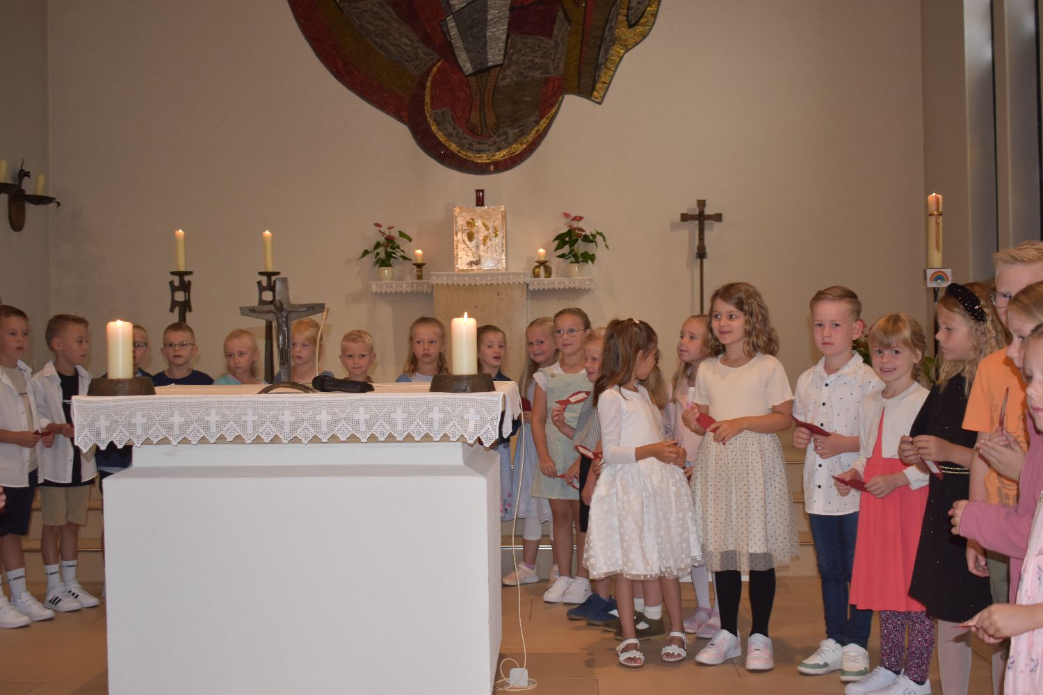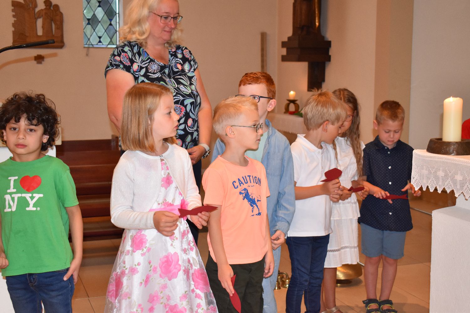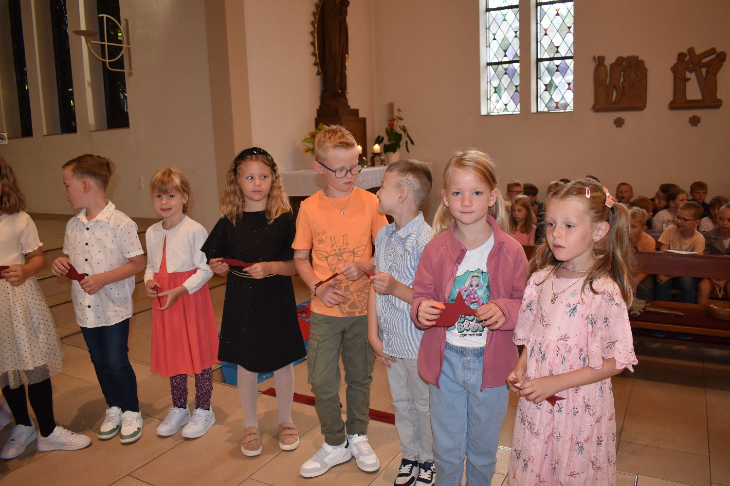 Unter diesem Motto wurden am Samstag, dem 10.08.2024, 31 Schüler/innen feierlich in unsere Schulgemeinschaft aufgenommen. Die Einschulungsfeier begann um 9.00 Uhr mit einem ökumenischen Wortgottesdienst in der St-Josef-Kirche in Beverbruch. Im Mittelpunkt stand die Geschichte von Swimmy, einem kleinen Fisch, der erfahren darf, dass man gemeinsam vieles schaffen kann. Zur Erinnerung an diesen Wortgottesdienst erhielten die Kinder der Klassen 1a und 1b einen kleinen Fisch mit ihrem Namen. Herzlichen Dank an Frau Hinxlage für die gelungene Vorbereitung des Wortgottesdienstes!