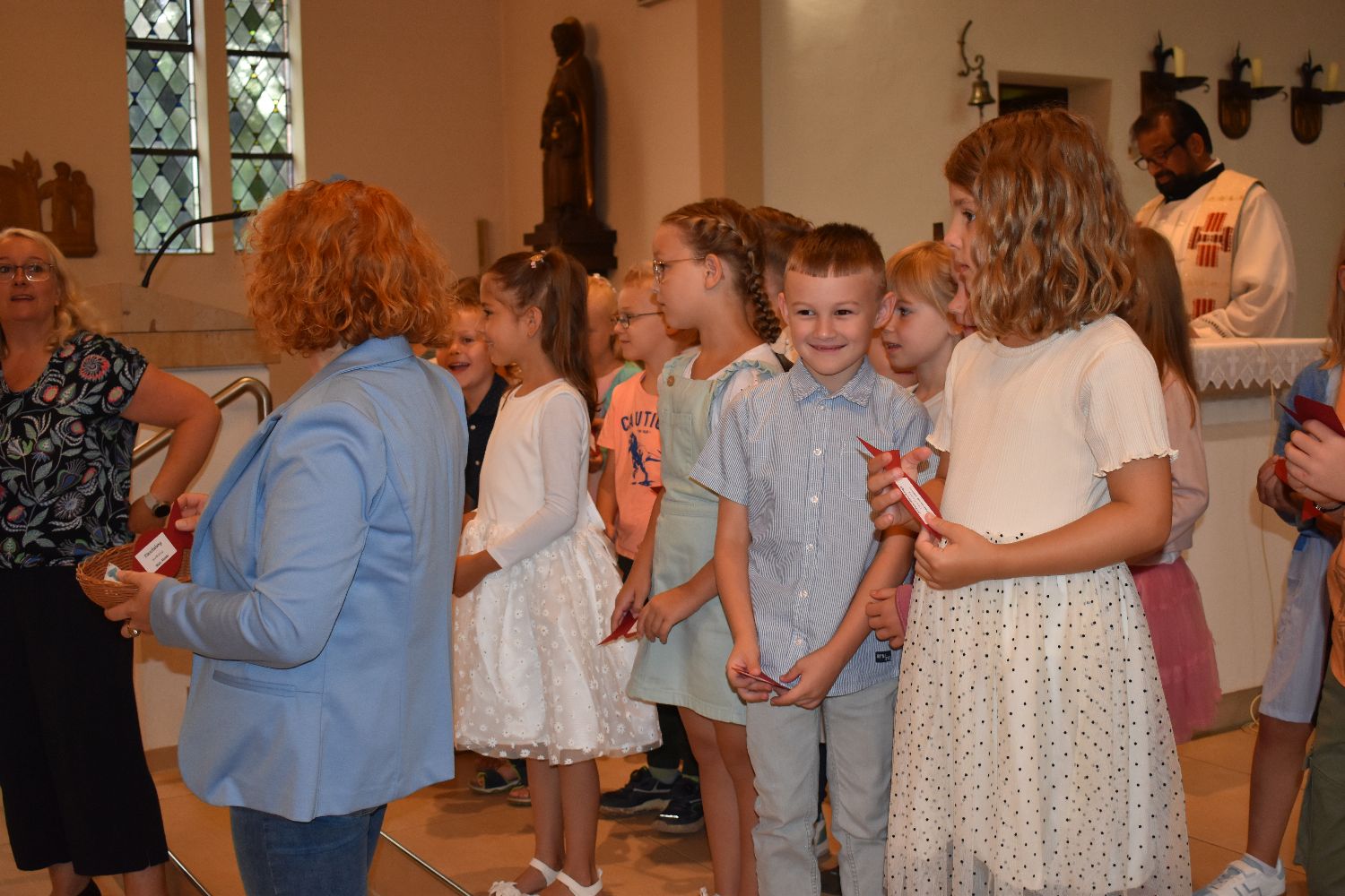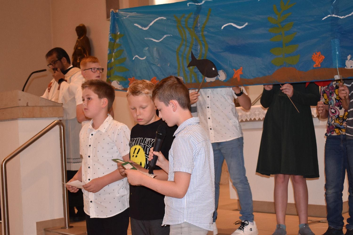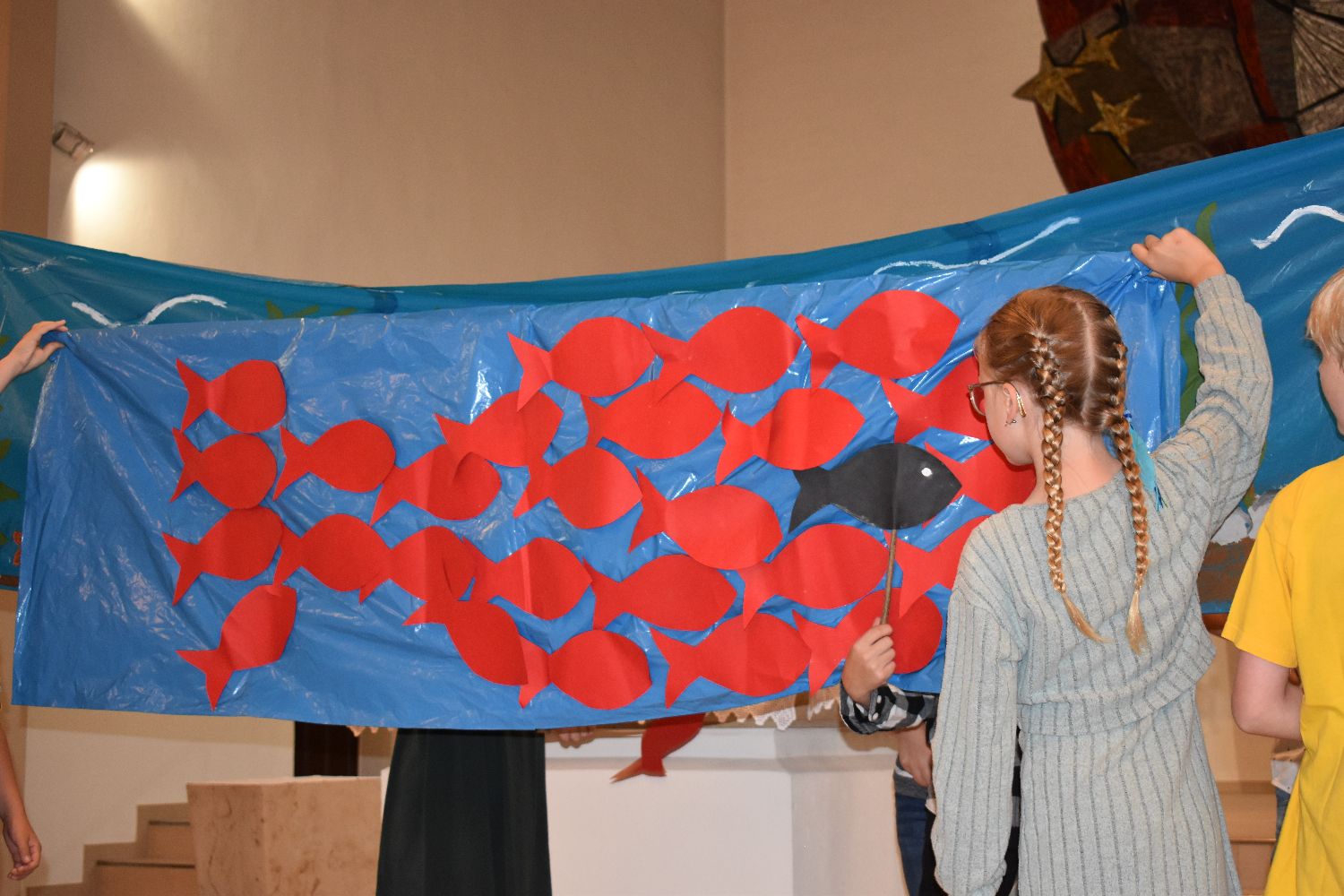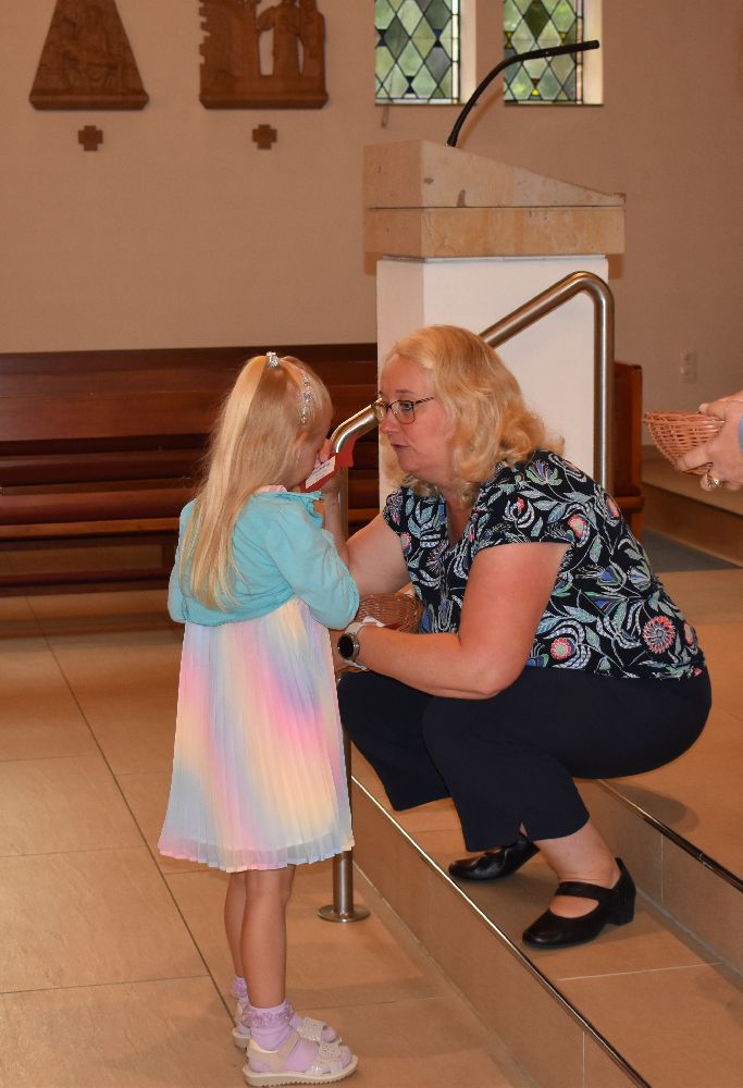 Unter diesem Motto wurden am Samstag, dem 10.08.2024, 31 Schüler/innen feierlich in unsere Schulgemeinschaft aufgenommen. Die Einschulungsfeier begann um 9.00 Uhr mit einem ökumenischen Wortgottesdienst in der St-Josef-Kirche in Beverbruch. Im Mittelpunkt stand die Geschichte von Swimmy, einem kleinen Fisch, der erfahren darf, dass man gemeinsam vieles schaffen kann. Zur Erinnerung an diesen Wortgottesdienst erhielten die Kinder der Klassen 1a und 1b einen kleinen Fisch mit ihrem Namen. Herzlichen Dank an Frau Hinxlage für die gelungene Vorbereitung des Wortgottesdienstes!