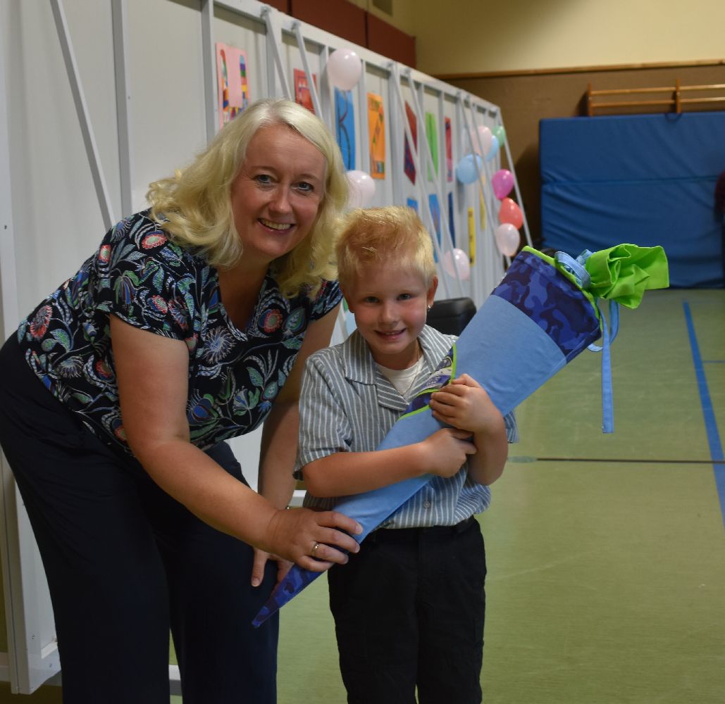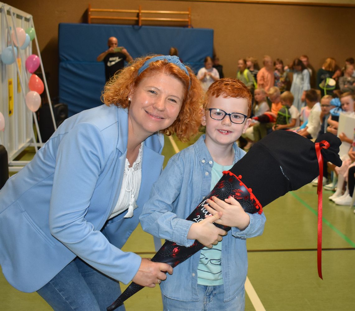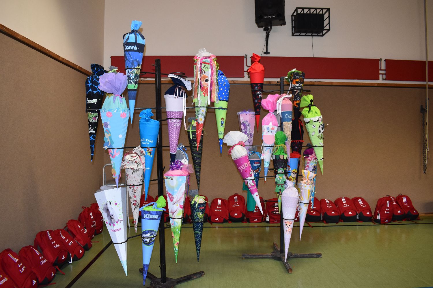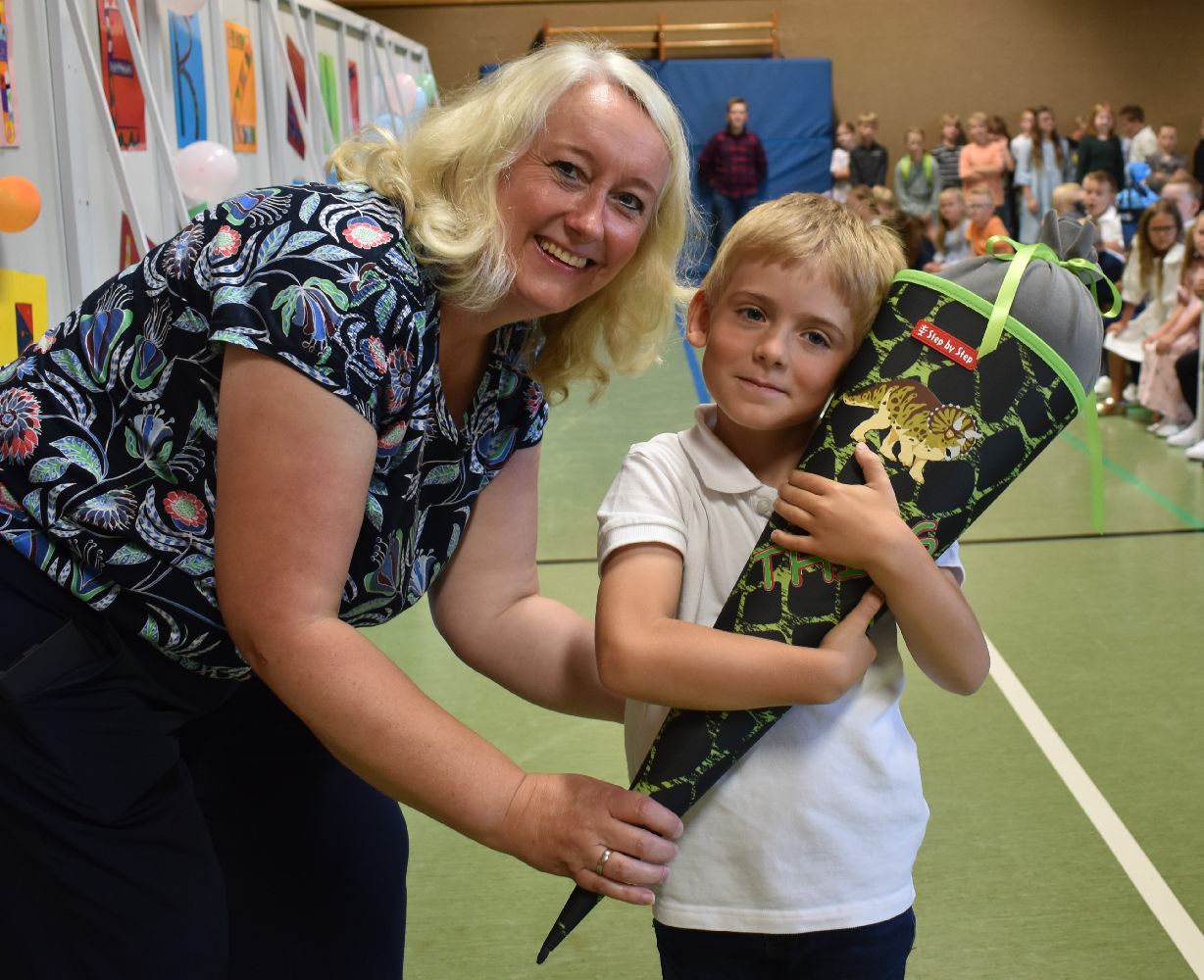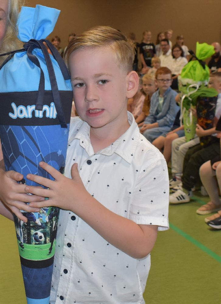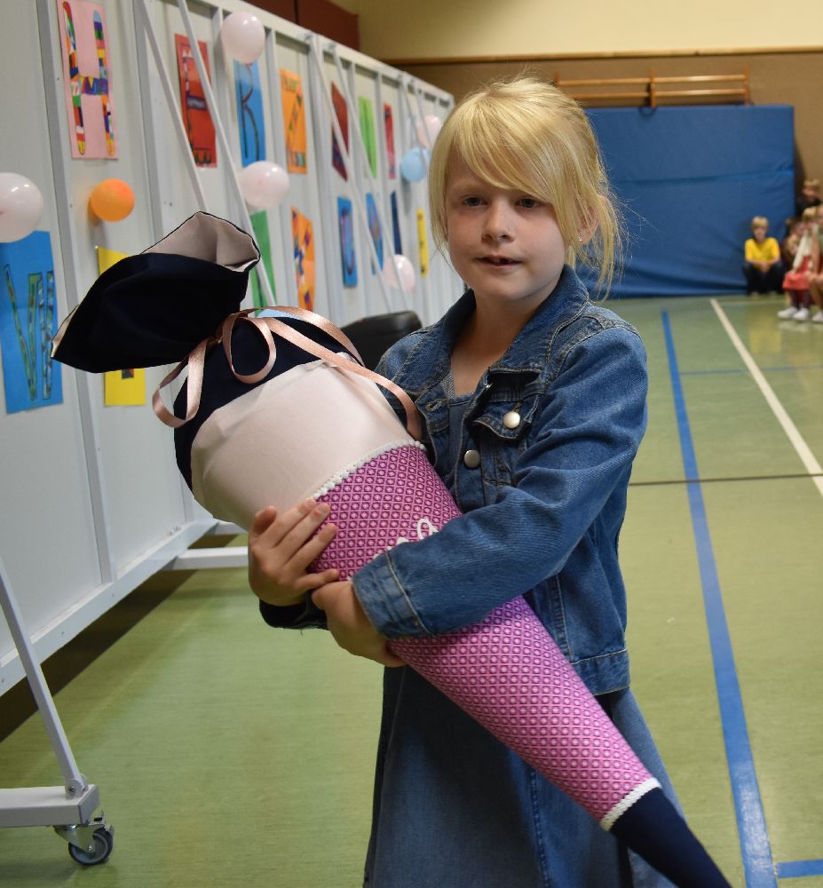 Im Anschluss daran versammelten sich Eltern, Kinder, Lehrer, Gäste und natürlich unsere Erstklässler in der Beverbrucher Turnhalle. Die Schülerinnen und Schüler der Klasse 4 hatten unter der Leitung von Frau Hensel und Herrn Ziplys die diesjährige Einschulungsfeier vorbereitet und unterhielten unsere Schulneulinge mit einem Willkommensliedern und kleinen Sketchen aus dem Schulalltag. Im Anschluss daran überreichten die Lehrkräfte die wunderschönen Schultüten an die Kinder.