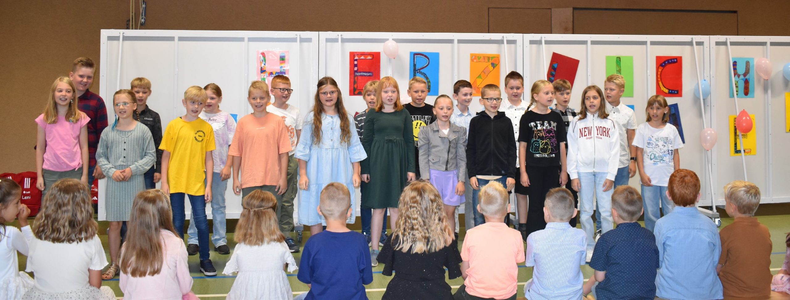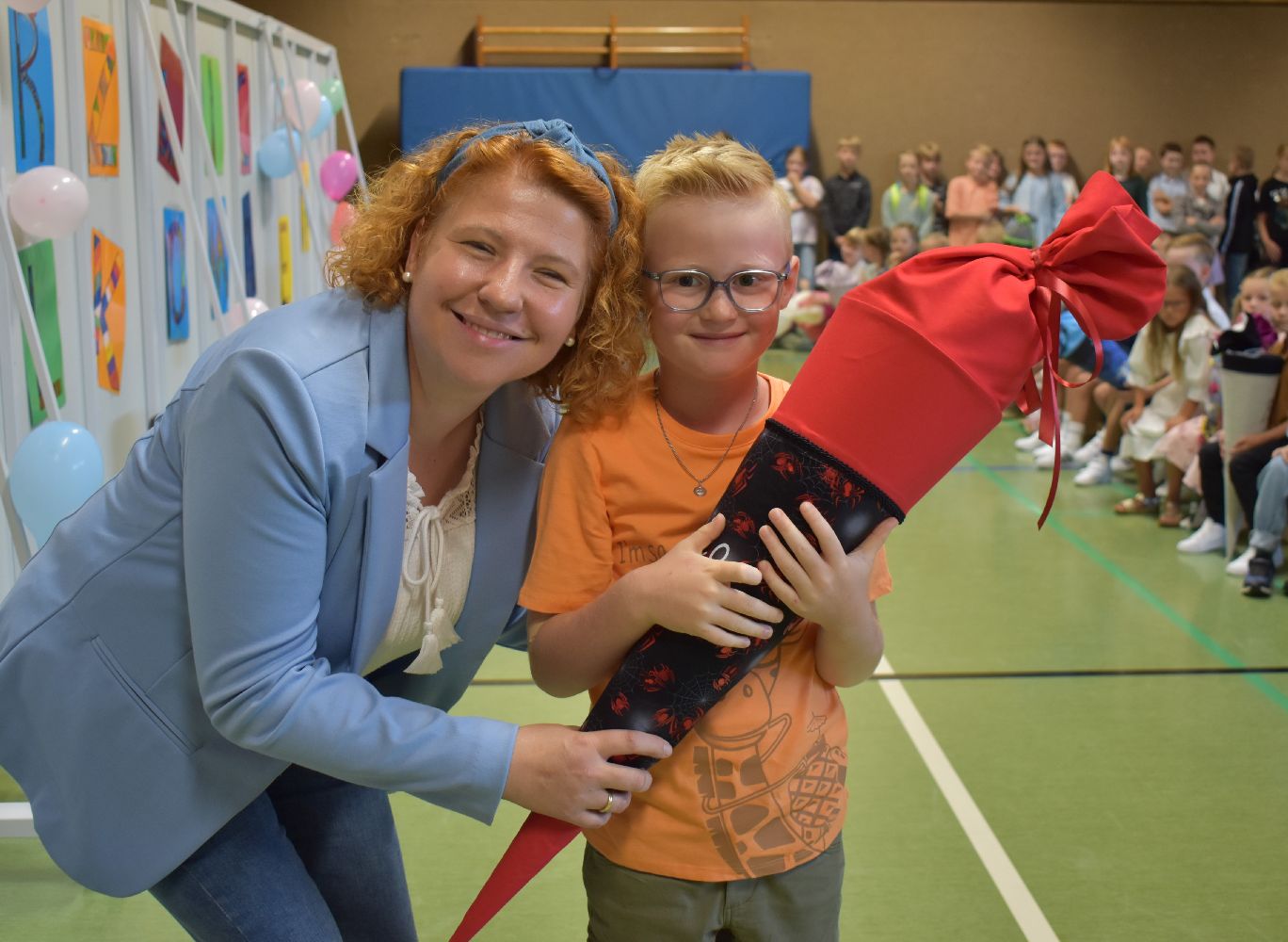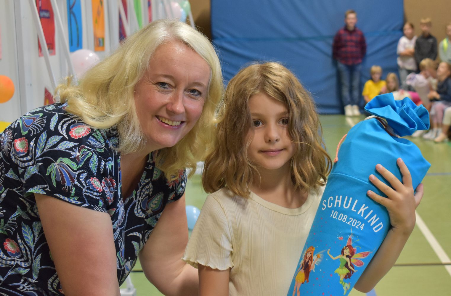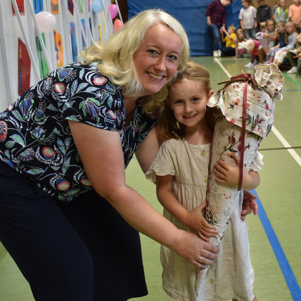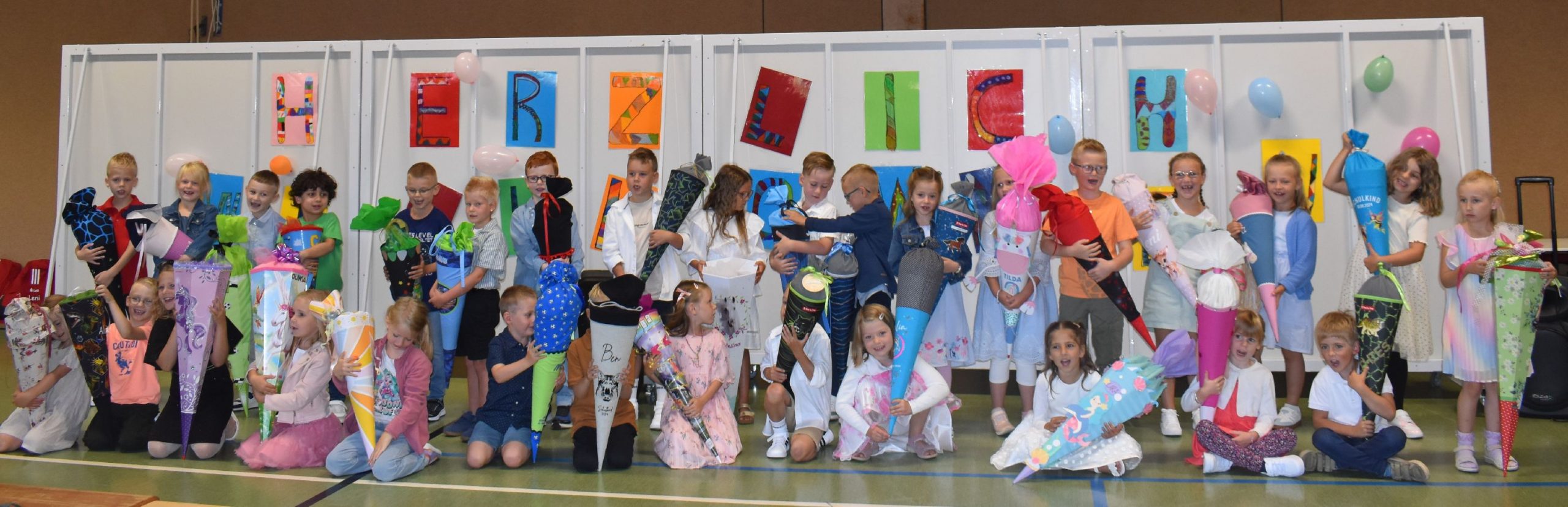 Im Anschluss daran versammelten sich Eltern, Kinder, Lehrer, Gäste und natürlich unsere Erstklässler in der Beverbrucher Turnhalle. Die Schülerinnen und Schüler der Klasse 4 hatten unter der Leitung von Frau Hensel und Herrn Ziplys die diesjährige Einschulungsfeier vorbereitet und unterhielten unsere Schulneulinge mit einem Willkommensliedern und kleinen Sketchen aus dem Schulalltag. Im Anschluss daran überreichten die Lehrkräfte die wunderschönen Schultüten an die Kinder.