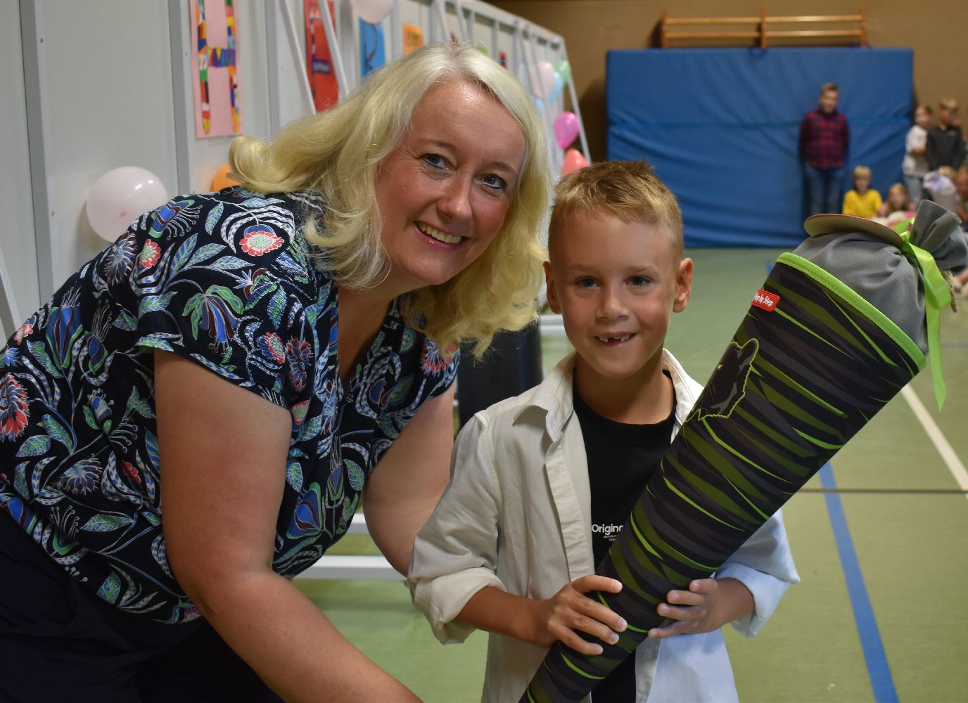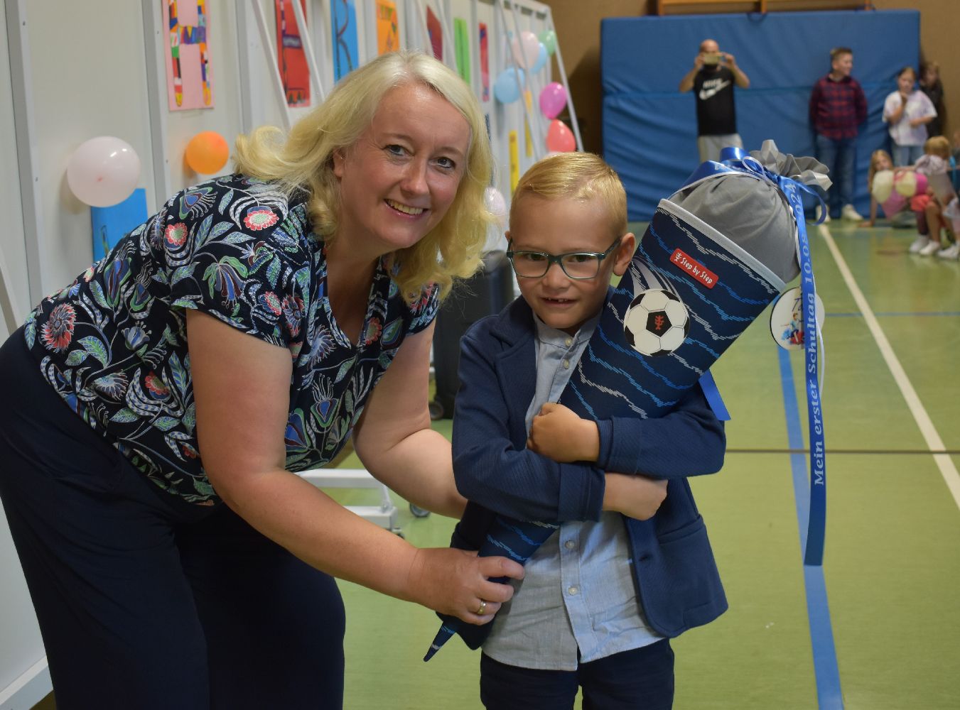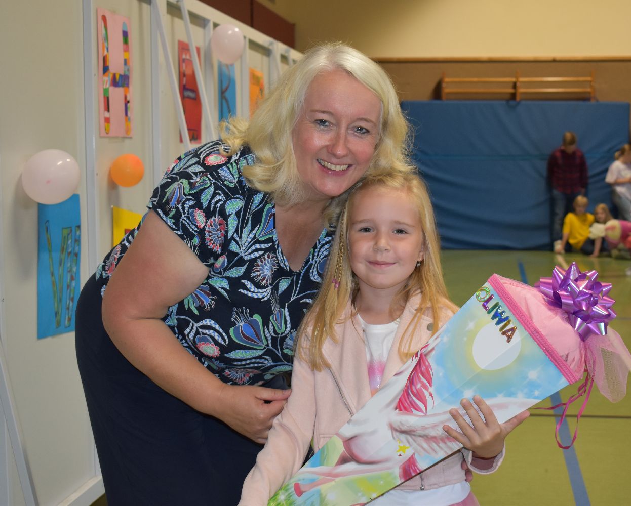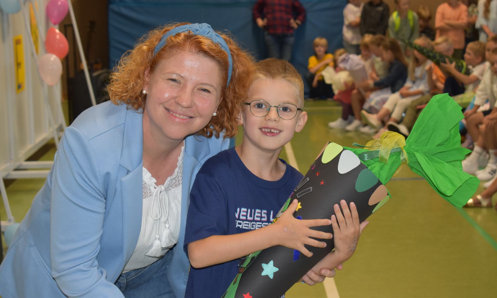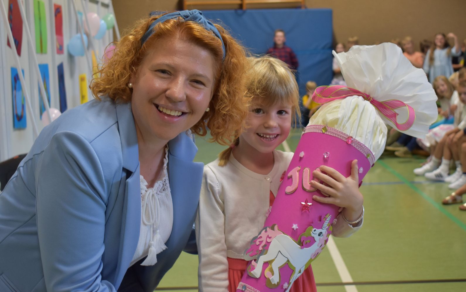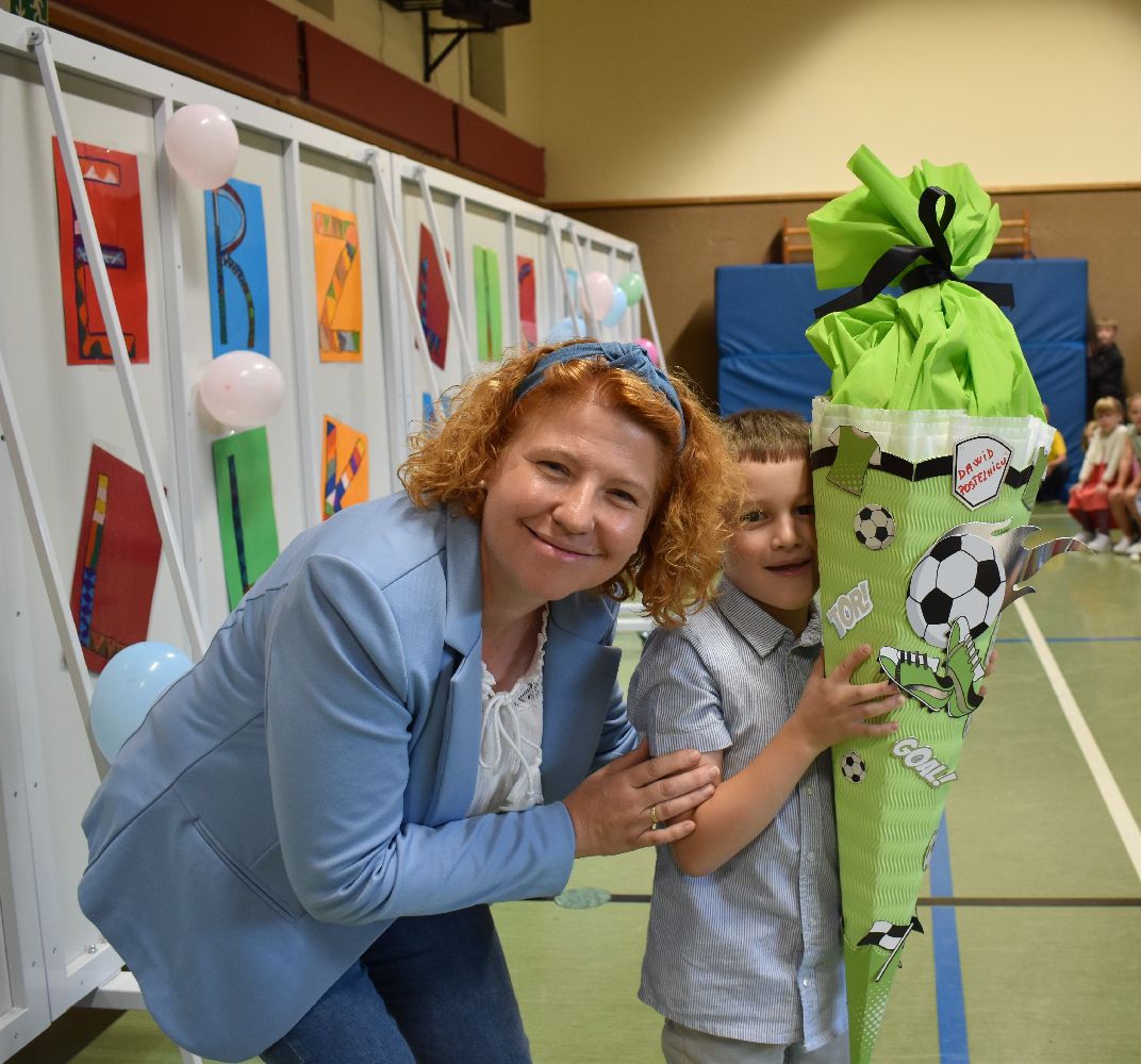 Im Anschluss daran versammelten sich Eltern, Kinder, Lehrer, Gäste und natürlich unsere Erstklässler in der Beverbrucher Turnhalle. Die Schülerinnen und Schüler der Klasse 4 hatten unter der Leitung von Frau Hensel und Herrn Ziplys die diesjährige Einschulungsfeier vorbereitet und unterhielten unsere Schulneulinge mit einem Willkommensliedern und kleinen Sketchen aus dem Schulalltag. Im Anschluss daran überreichten die Lehrkräfte die wunderschönen Schultüten an die Kinder.