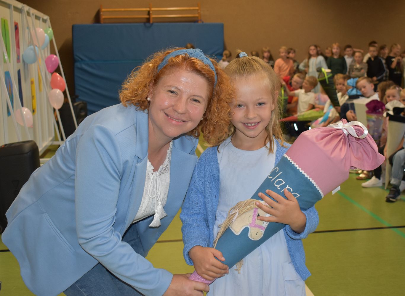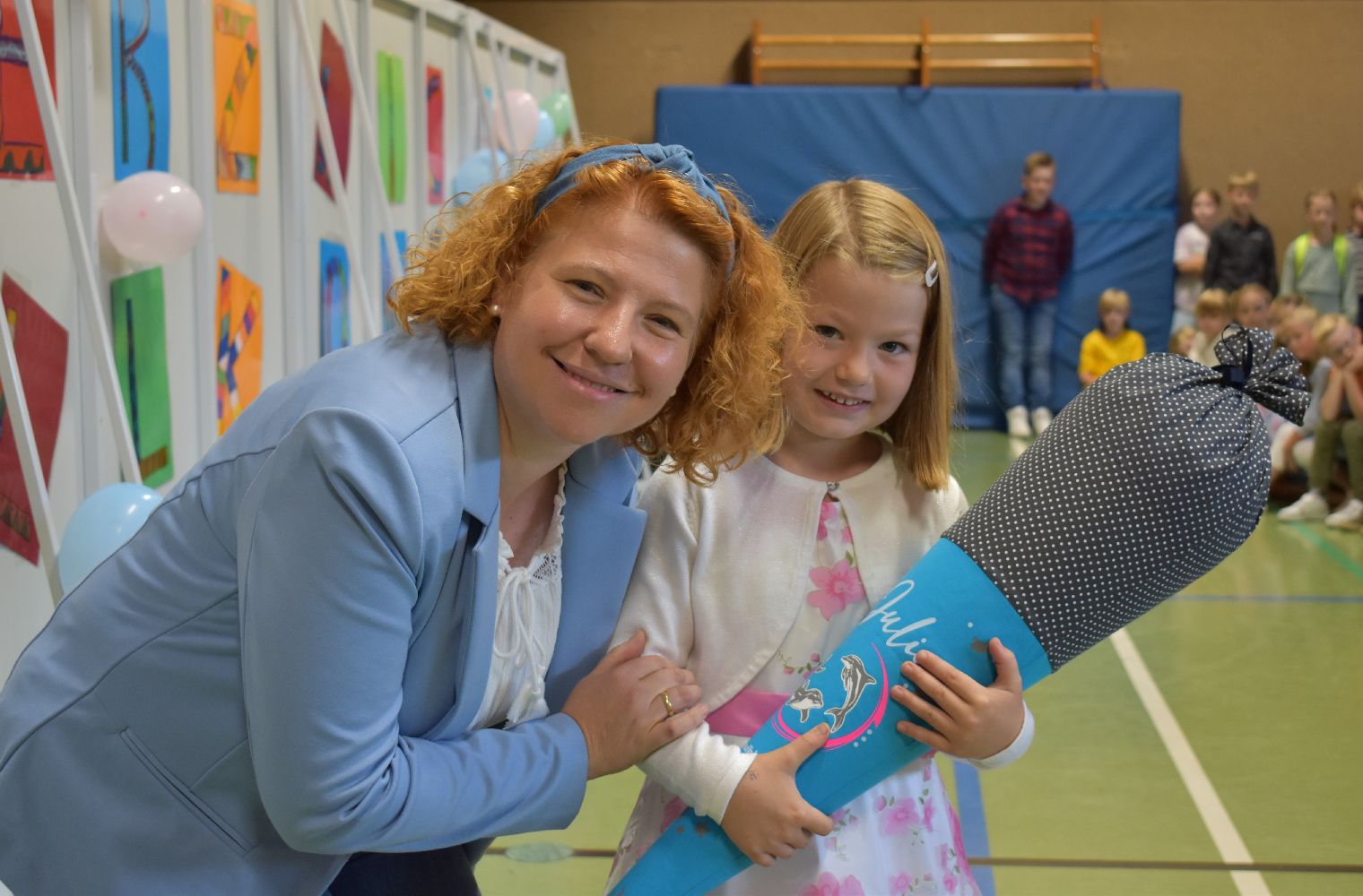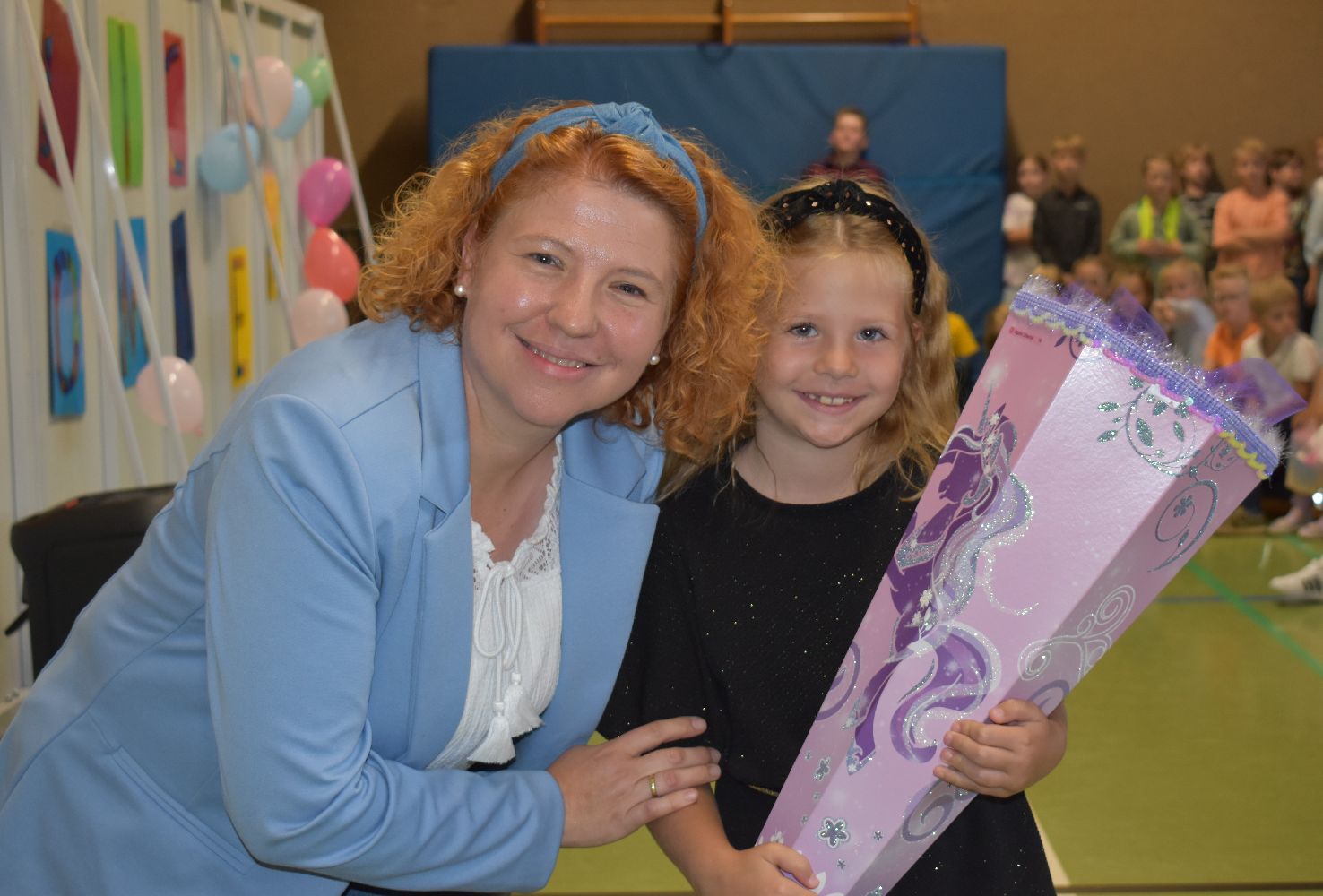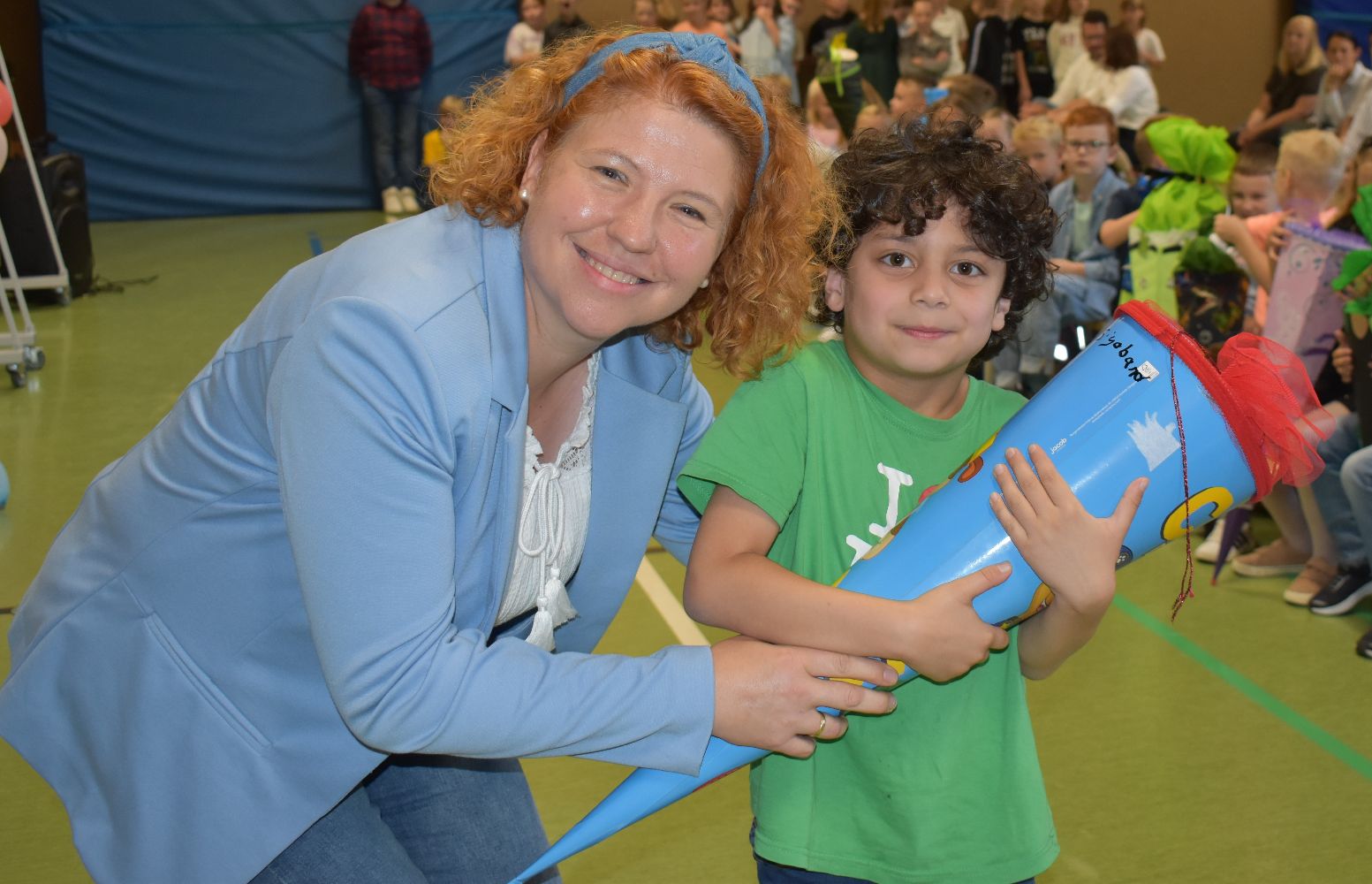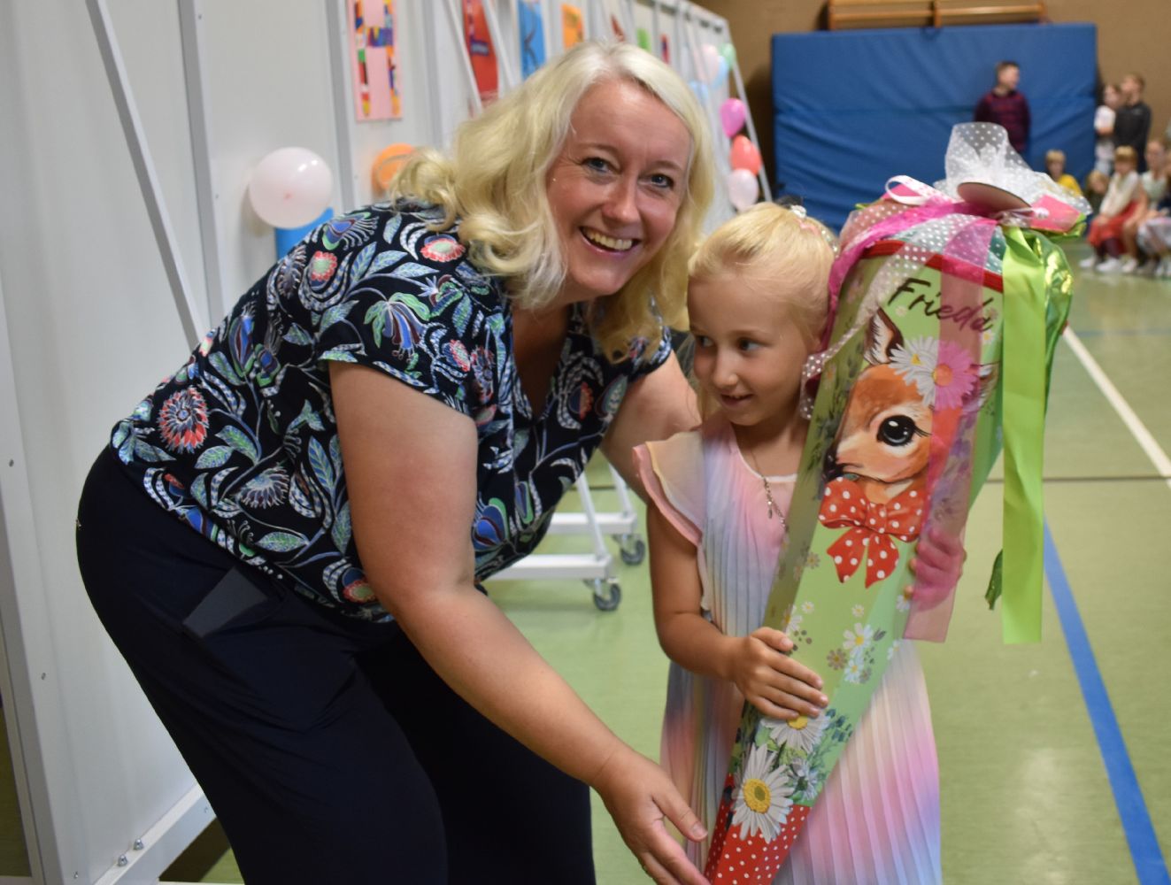 Im Anschluss daran versammelten sich Eltern, Kinder, Lehrer, Gäste und natürlich unsere Erstklässler in der Beverbrucher Turnhalle. Die Schülerinnen und Schüler der Klasse 4 hatten unter der Leitung von Frau Hensel und Herrn Ziplys die diesjährige Einschulungsfeier vorbereitet und unterhielten unsere Schulneulinge mit einem Willkommensliedern und kleinen Sketchen aus dem Schulalltag. Im Anschluss daran überreichten die Lehrkräfte die wunderschönen Schultüten an die Kinder.