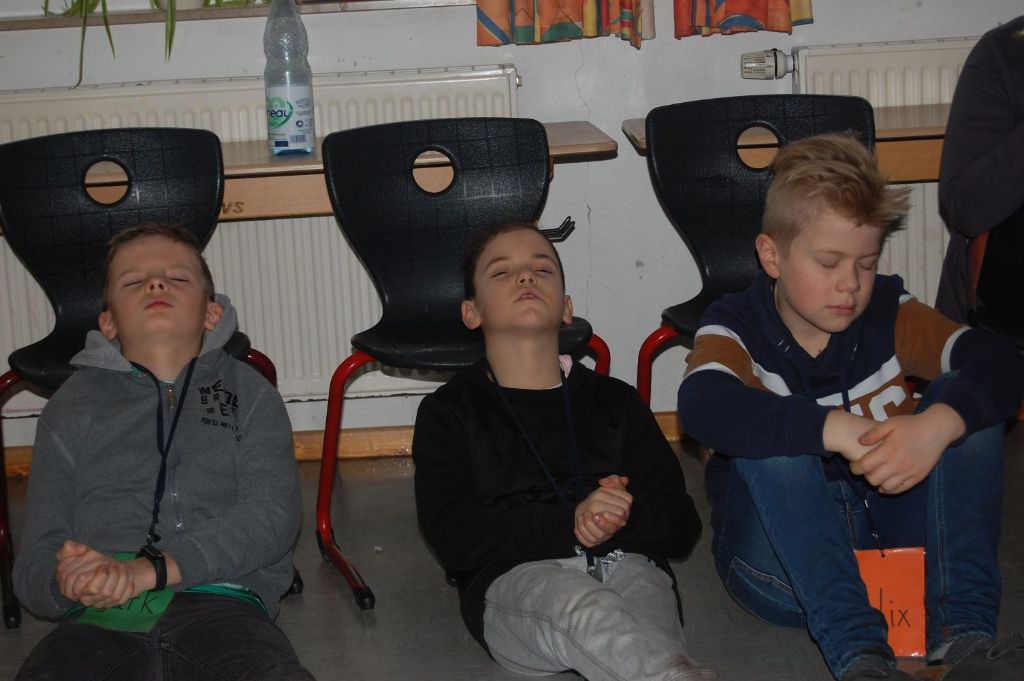 Mit dem 5. Tag, dem grünen Tag“, der den Trost und das Trösten thematisierte, neigte sich die Projektwoche ihrem Ende entgegen. Die Kinder schrieben für eine bestimmte Person einen Trostbrief und beschrifteten die Blätter einer “Bohnenranke“ mit Möglichkeiten des Tröstens im Schulalltag. Symbolisch legten die Kinder dann in einem „Lastentanz“ die schwere Thematik dieser Woche ab und tanzten befreit in die Verabschiedungsrunde hinein, in der unser gemeinsames Lied zum letzten Mal gesungen und das geknüpfte Band wieder gelöst wurde. Mit einer sehr schönen Abschiedsfeier, zu der auch die Eltern eingeladen waren und alle Gruppen noch einmal von ihren Erfahrungen berichteten, endete unsere Projektwoche.