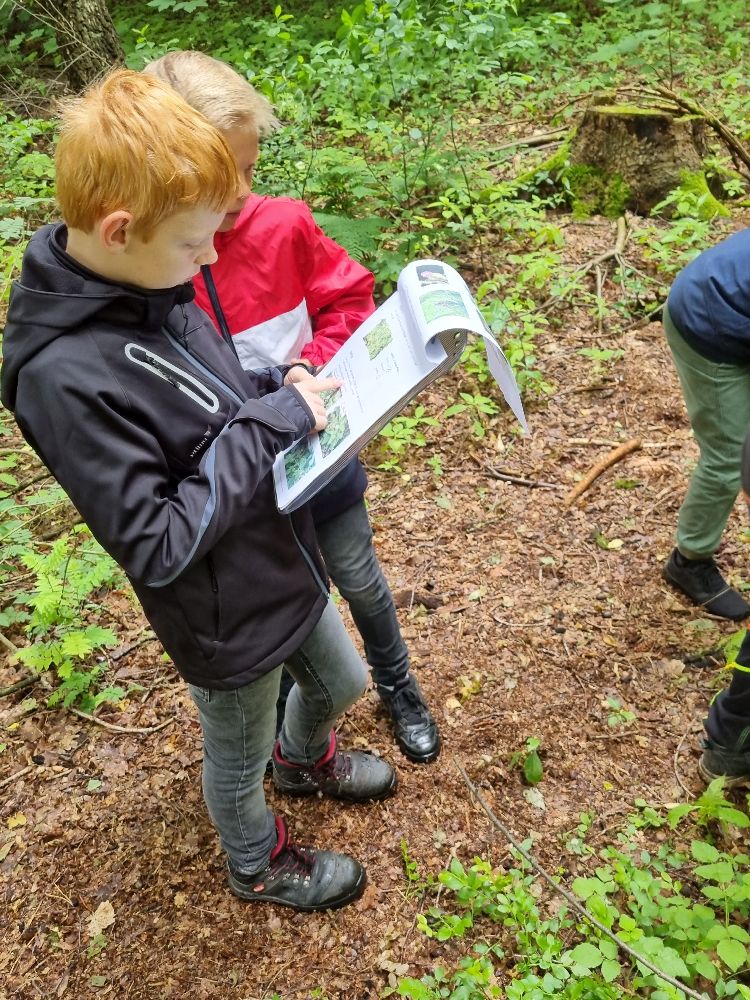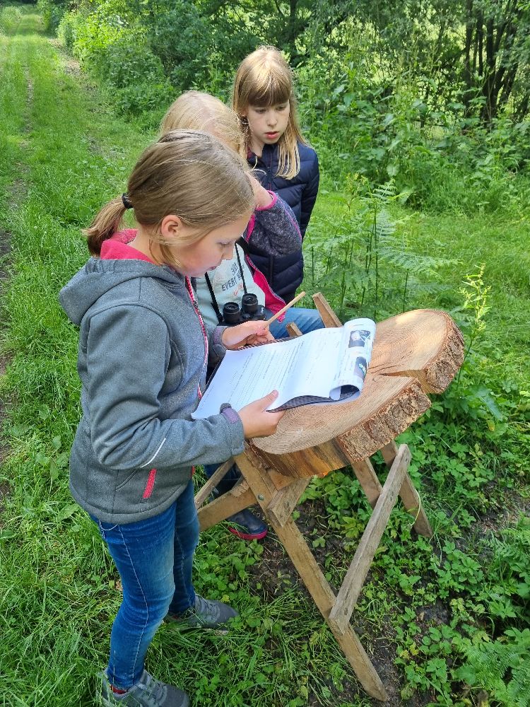 Nach einer gemeinsamen Frühstückspause ging es dann über in den zweiten Teil des Programms: In einem Walderlebnispfad entdeckten die Kinder in Kleingruppen Besonderheiten und Faszinationen des Waldes. Der vorbereitete Quizzettel, der sich auf verschiedene Waldstationen bezog, motivierte die Kinder auch hier sehr. Durch zielgerichtete Aufgaben konnten sie den Wald intensiv mit ihren Sinnen wahrnehmen. Fragen wie: „Wer macht eigentlich die Löcher in den Baumstamm?“ A„Wessen Fußspuren sehe ich hier?“ oder „Was kann ich alles im Wald hören?“ wurden eigenständig und mit viel „Entdeckerfreude“ beantwortet. Die Auflösung der Quizfragen am Ende zeigte, dass die Kinder die Besonderheiten des Waldes mit viel Freude intensiv wahrgenommen haben. So zogen auch alle Kinder das Fazit: Ein gelungener Tagesausflug, bei dem mit viel Spaß so einiges gelernt werden konnte!