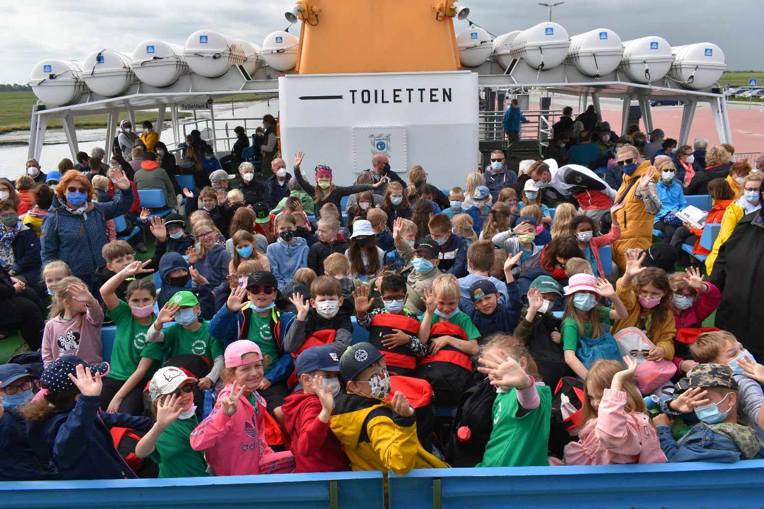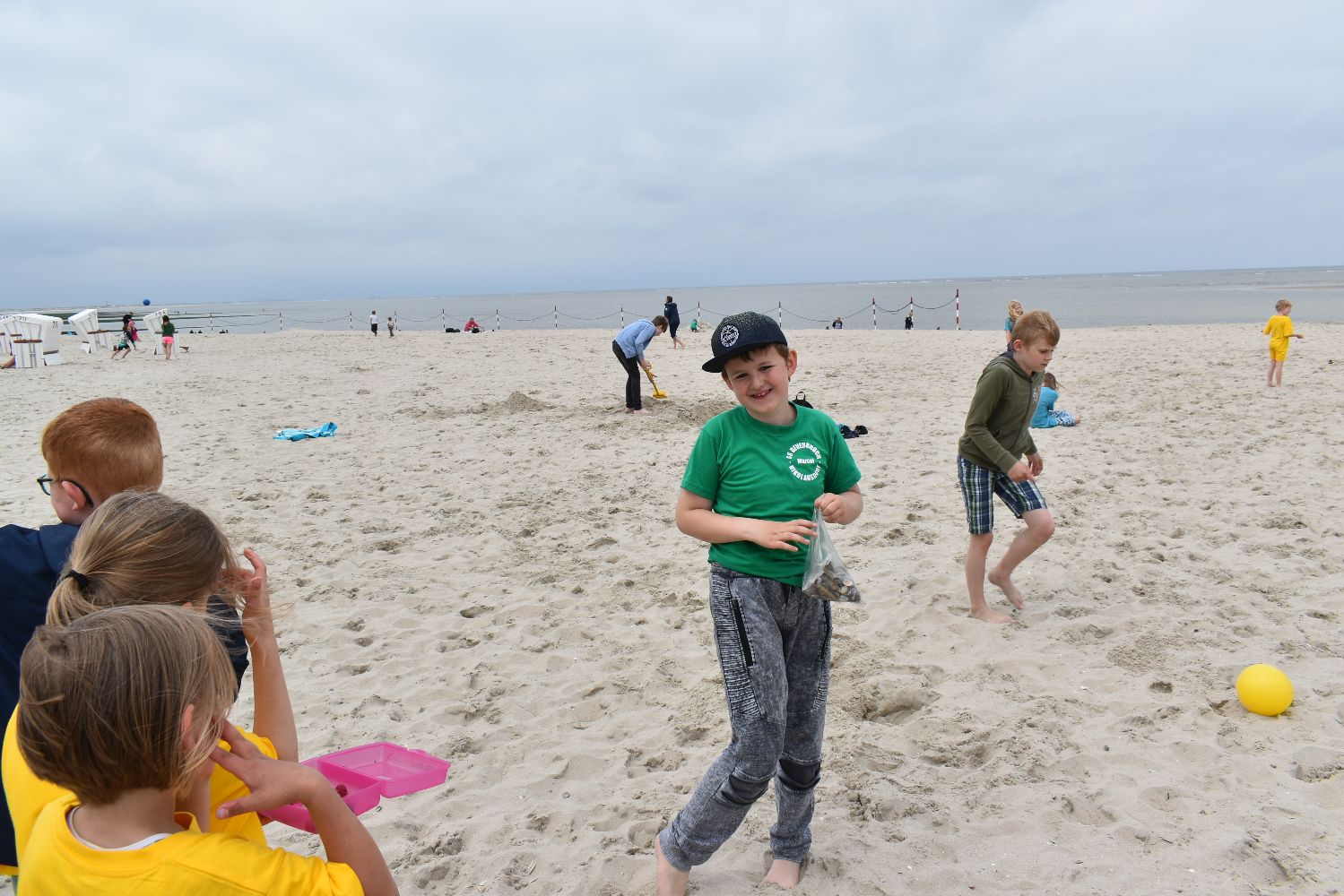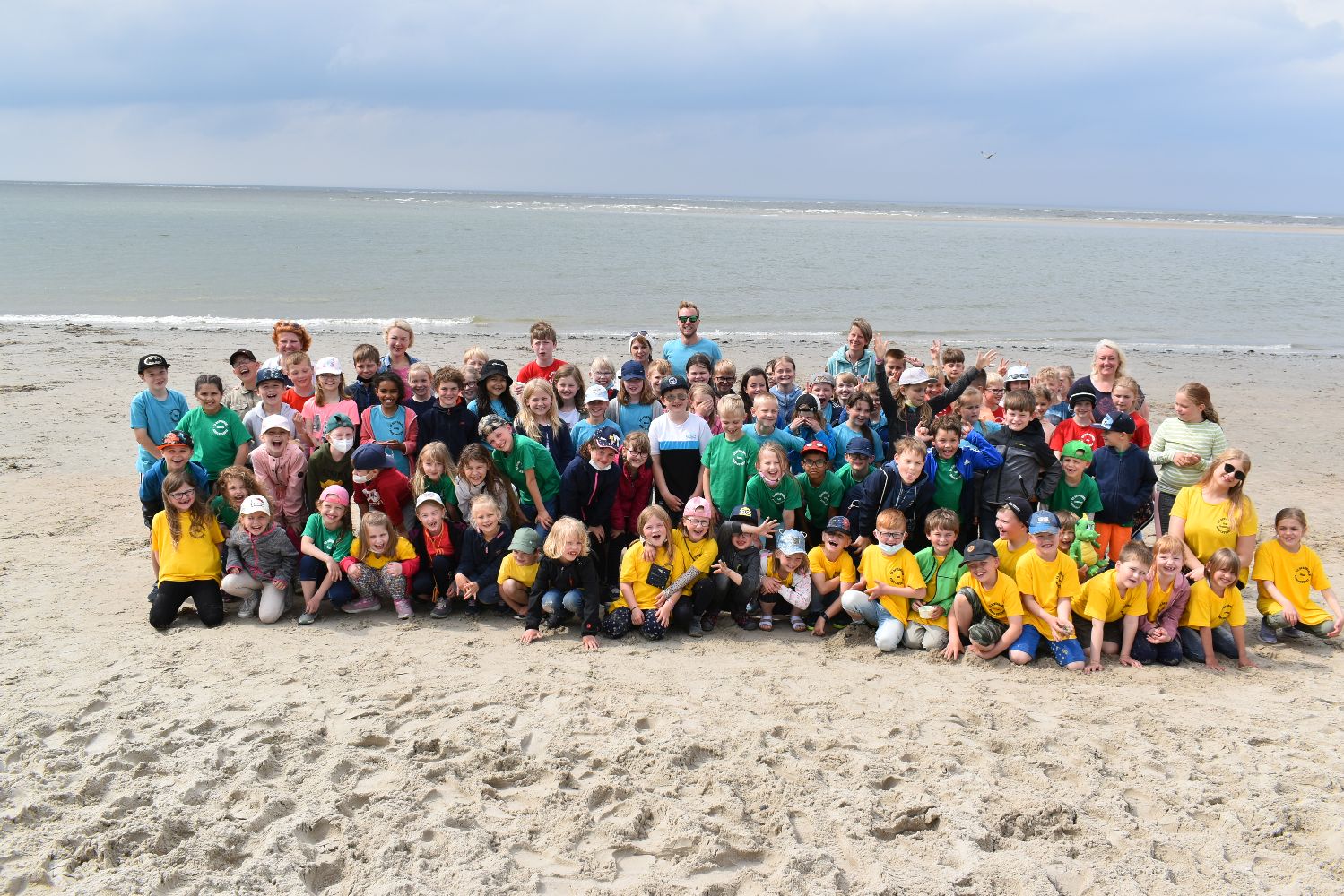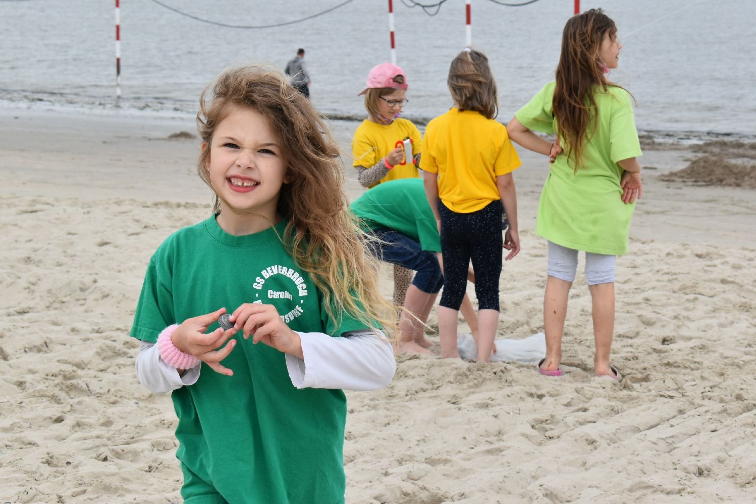 Versorgt mit reichlich Kuchen und Sandspielzeug starteten um 7.30 Uhr mit zwei Bussen in Richtung Neßmersiel. Schon die Überfahrt mit der Fähre war für viele ein aufregendes und erstmaliges Erlebnis. Auf dem Weg vom Anleger zum Strand waren unsere Schulkinder mit ihren farbigen Klassen-T-Shirts nicht zu übersehen.