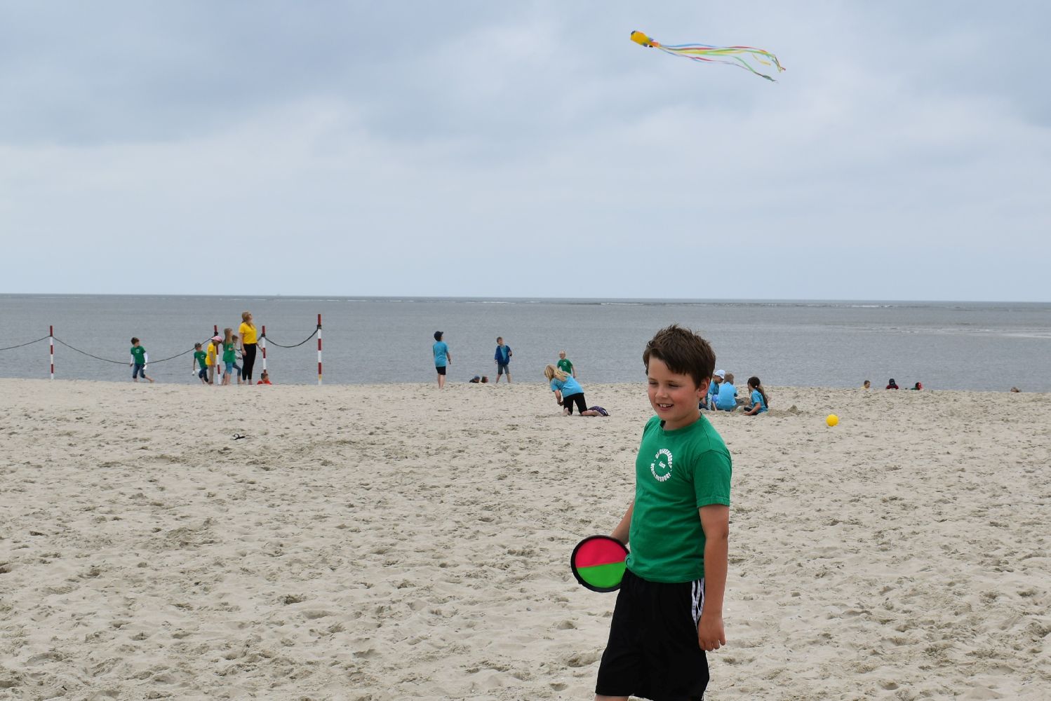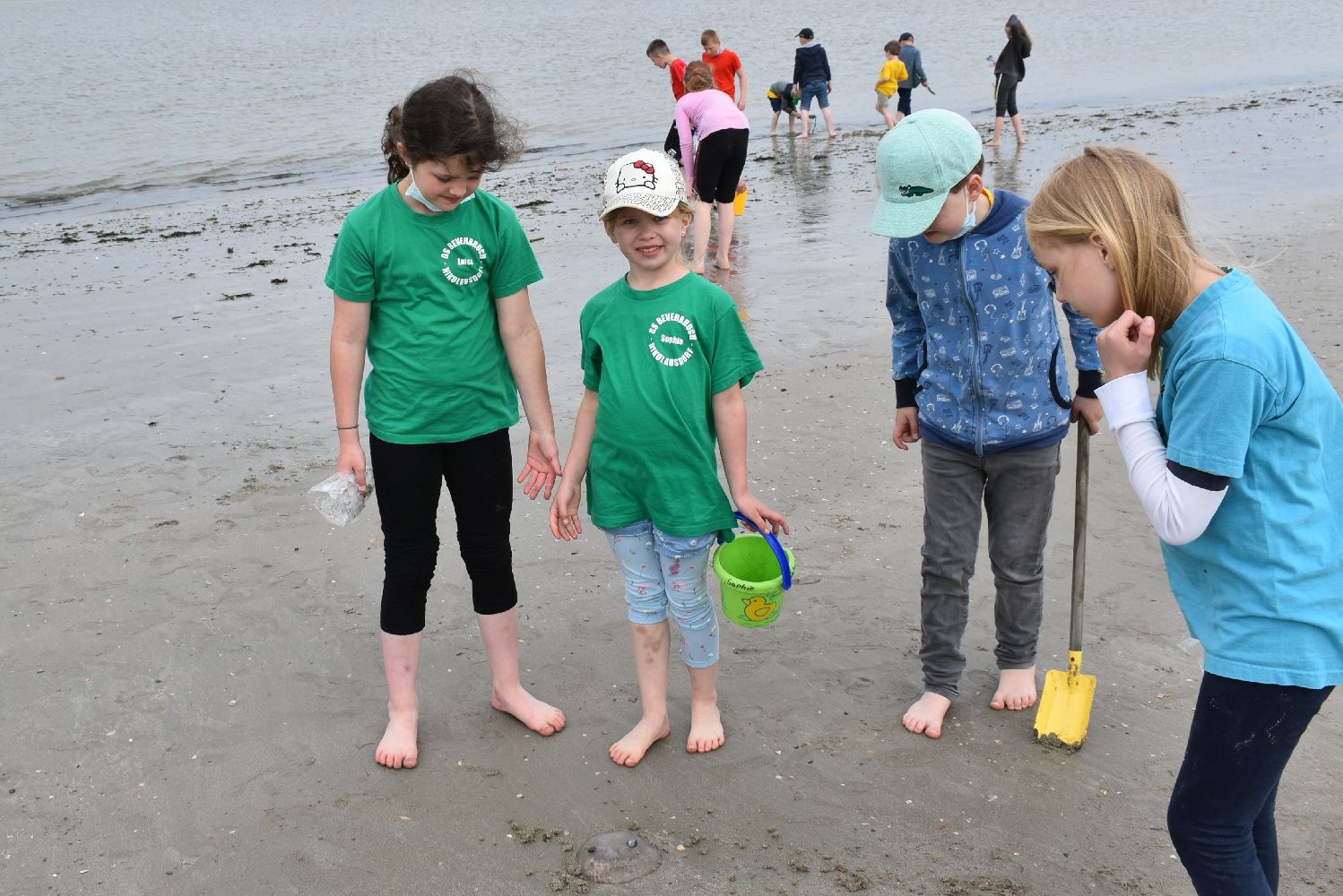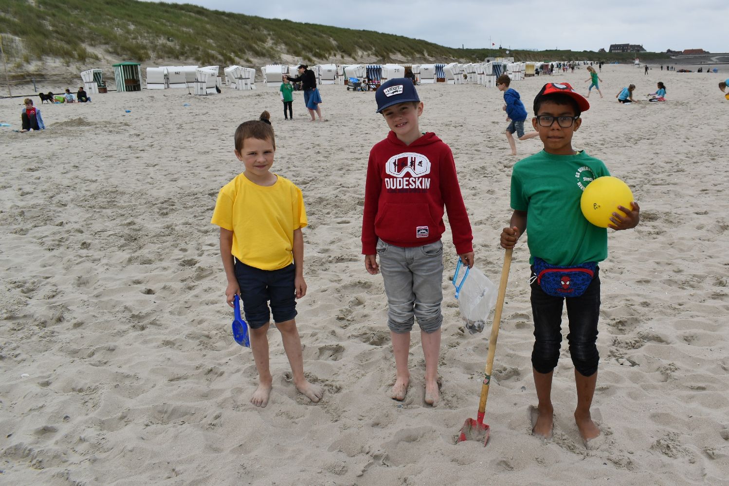 Versorgt mit reichlich Kuchen und Sandspielzeug starteten um 7.30 Uhr mit zwei Bussen in Richtung Neßmersiel. Schon die Überfahrt mit der Fähre war für viele ein aufregendes und erstmaliges Erlebnis. Auf dem Weg vom Anleger zum Strand waren unsere Schulkinder mit ihren farbigen Klassen-T-Shirts nicht zu übersehen.