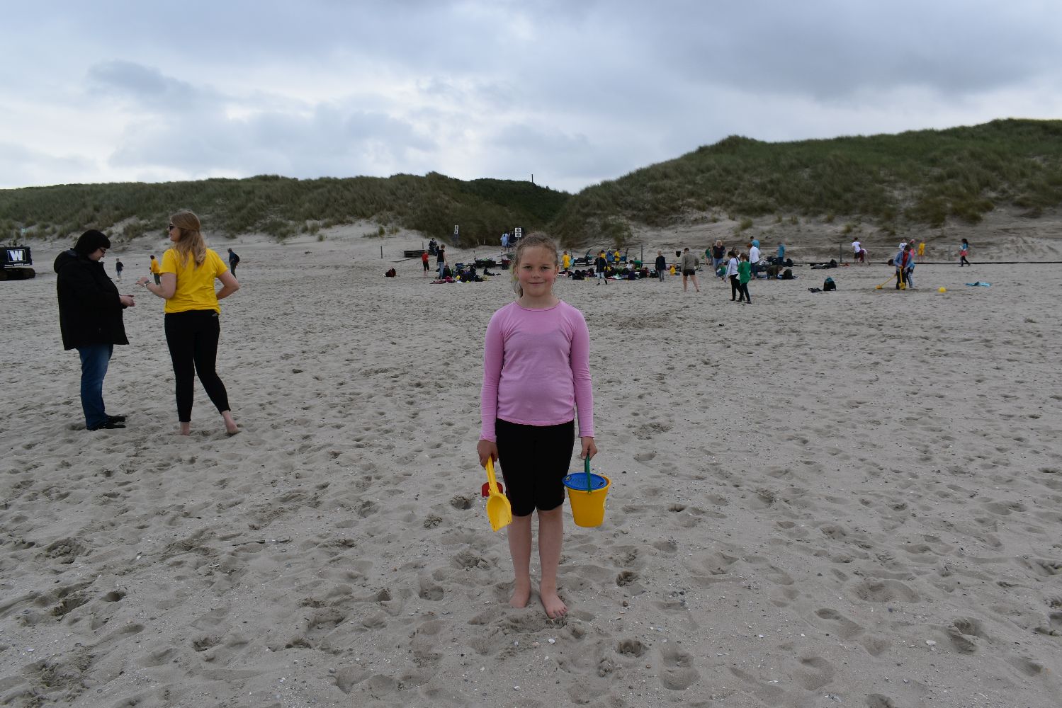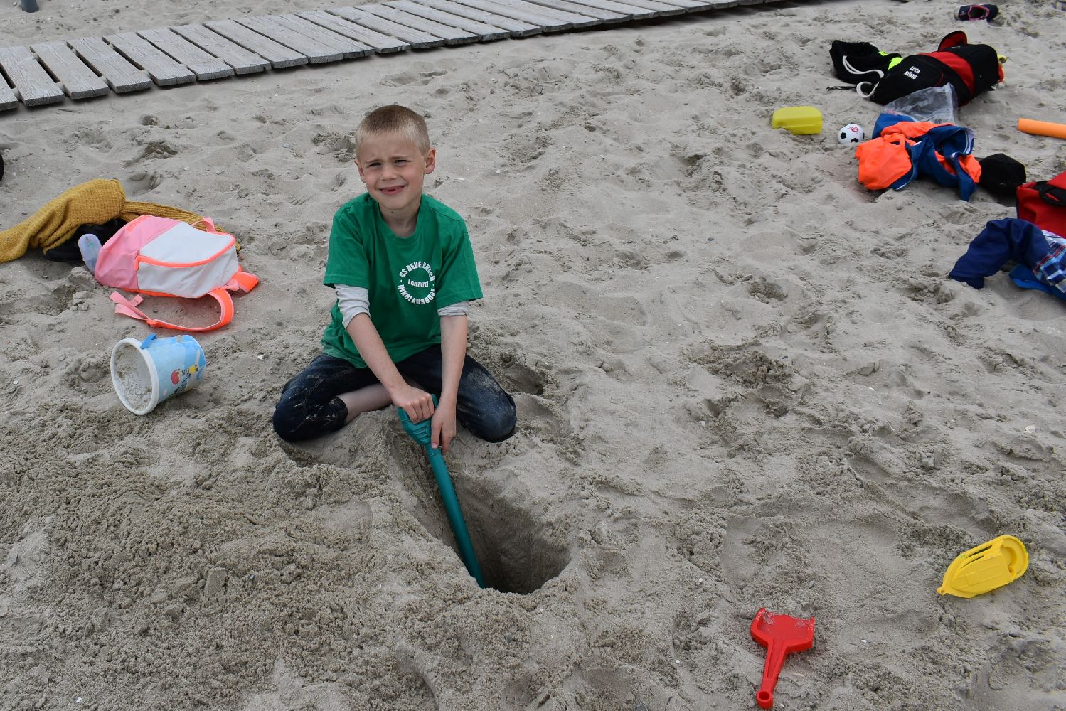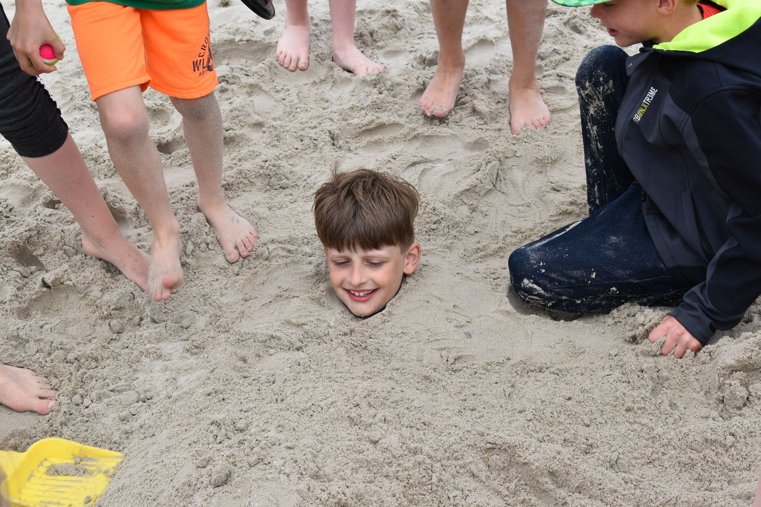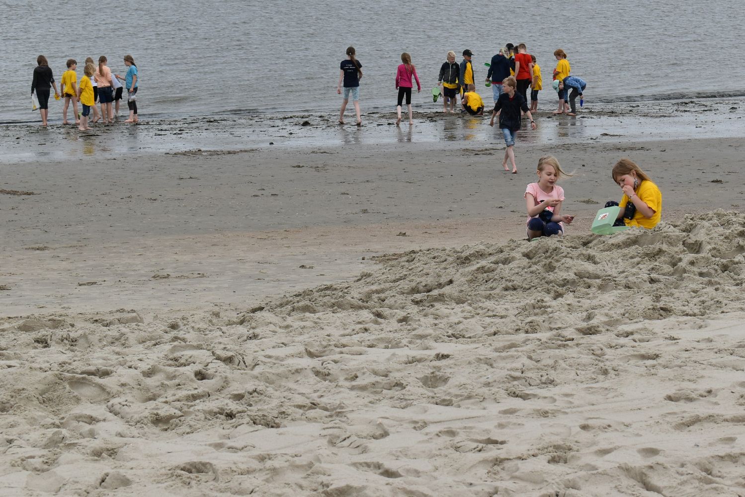 Versorgt mit reichlich Kuchen und Sandspielzeug starteten um 7.30 Uhr mit zwei Bussen in Richtung Neßmersiel. Schon die Überfahrt mit der Fähre war für viele ein aufregendes und erstmaliges Erlebnis. Auf dem Weg vom Anleger zum Strand waren unsere Schulkinder mit ihren farbigen Klassen-T-Shirts nicht zu übersehen.