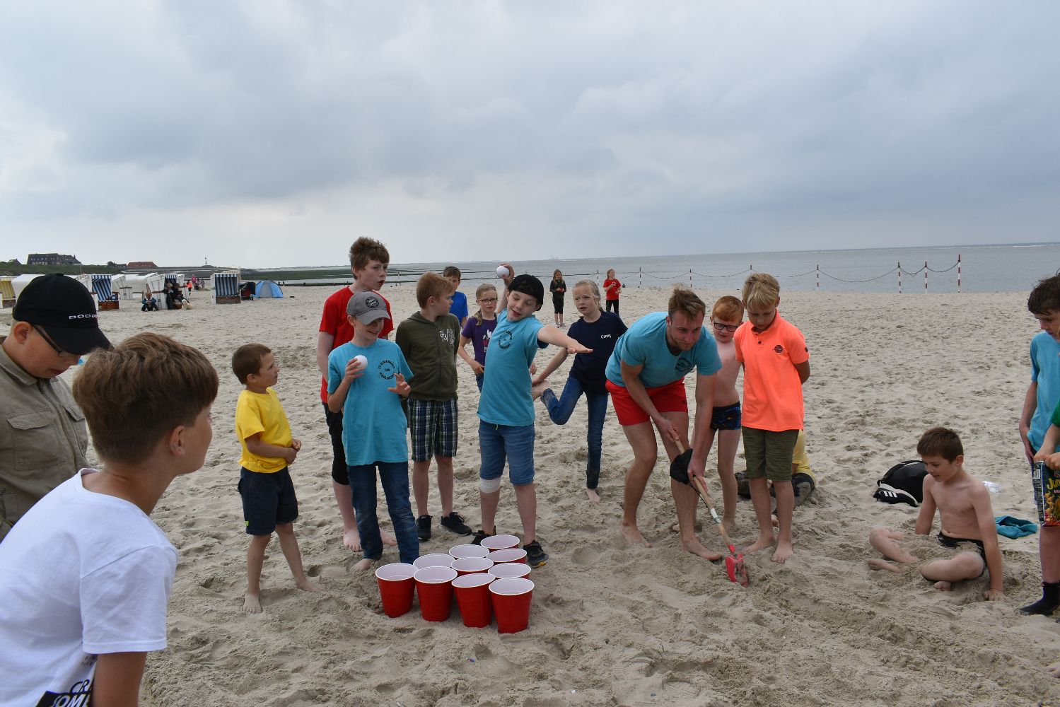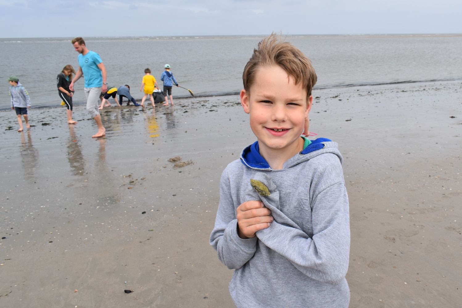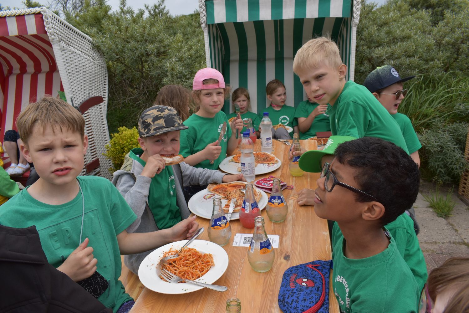 Auch das Wetter spielte recht gut mit. Zwar fehlte zumeist die Sonne, aber es war fast immer trocken, die Temperatur war angenehm und der Wind nur mäßig. So konnten die Kinder am Strand viele Stunden buddeln und spielen, im flachen Wasser toben, Muscheln suchen und Quallen und Strandkrabben beobachten. Viele Kinder trauten sich auch unter Aufsicht ins Meer und hatten ihren Spaß. Für ein gemeinsames Mittagessen im “Strandcafe“, das von unserem Förderverein gesponsert wurde, war im Vorfeld gesorgt und die frische Seeluft machte Appetit. Der Inseltag verging wie im Flug und um 17.00 Uhr legte die Fähre mit uns an Bord wieder ab in Richtung Festland. Sicher wird dieser Tag als ein besonderes Highlight im Gedächtnis der Kinder bleiben.